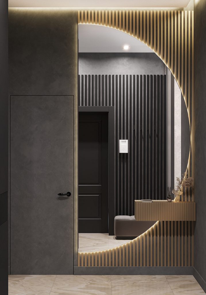 Даже самую неудачную планировку прихожей можно исправить с помощью света и зеркал. Многоуровневое освещение вдоль стен визуально «раздвигает» узкое пространство, наполняя его светом. Крупное зеркало, особенно напротив источника света или в конце коридора, создаёт оптическую иллюзию глубины и простора, моментально преображая тесный холл.