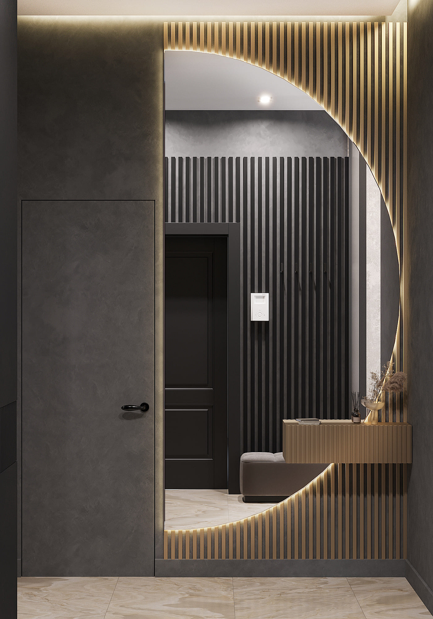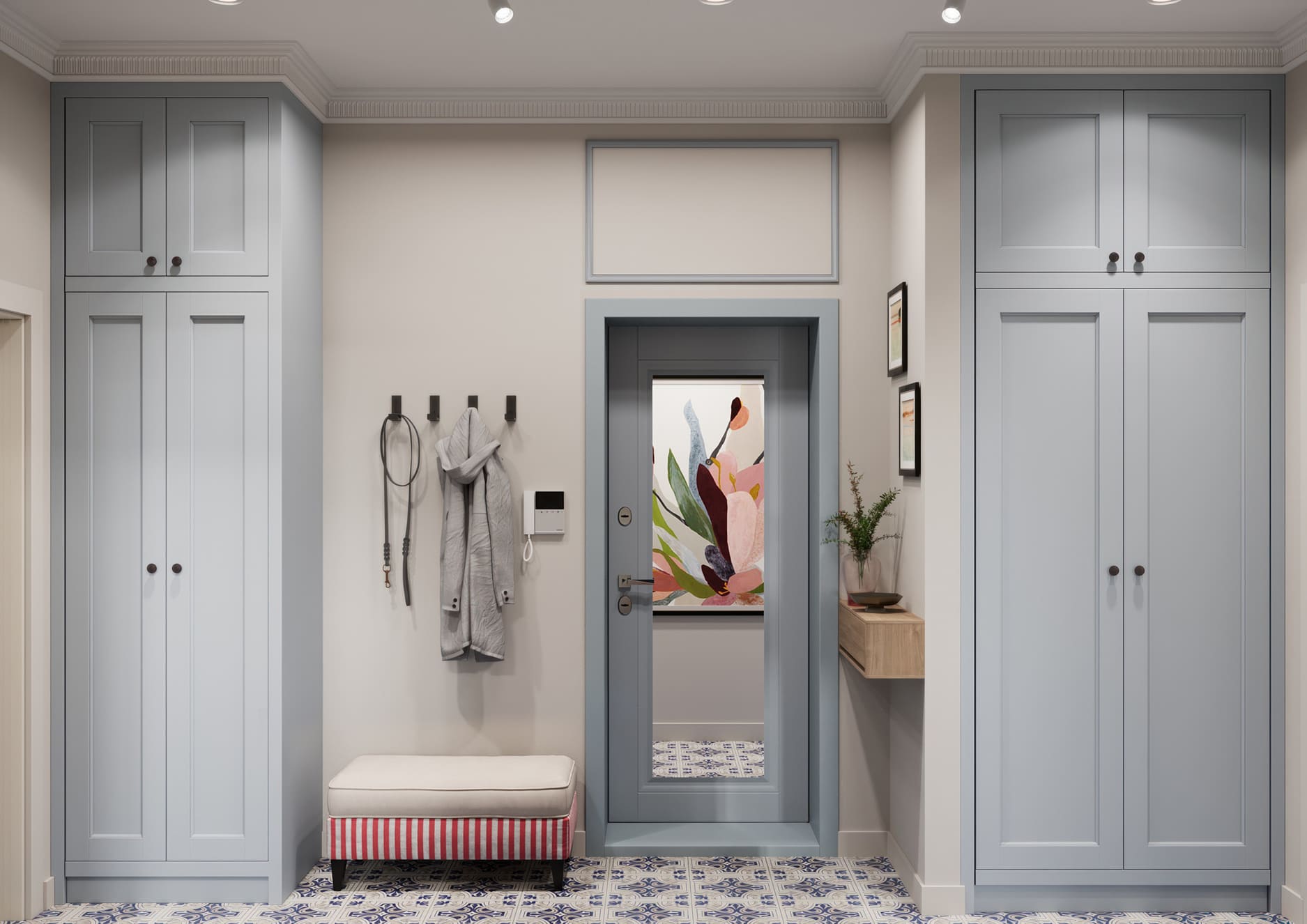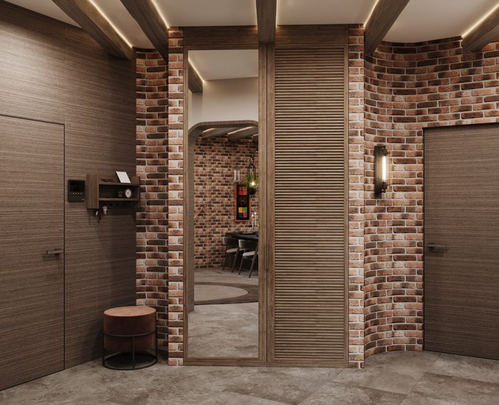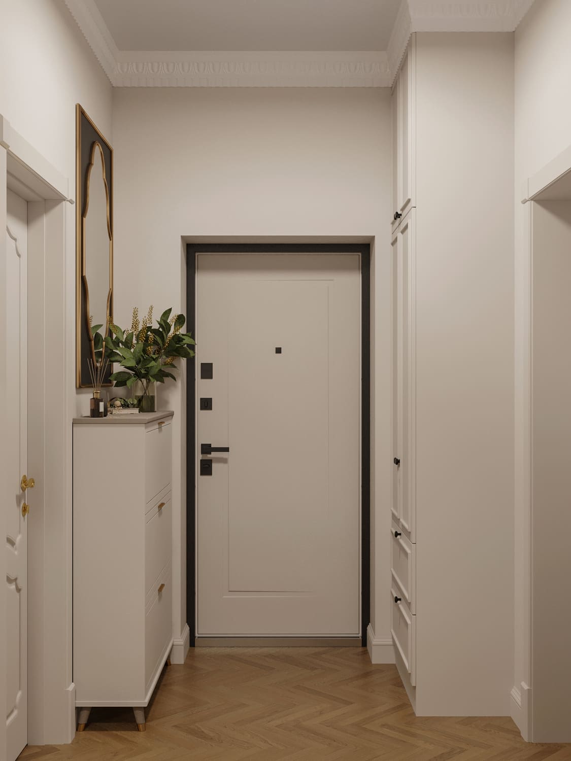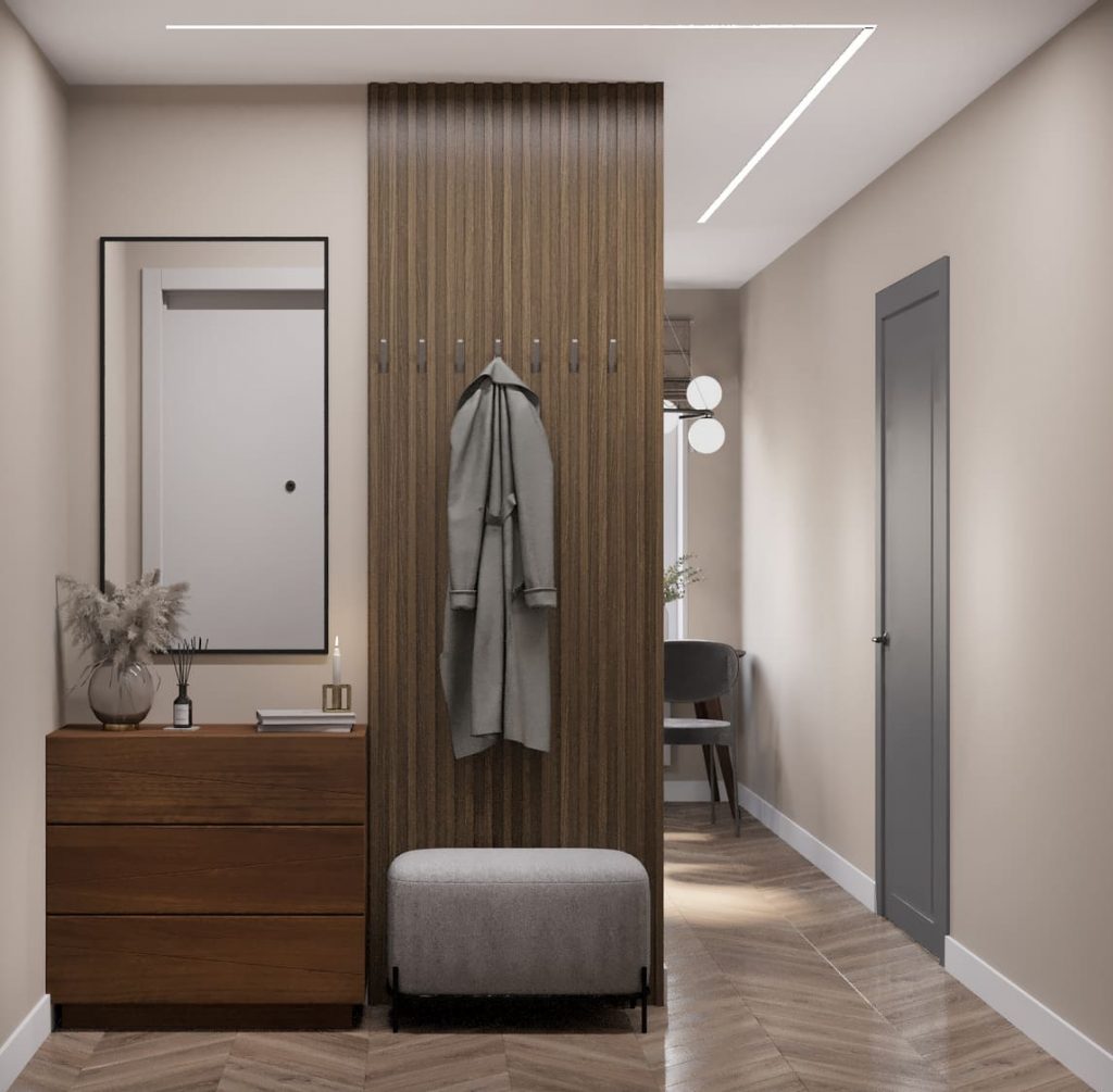 Организация коридора и прихожей начинается с двери, вписанной в стиль, и компактного хранения: узкие консоли, настенные крючки, шкаф-купе до потолка. Главное — не перегрузить проход, оставив воздух и вертикальные линии.