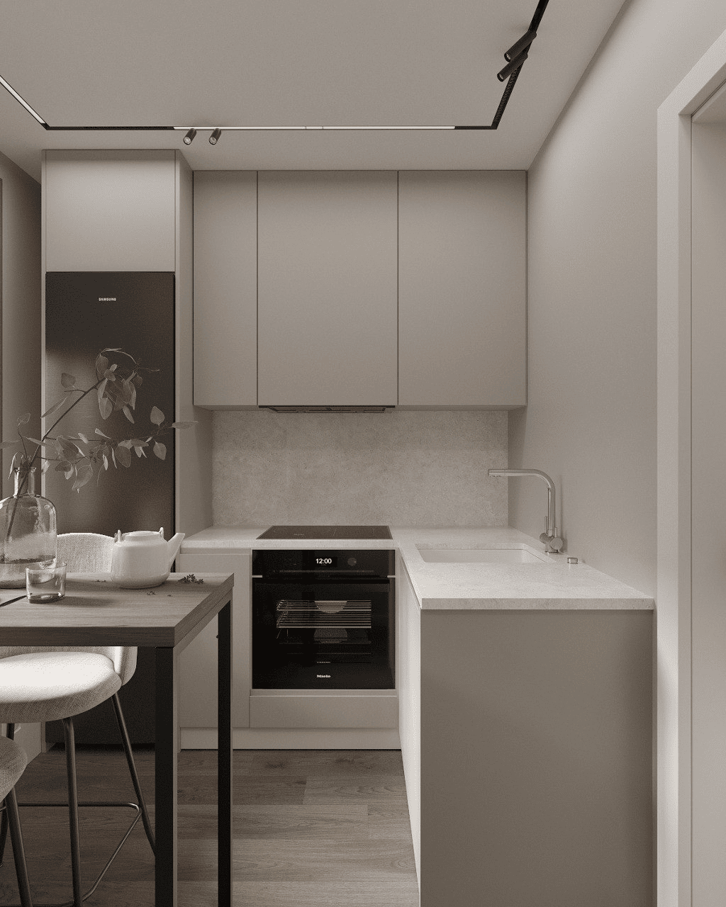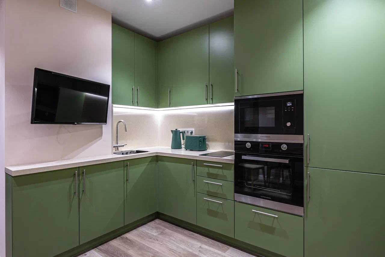✔ Техника встраивается в ниши, шкафы до потолка — так задействуется каждая вертикальная поверхность;