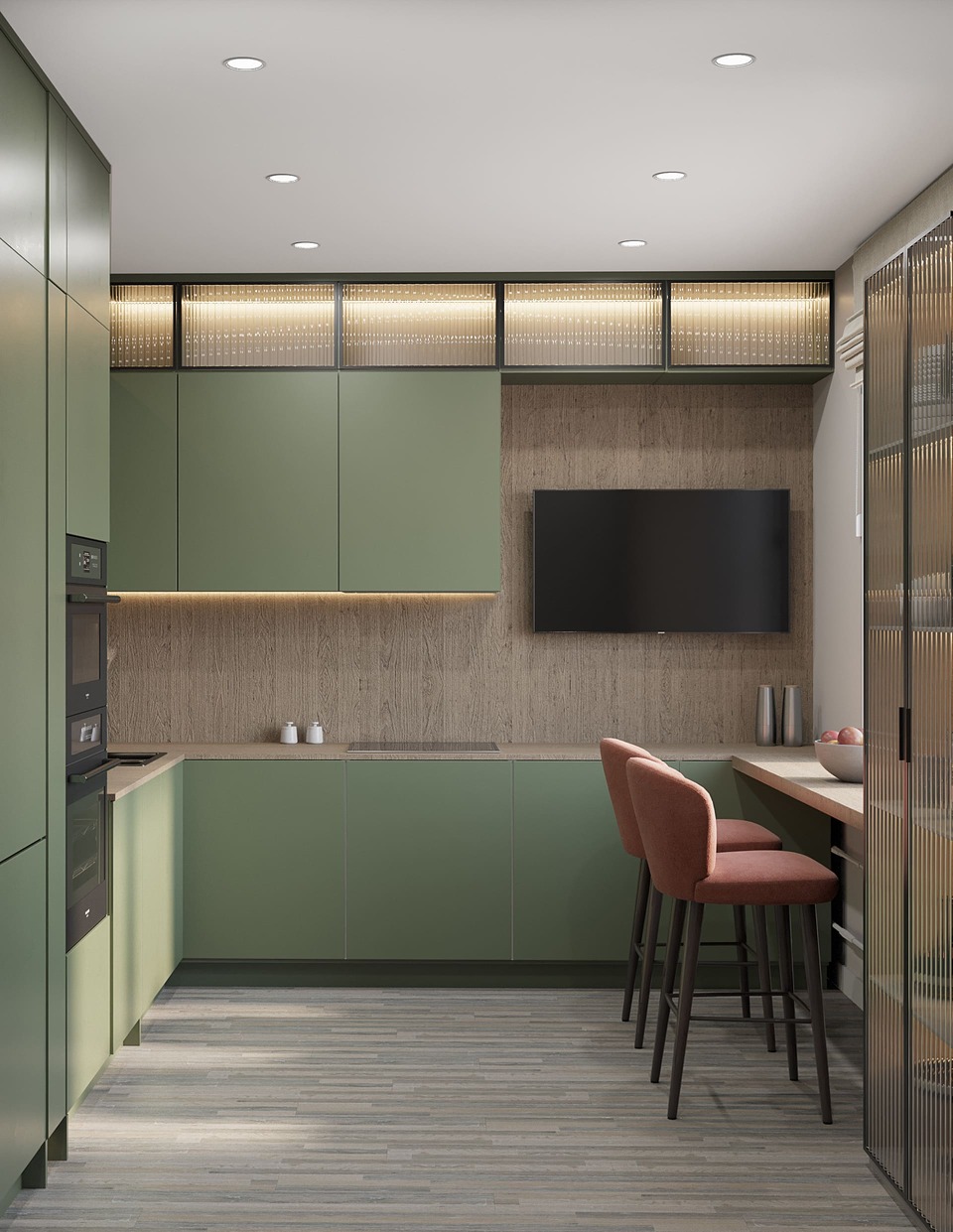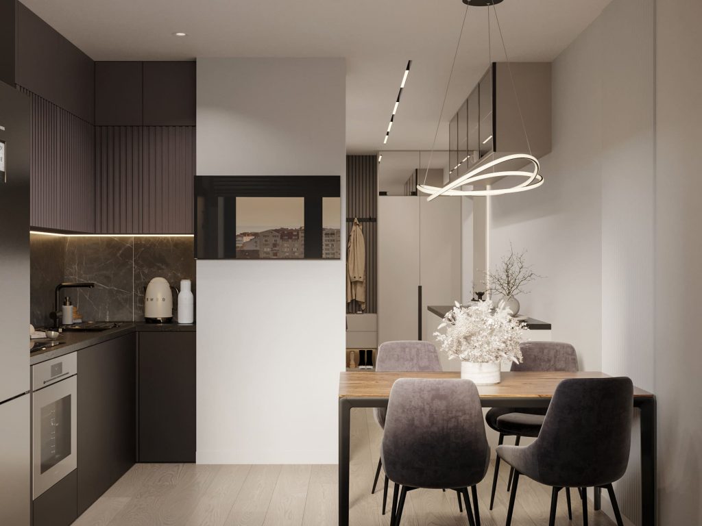 ✔ Многоуровневое освещение: общий свет плюс подсветка рабочих зон делает кухню более объёмной;
