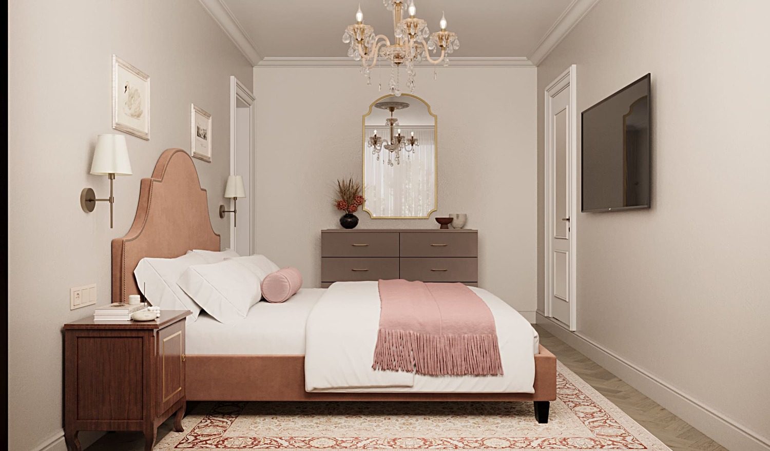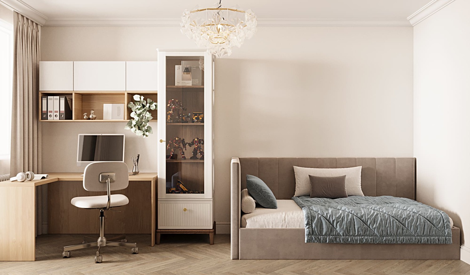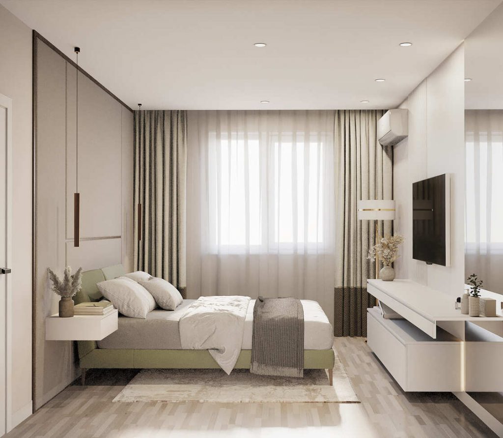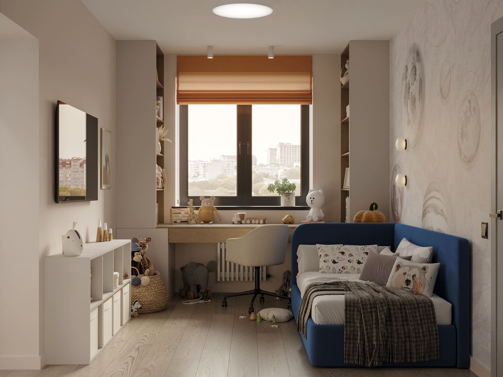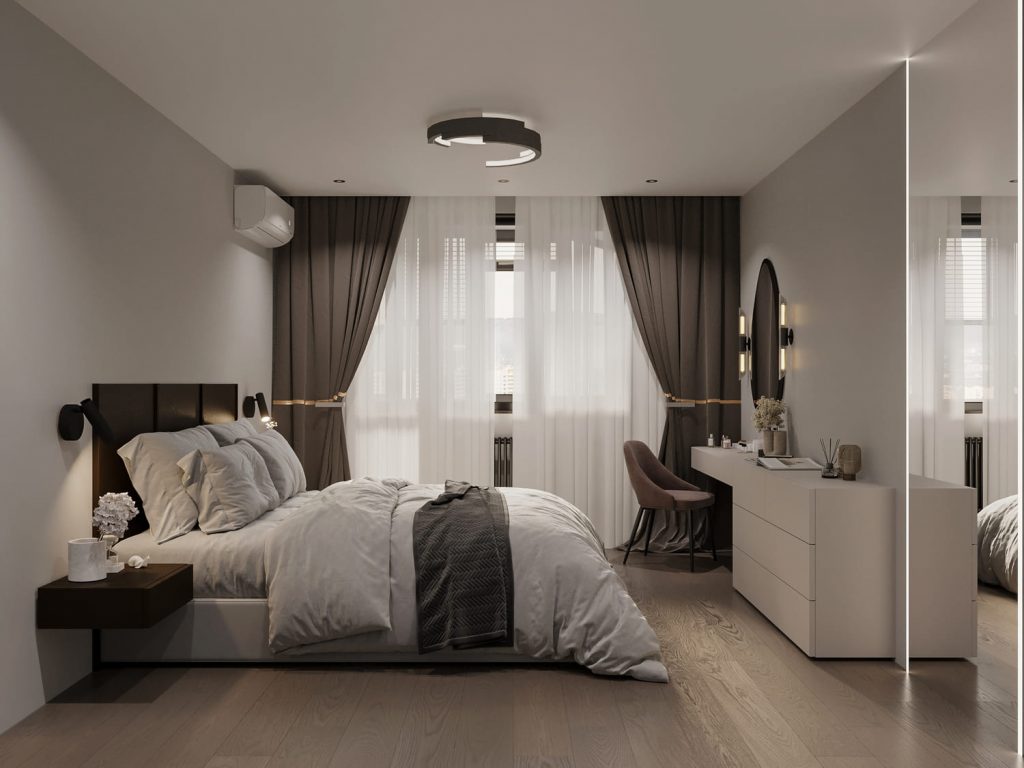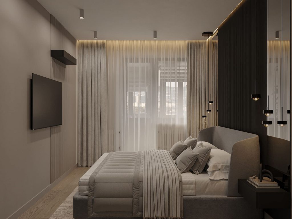 🔹 В спальнях можно организовать гардеробную вдоль стены или за изголовьем кровати — вещи не занимают полезную площадь, но всегда под рукой