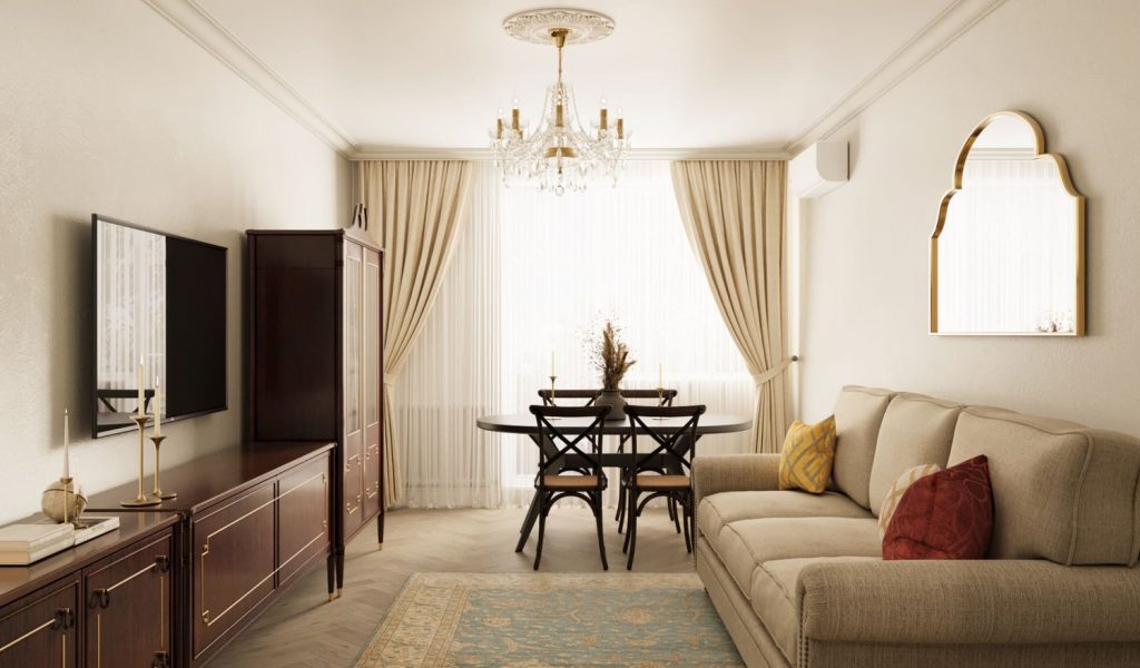 Диван вдоль стены или спиной к проходу создаёт защищённый уголок даже в транзитной комнате. Ковёр и торшер визуально обозначают границы гостиной, а лёгкий стеллаж деликатно отделяет зоны, не перекрывая свет. Главное — не загромождать проходы. Если нужно спальное место, выбирайте диван-кровать или раскладное кресло. Так комната остаётся общей, но в ней появляется уютный уголок для отдыха.