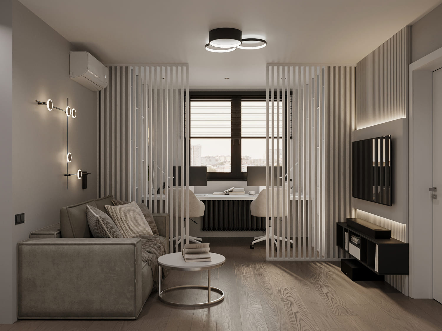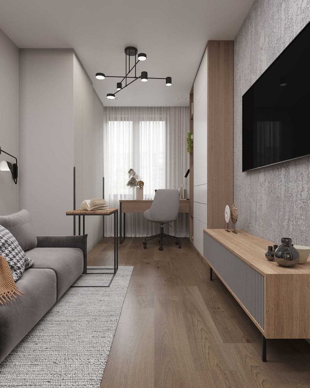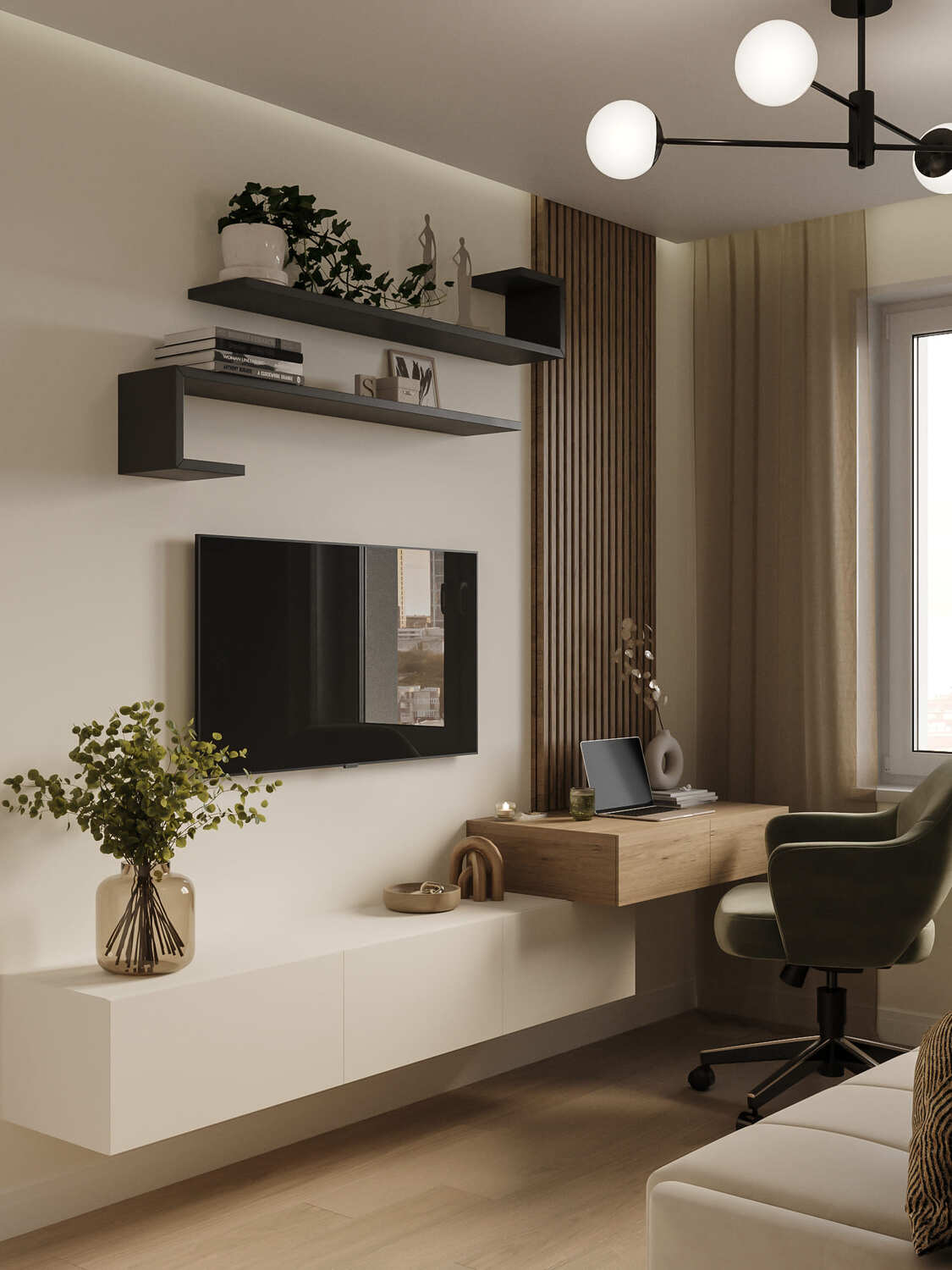 ◾️ Цвет: светлая отделка стен и потолка добавляет воздуха, а вертикальные акценты визуально приподнимают потолок.