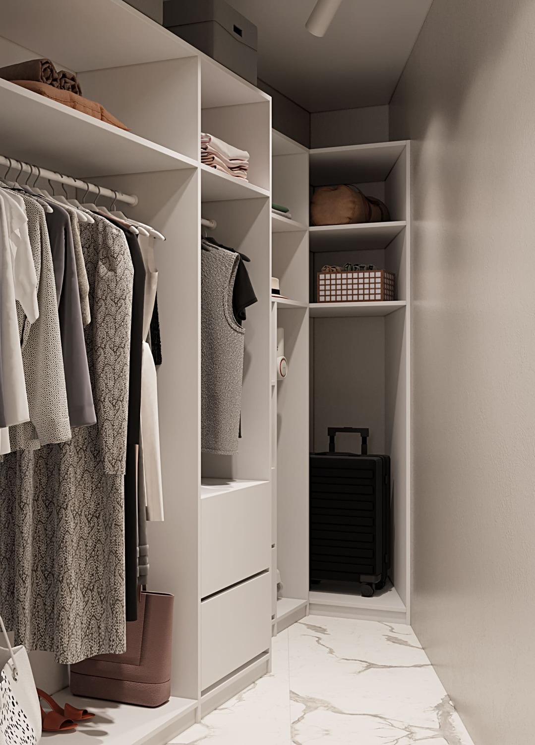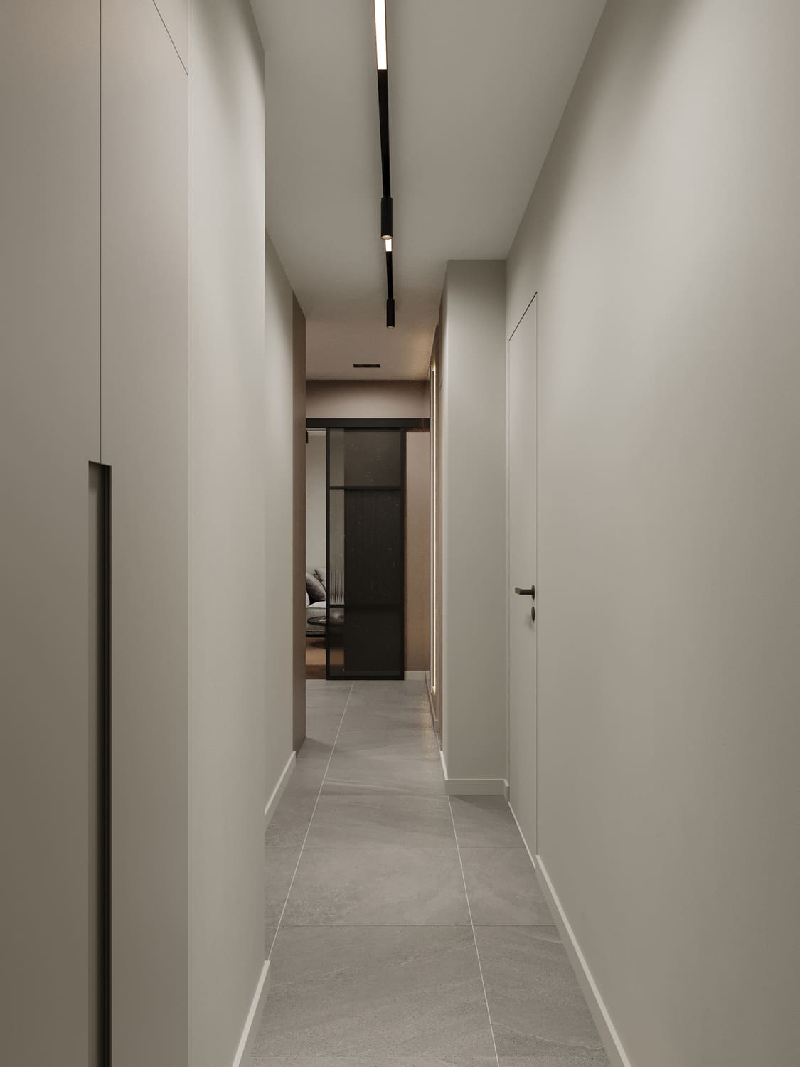 ◾️ Встроенное хранение: узкие шкафы в нишах решают проблему с местом и не мешают проходу.