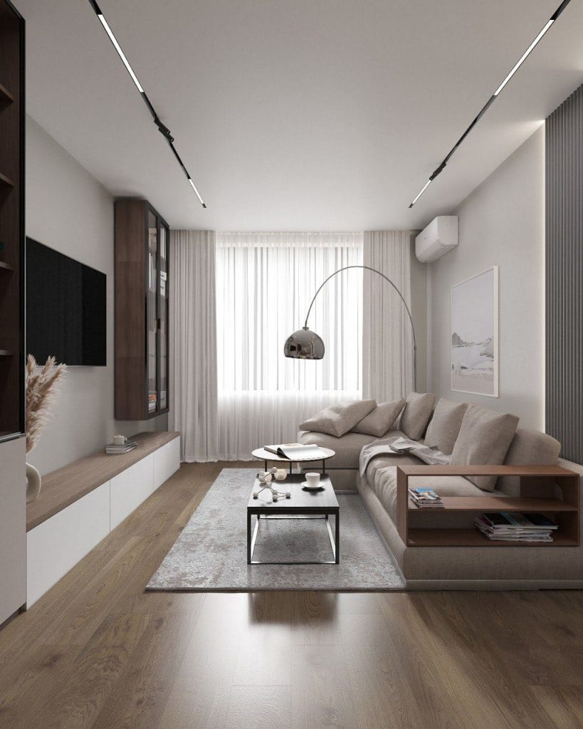 Через общую комнату часто идут в спальни, и это мешает сделать её полноценным местом для отдыха. Необходимо продумать расстановку мебели так, чтобы выделить зону дивана и телевизора, не перекрывая проход.