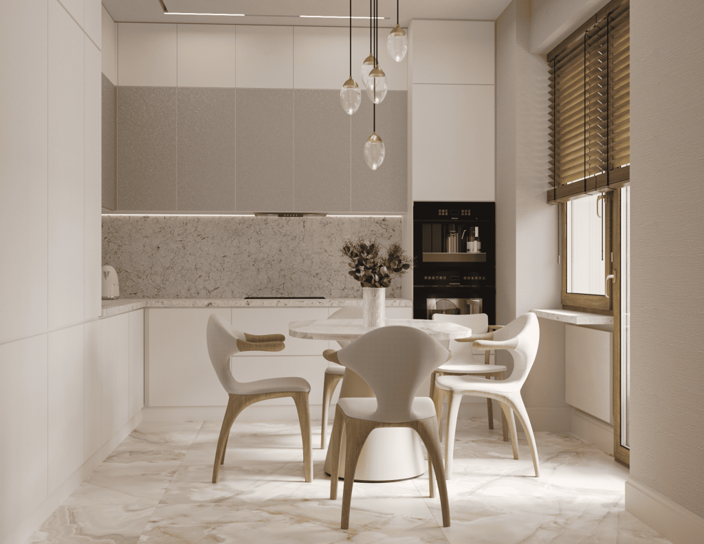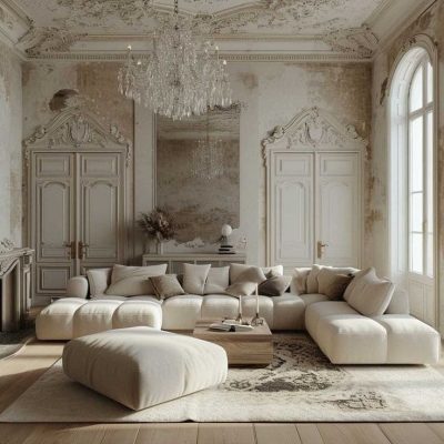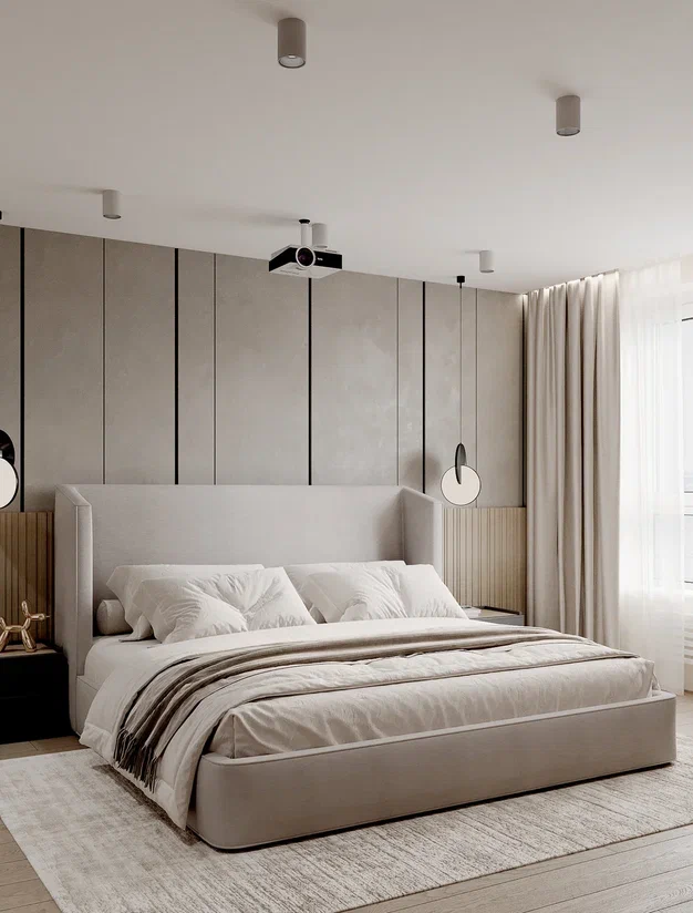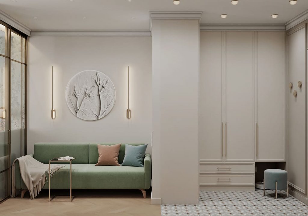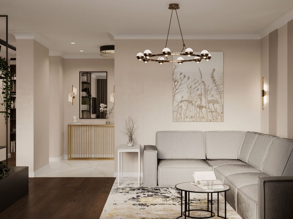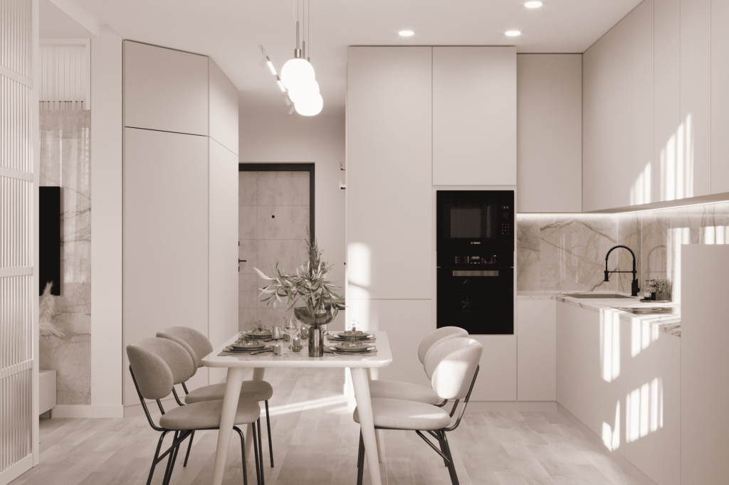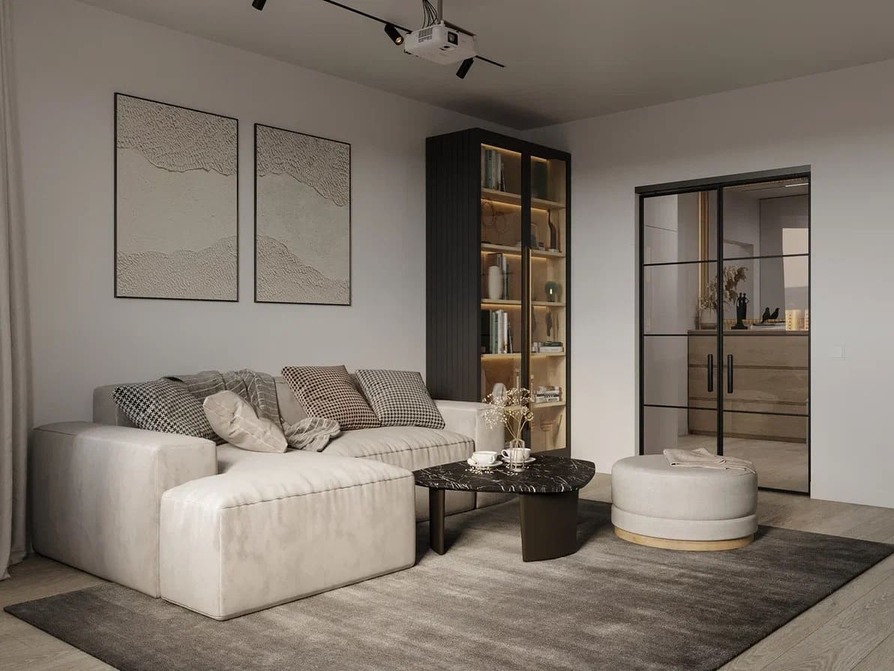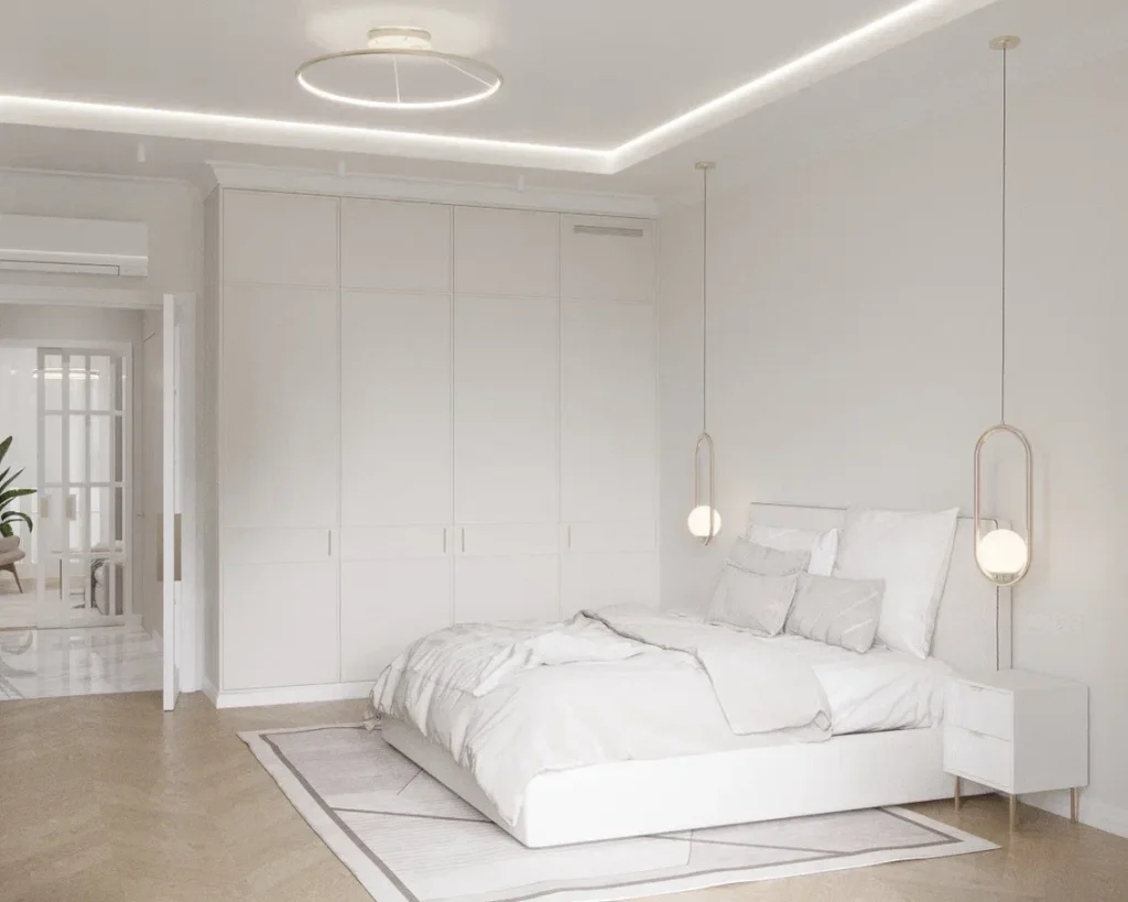 Равномерное освещение с мягким теплым или нейтральным белым светом усиливает ощущение простора. Встроенные или потолочные светильники создают общий фон, а бра, торшеры и подсветка мебели добавляют глубины и акцентов. Светлые поверхности хорошо отражают свет, поэтому зеркала и стеклянные элементы усиливают эффект. Точечные светильники или светодиодные ленты вдоль стен создают мягкое свечение, подчеркивая легкость интерьера. Лучше избегать слишком холодного света, чтобы интерьер не выглядел стерильным, а вместо этого выбирать теплые оттенки для уюта.