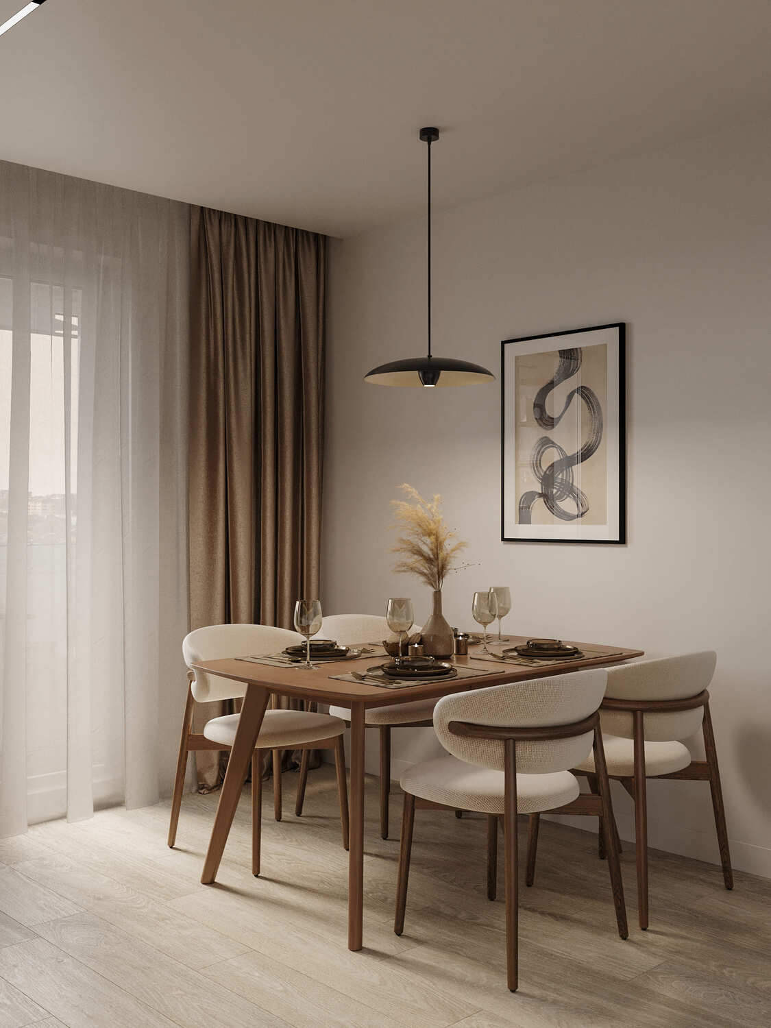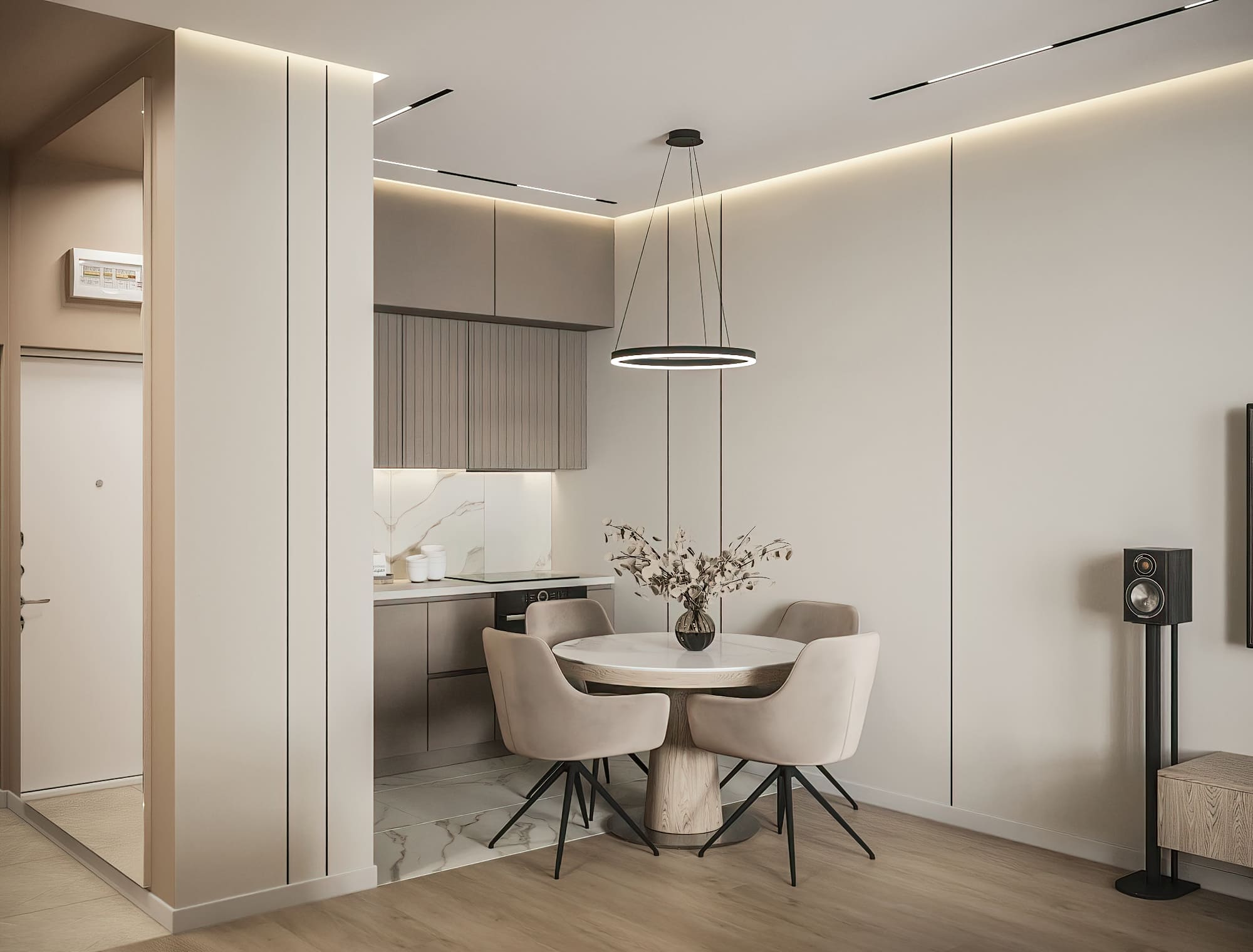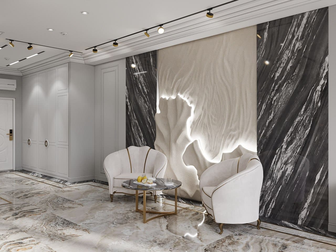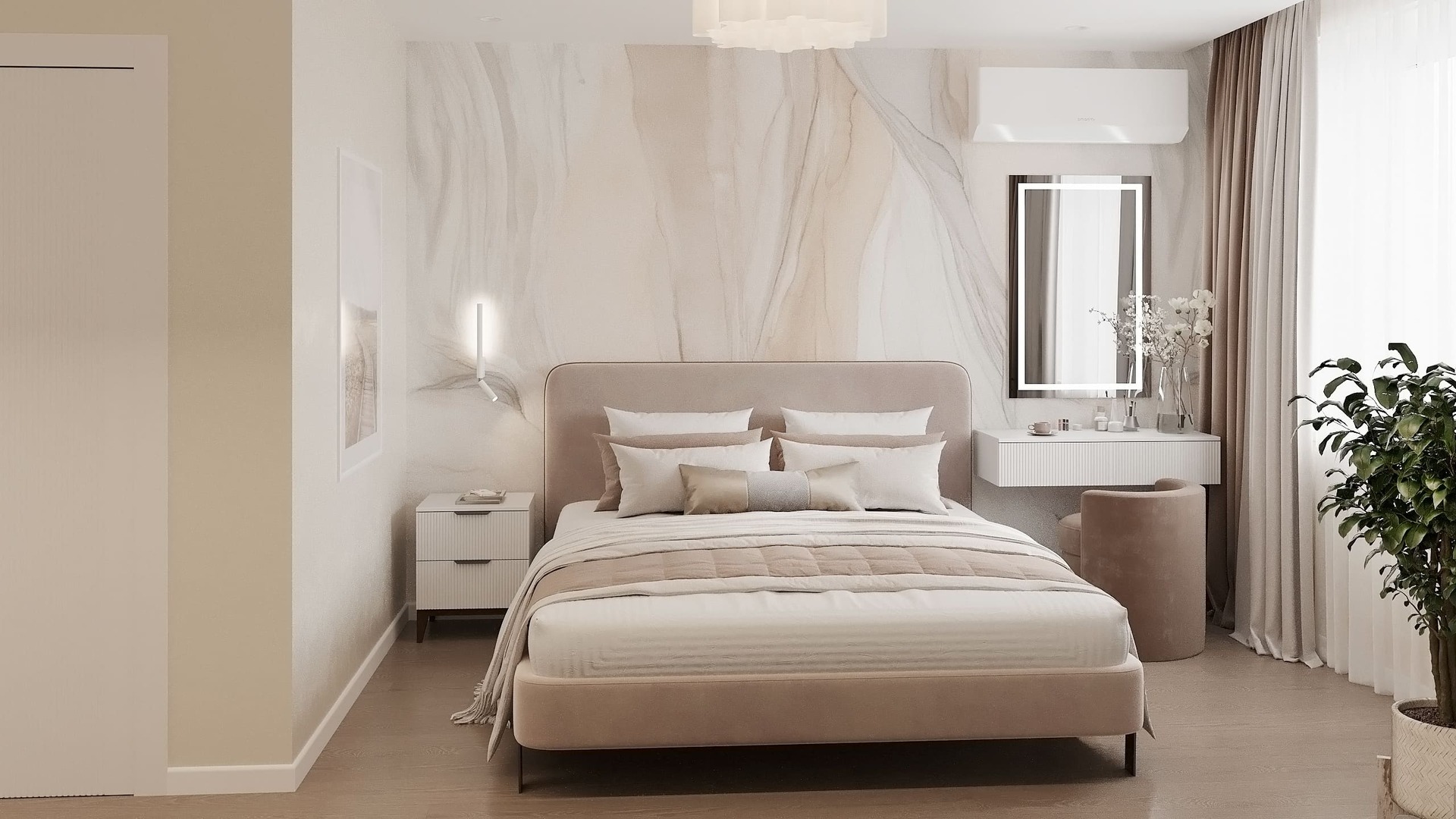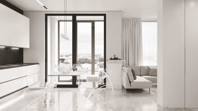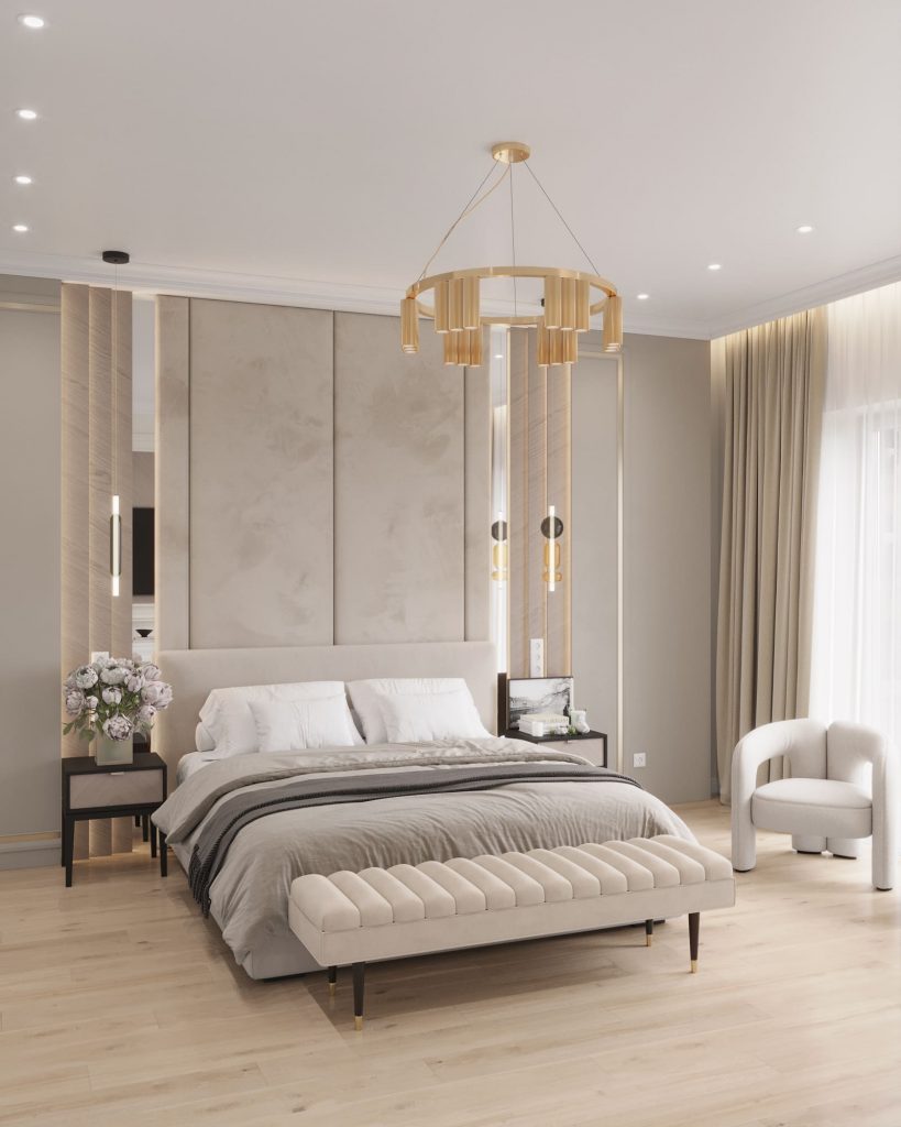 Равномерное освещение с мягким теплым или нейтральным белым светом усиливает ощущение простора. Встроенные или потолочные светильники создают общий фон, а бра, торшеры и подсветка мебели добавляют глубины и акцентов. Светлые поверхности хорошо отражают свет, поэтому зеркала и стеклянные элементы усиливают эффект. Точечные светильники или светодиодные ленты вдоль стен создают мягкое свечение, подчеркивая легкость интерьера. Лучше избегать слишком холодного света, чтобы интерьер не выглядел стерильным, а вместо этого выбирать теплые оттенки для уюта.
