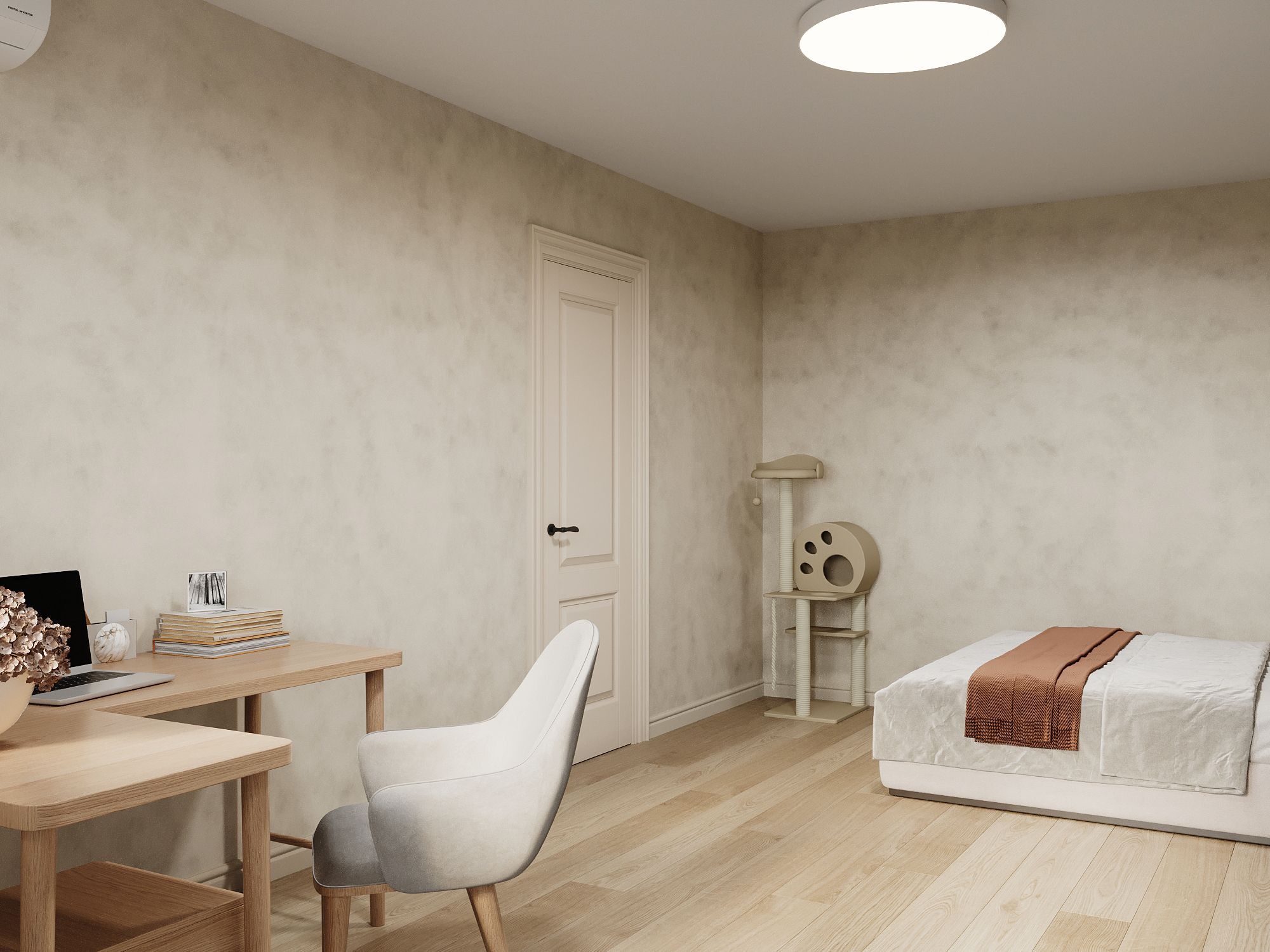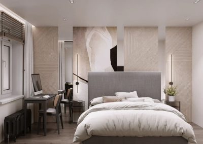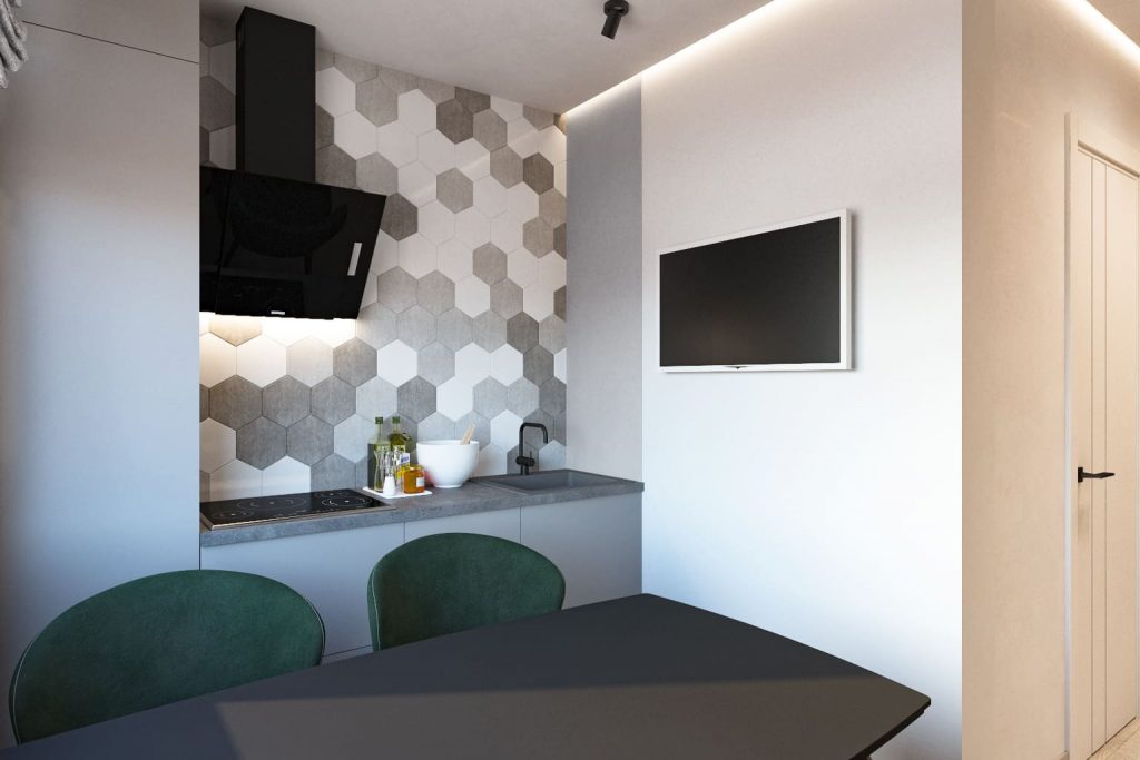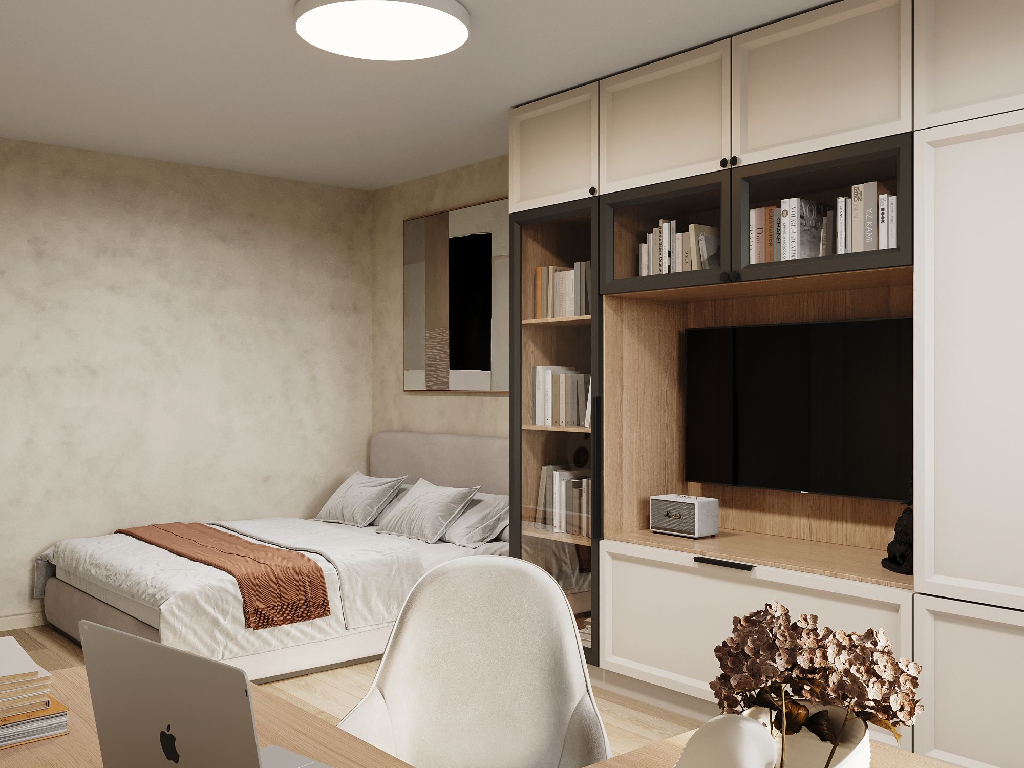 Решили, что личный комфорт важнее, чем редкие застолья. Так комната стала спальней: удобная кровать с мягкой спинкой, у окна — рабочий стол и кресло для отдыха. Напротив — большой шкаф, частично закрытый, частично открытый для декора. В углу около кровати поставили кошачий домик — чтобы у кота было своё место, а у мебели — шанс выжить. Кухонный гарнитур собрали углом — так и просторнее, и всё необходимое поместилось. Заказчики хотели оставить возможность делать различные перестановки в комнате, поэтому было решено отказаться от перегородок.