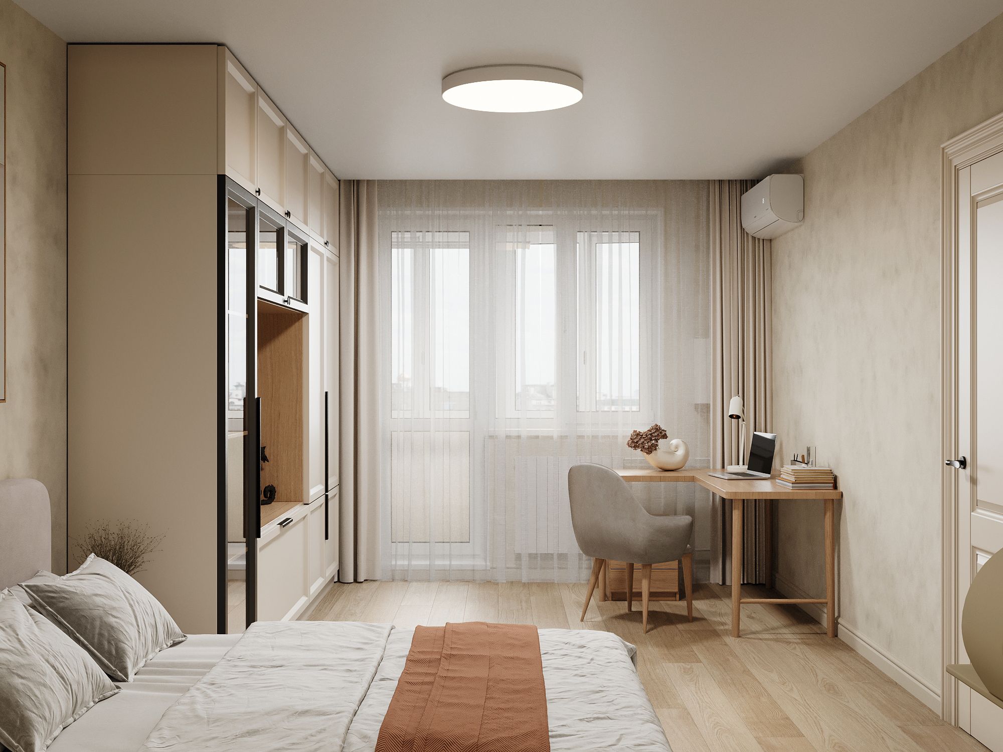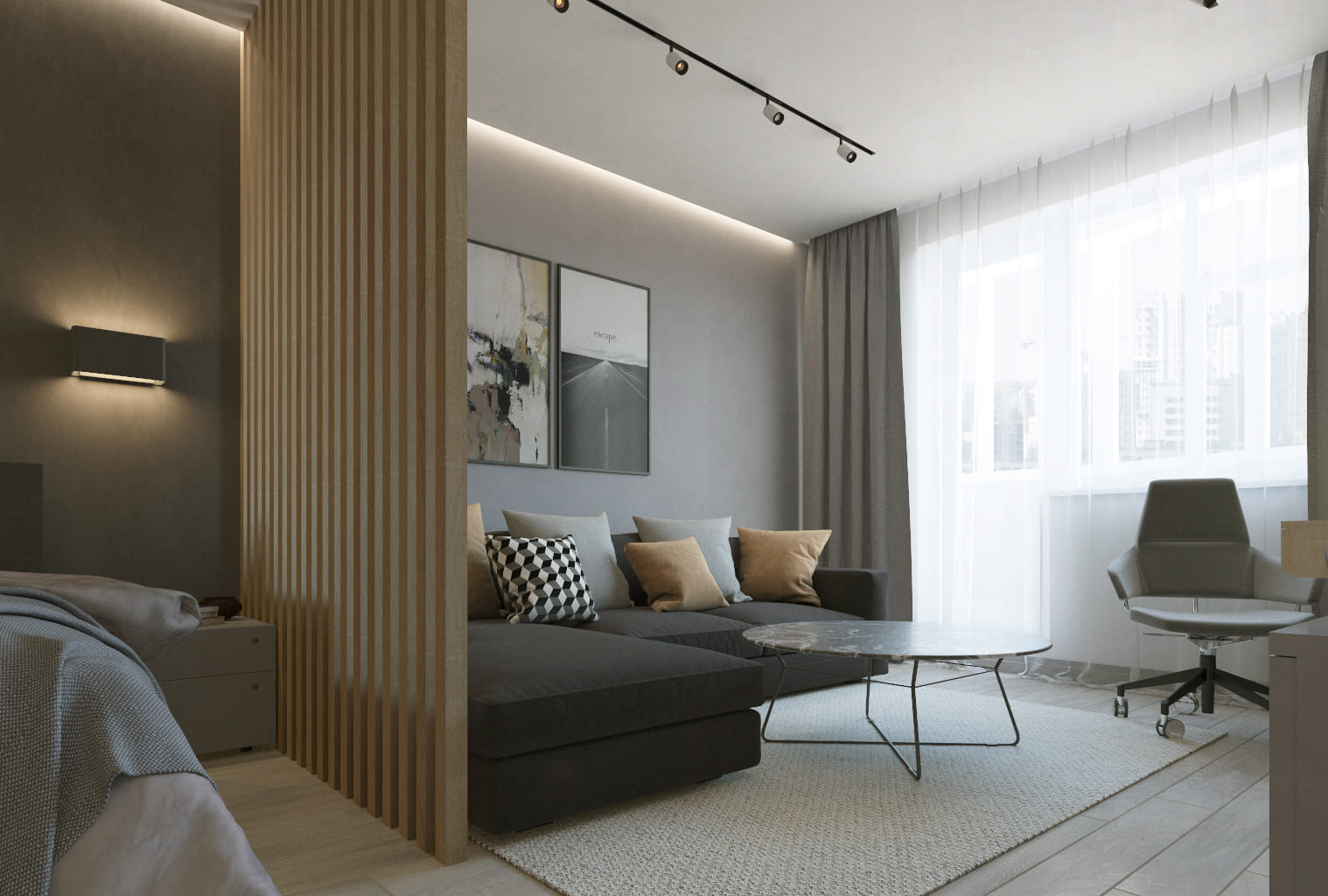 — Используйте легкую перегородку (стекло, рейки, раздвижка), чтобы отделить спальню;