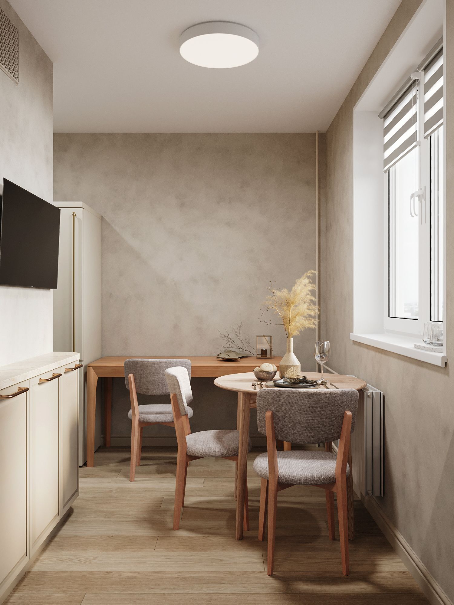 — Холодильник можно вынести в прихожую, освободив на кухне место для нормального стола;