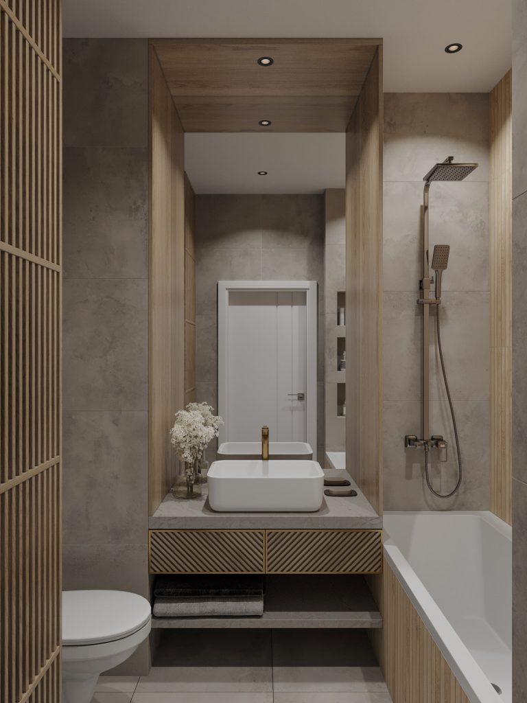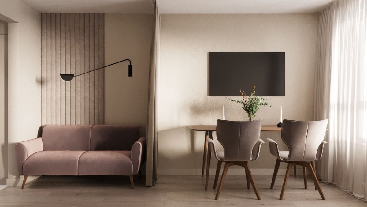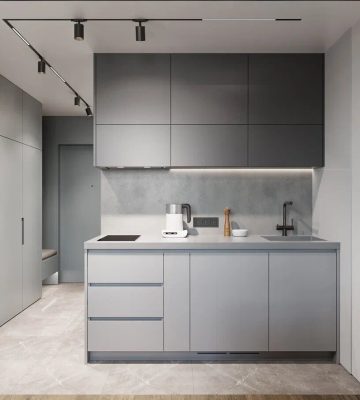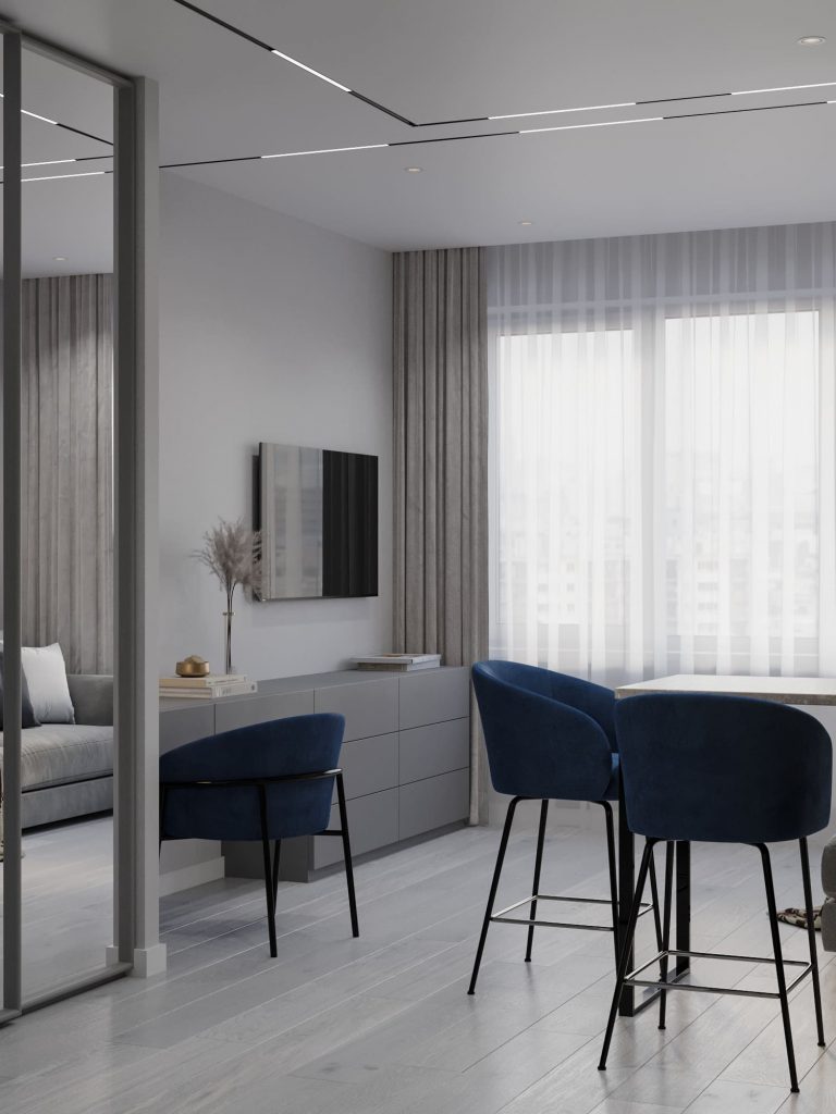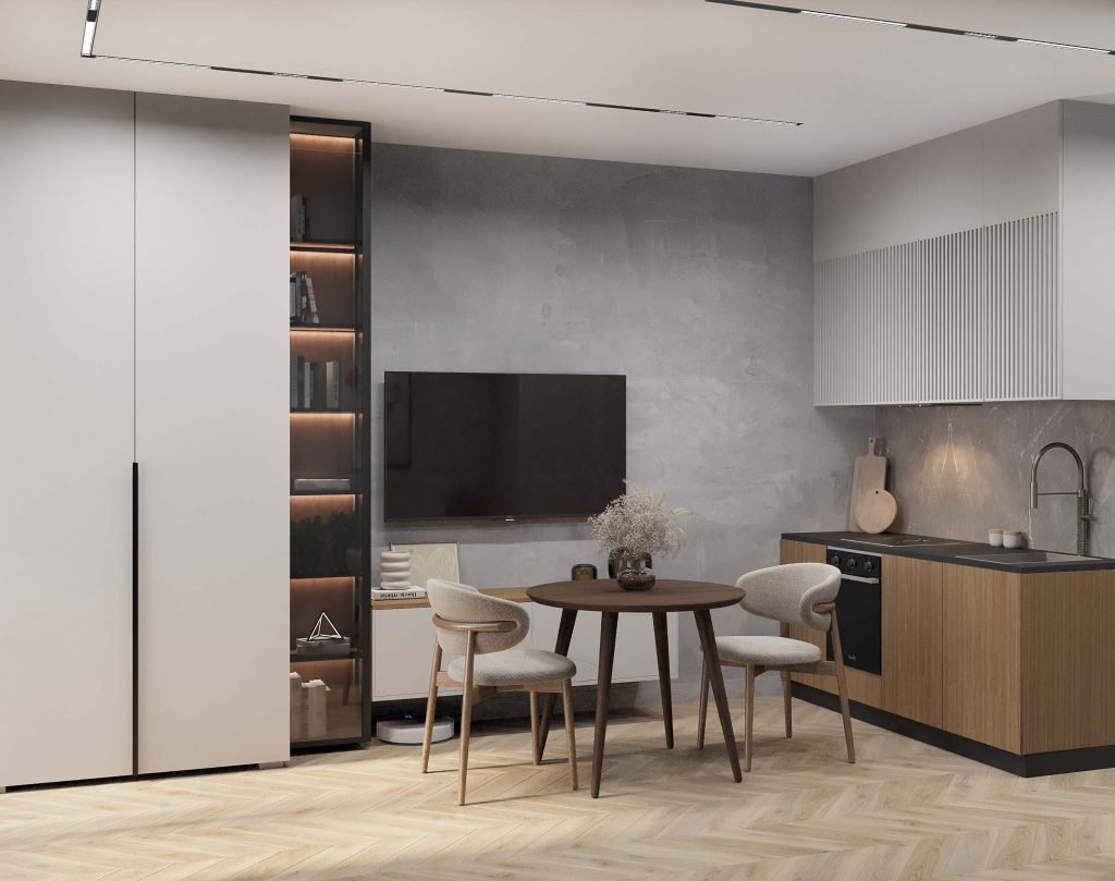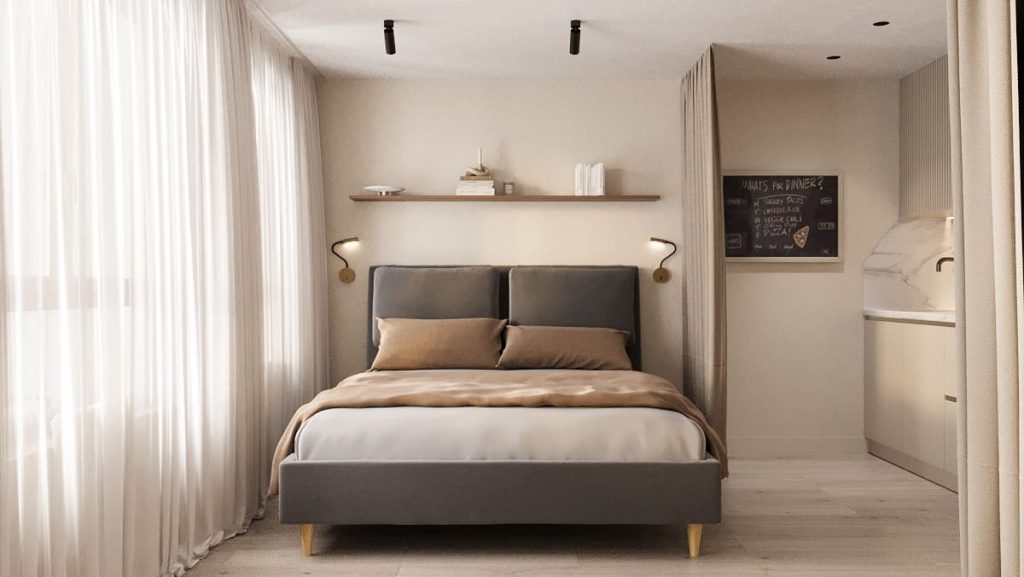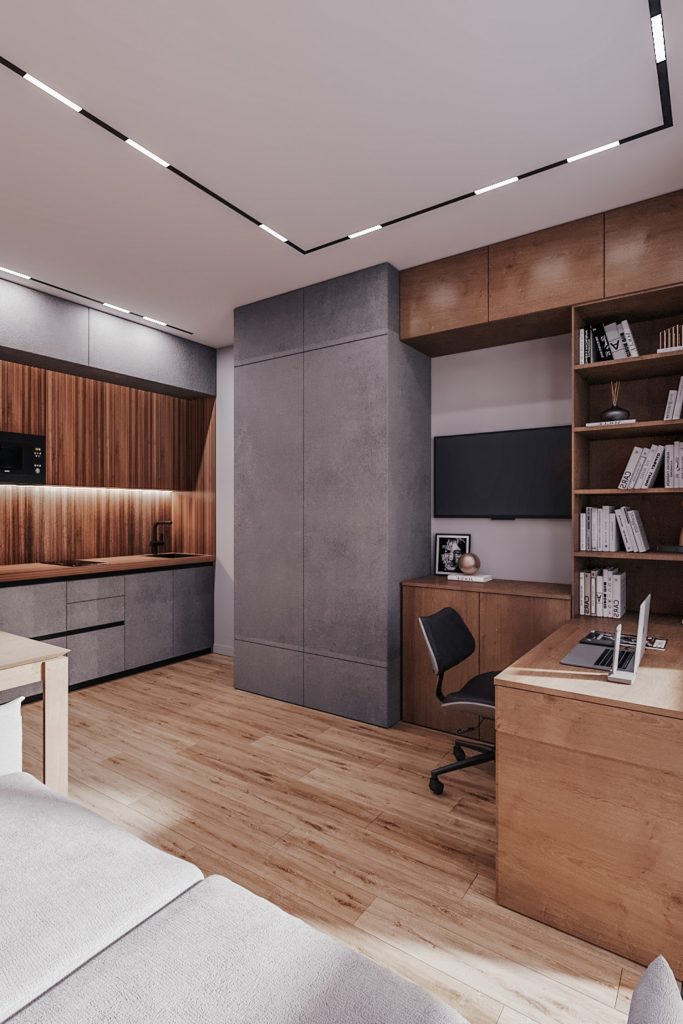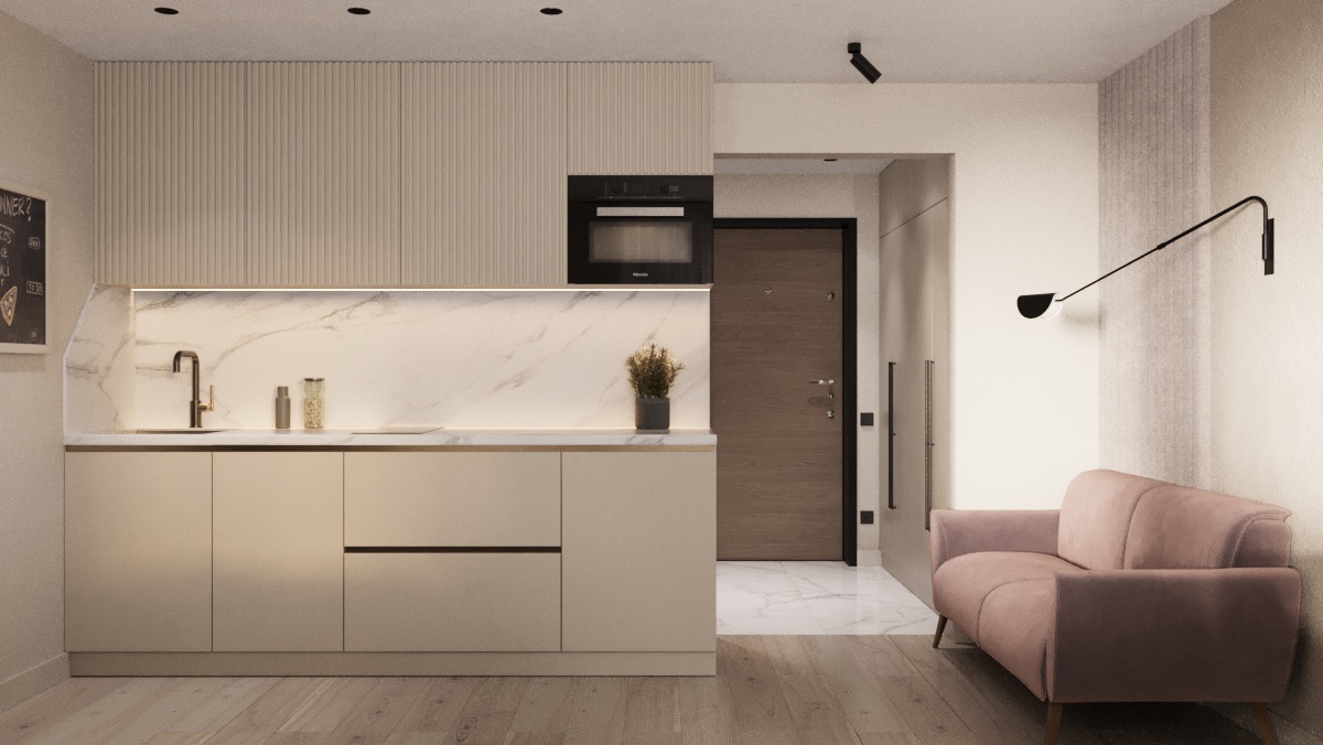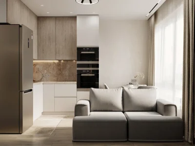 - Фото дизайна современной студии 28 кв в серо-бежевых тонах в ЖК TopHills