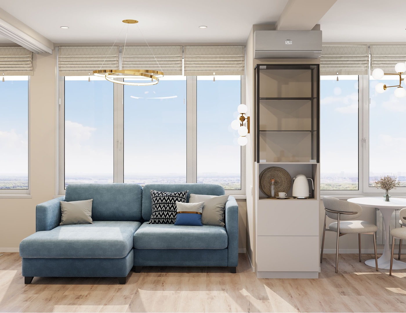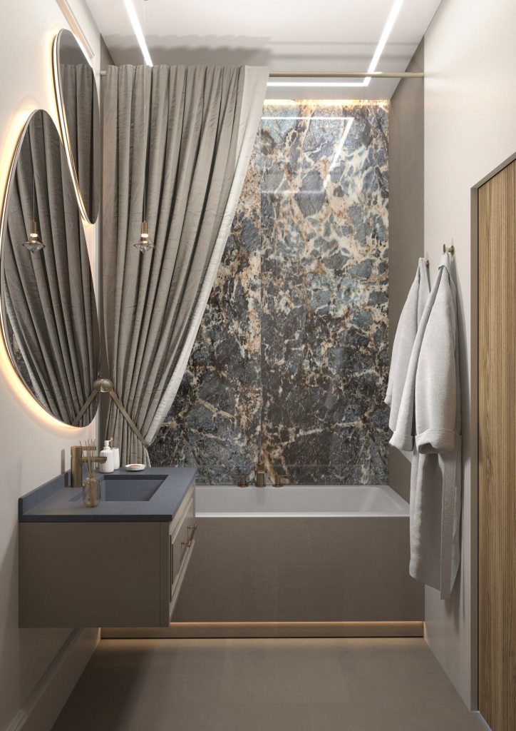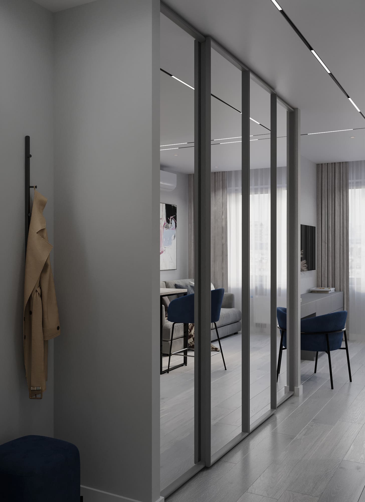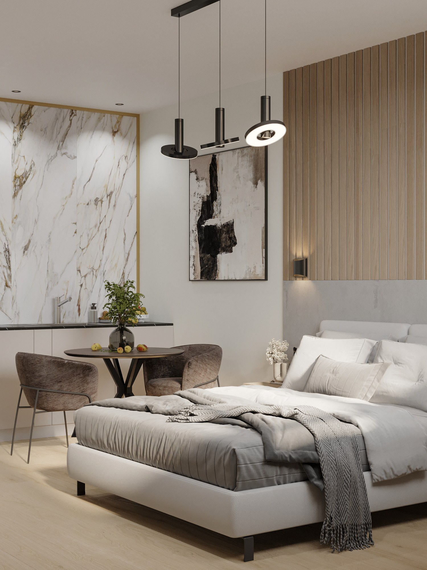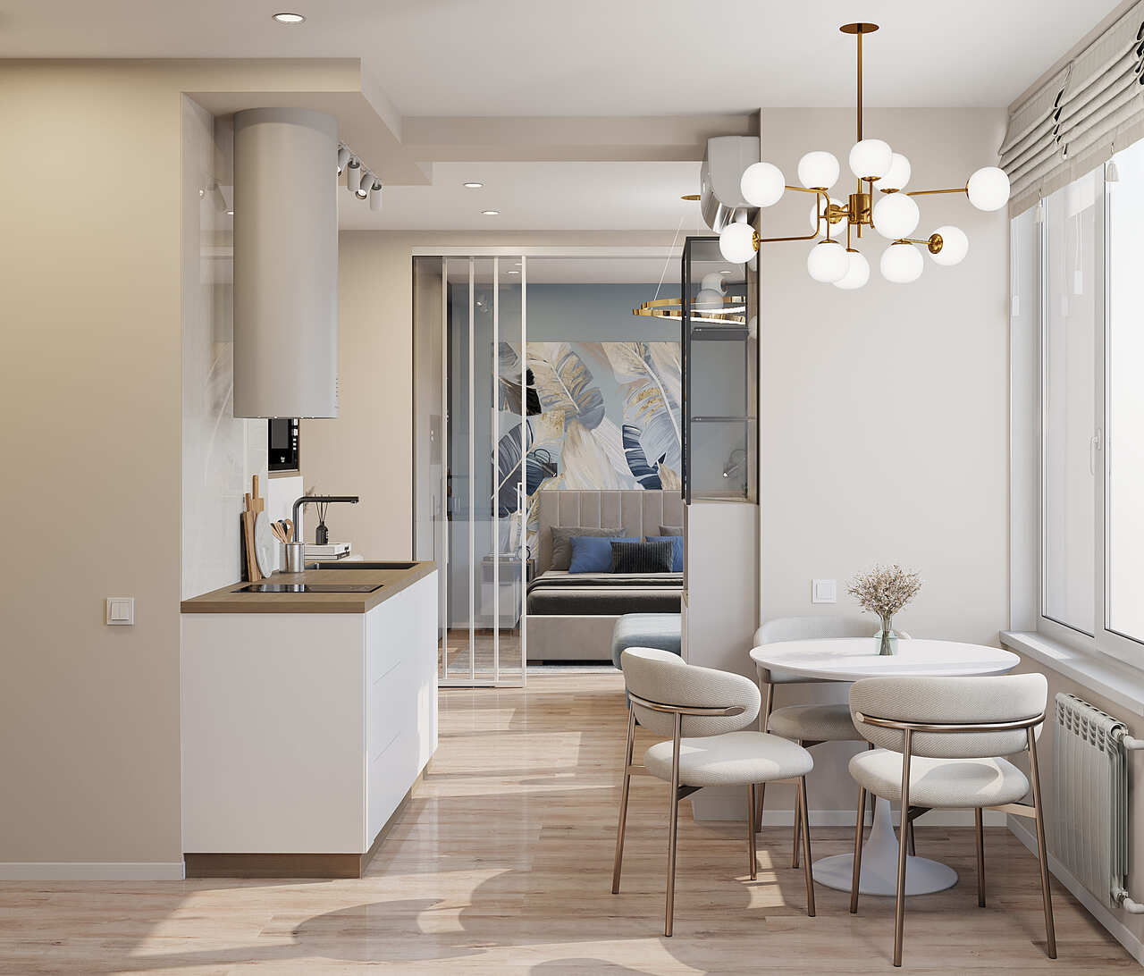 - Фото дизайна современной студии 28 кв в серо-бежевых тонах в ЖК TopHills