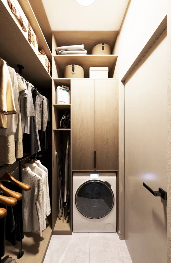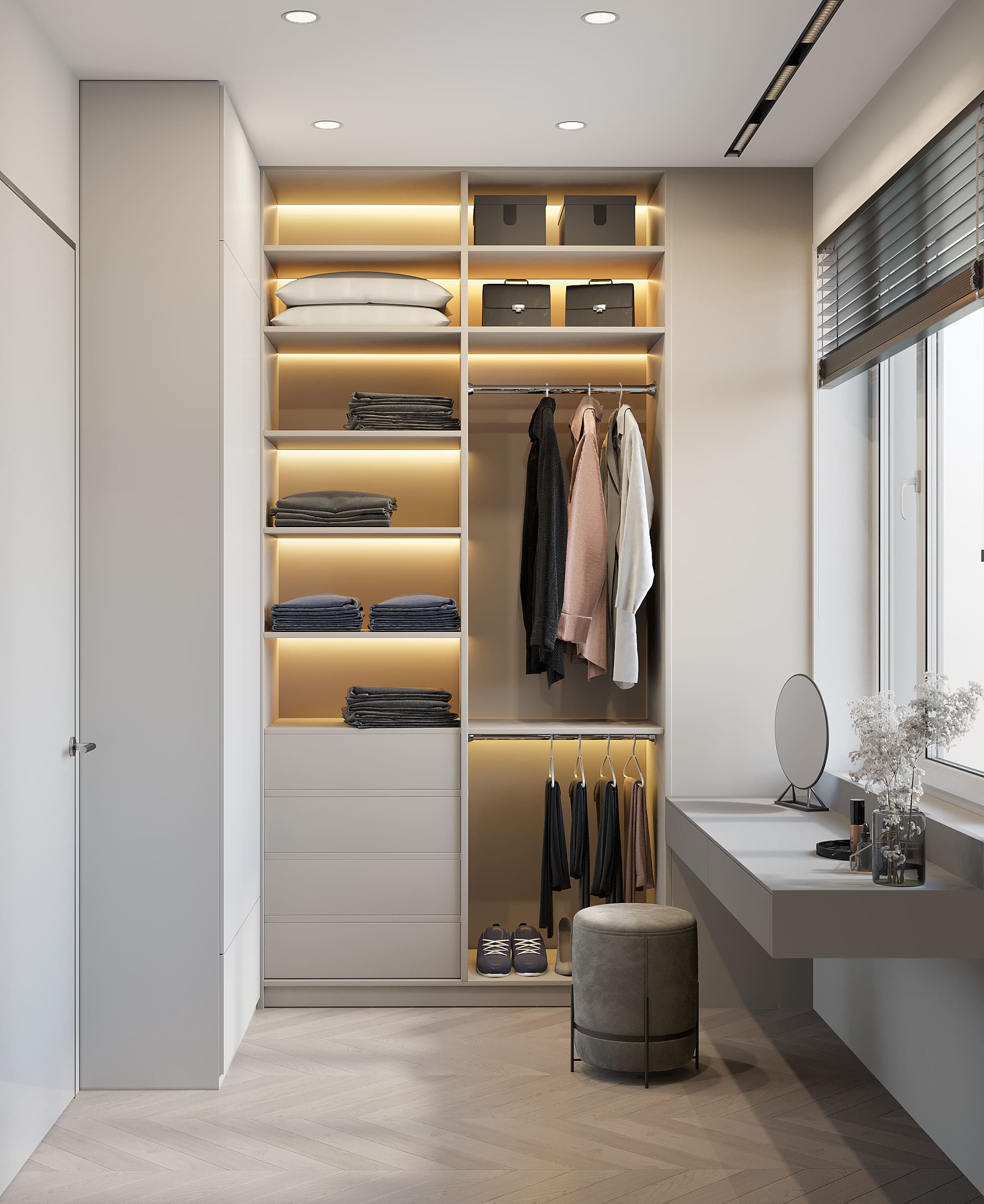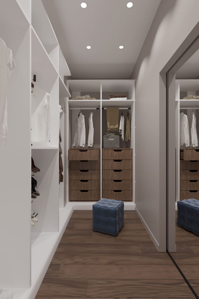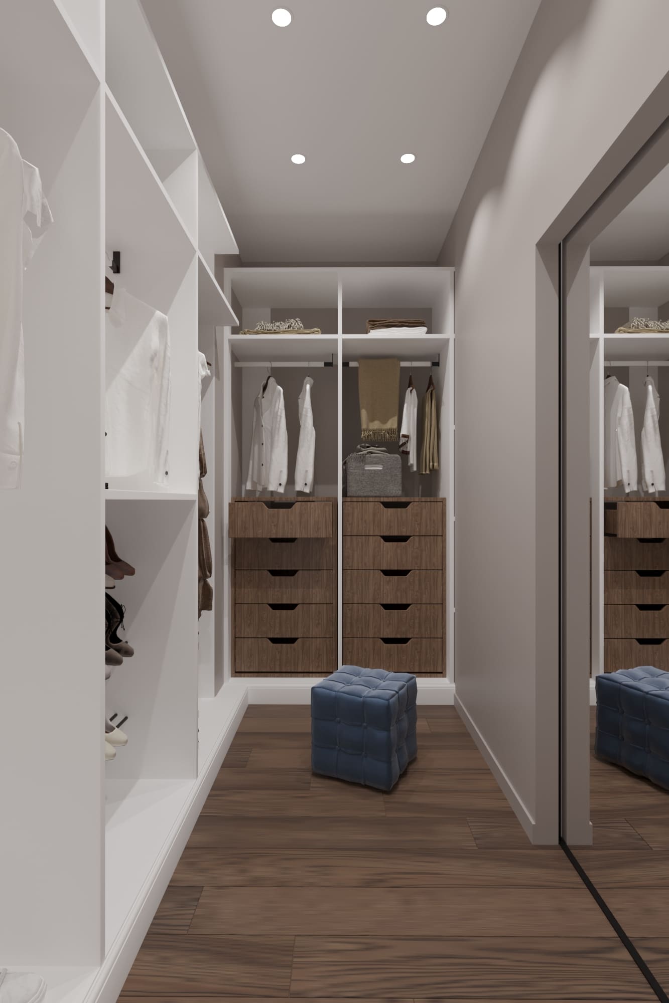 📌 Зона для одежды: Расположите ее по центру или вдоль одной стены. Используйте комбинацию открытых вешалок для пиджаков и блузок и высоких шкафов с глухими фасадами для свитеров и белья. Это подчеркнет архитектуру пространства.
