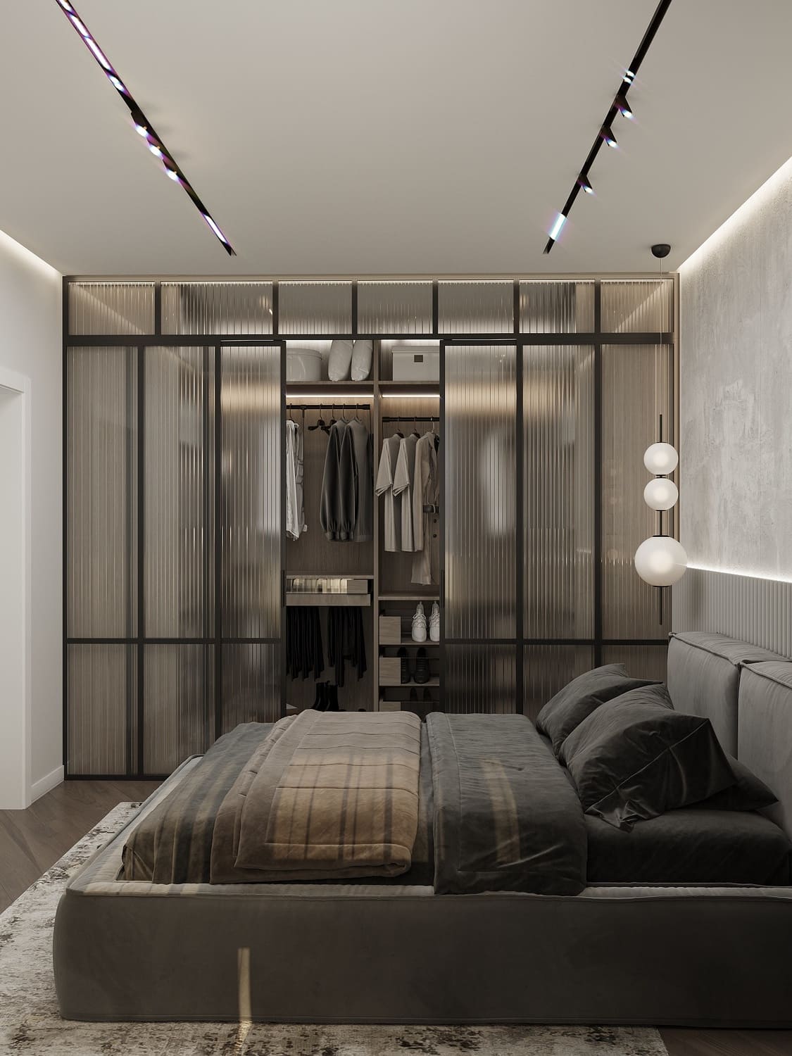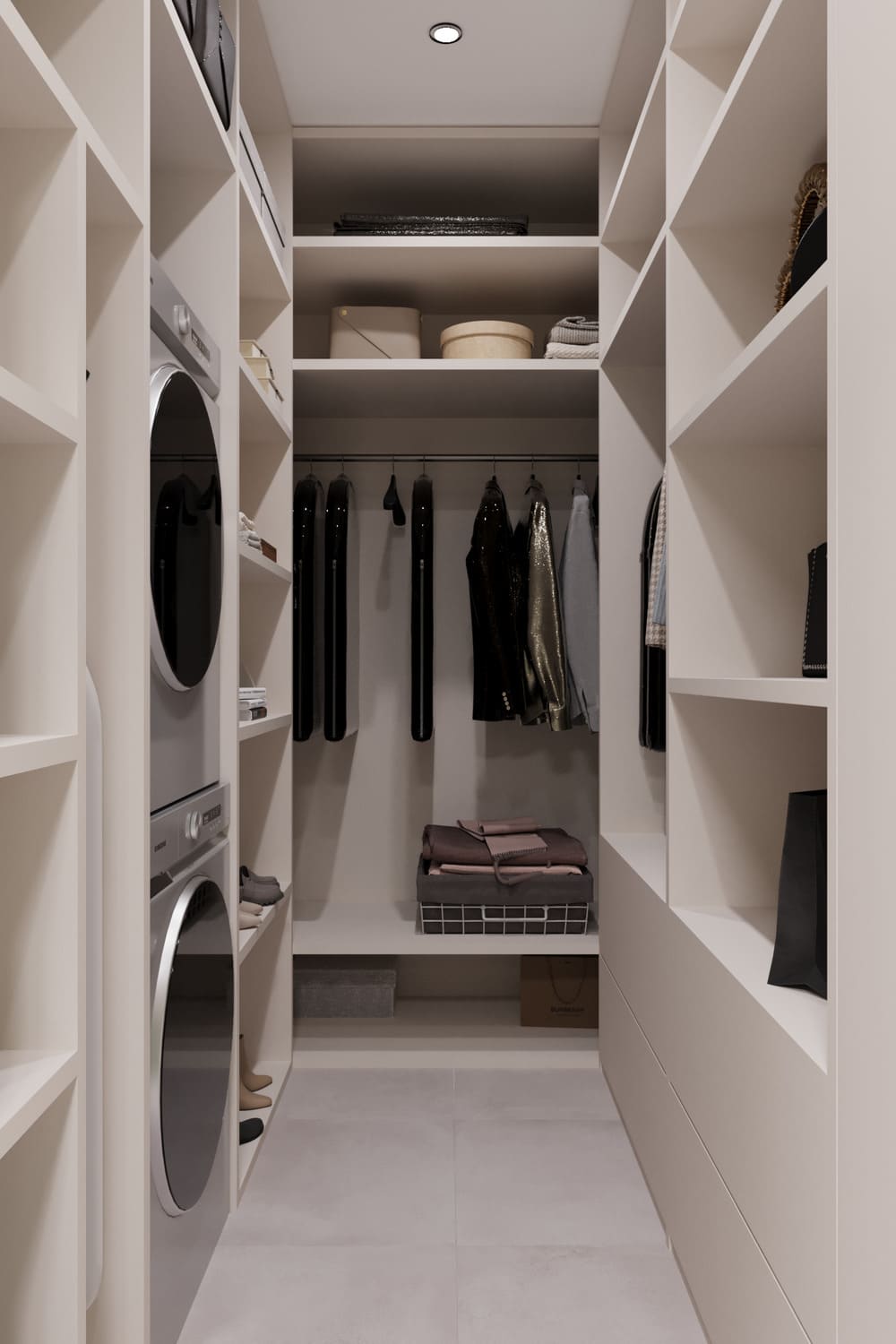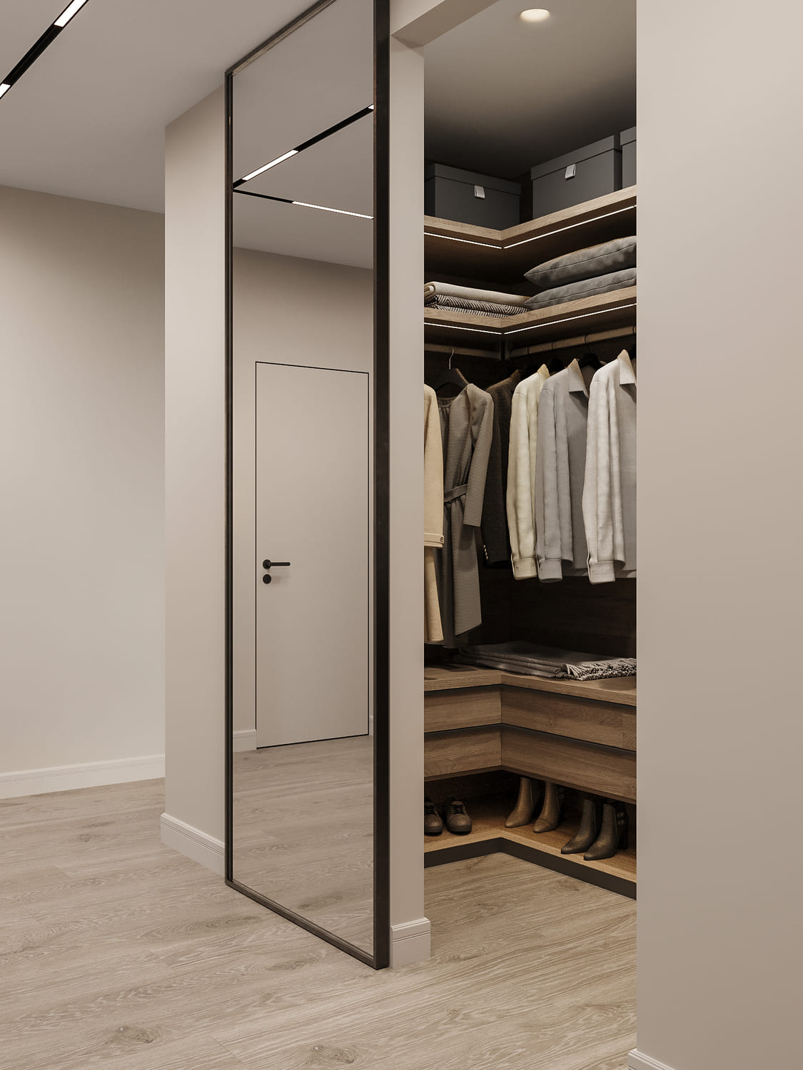 📌 Зона для одежды: Расположите ее по центру или вдоль одной стены. Используйте комбинацию открытых вешалок для пиджаков и блузок и высоких шкафов с глухими фасадами для свитеров и белья. Это подчеркнет архитектуру пространства.