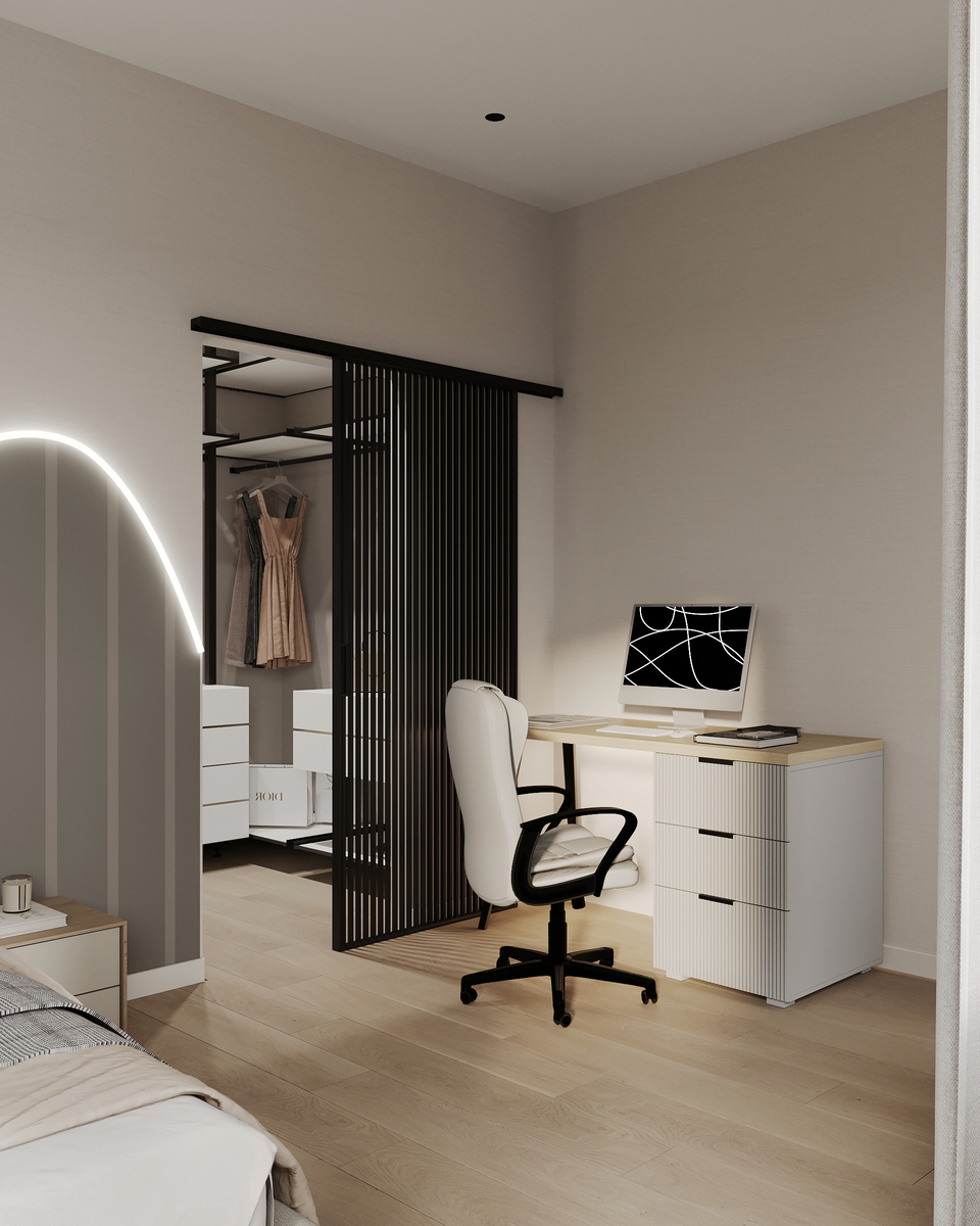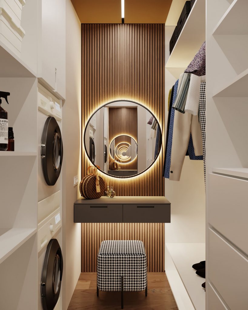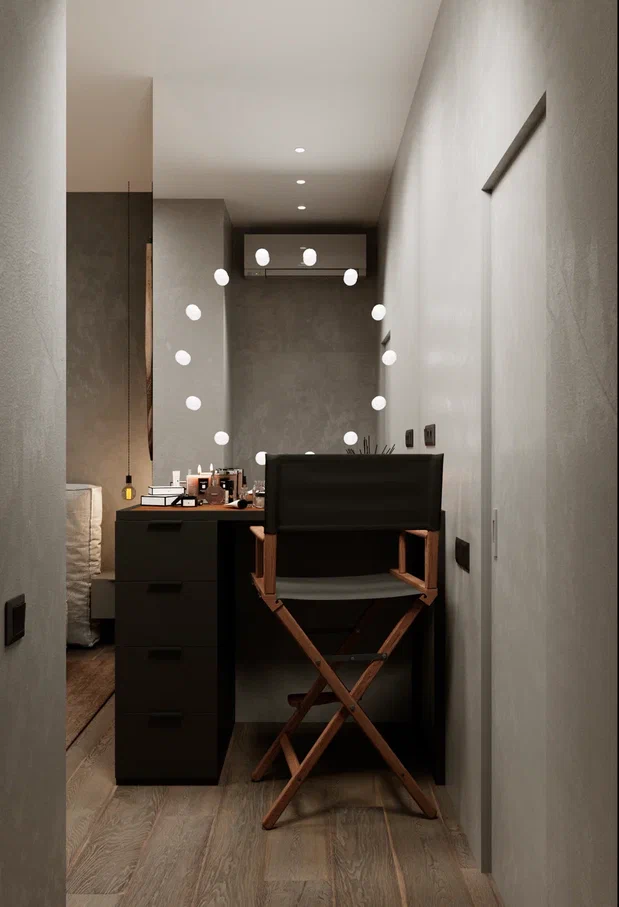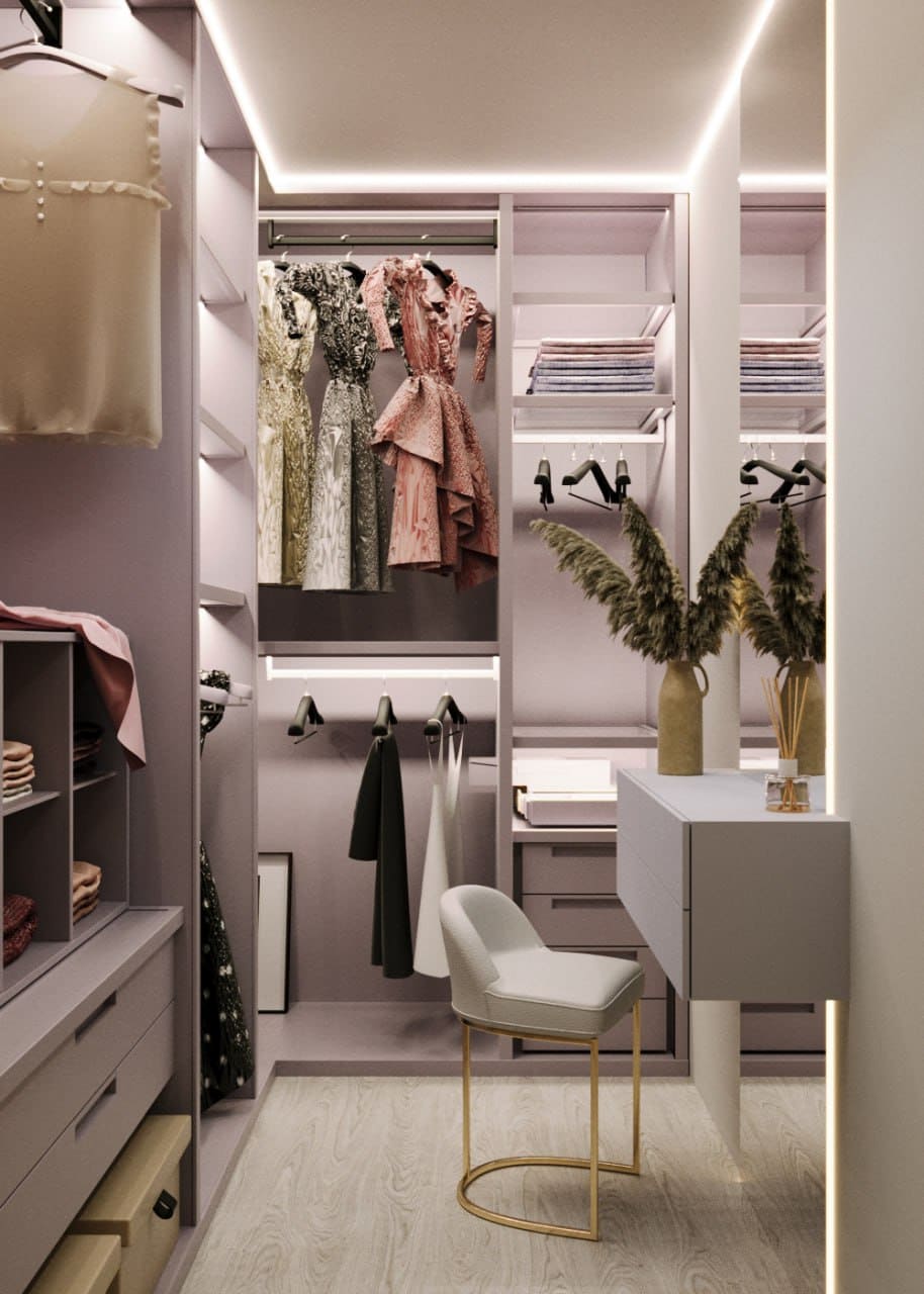 Превратите даже маленькую гардеробную в свой личный хаб: добавьте туда компактный письменный стол или туалетный столик для косметики. Теперь все ваши утренние ритуалы — от выбора образа до макияжа — будут собраны в одном месте.