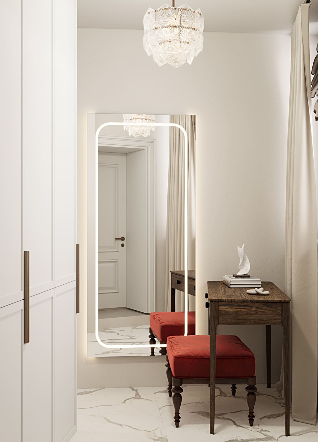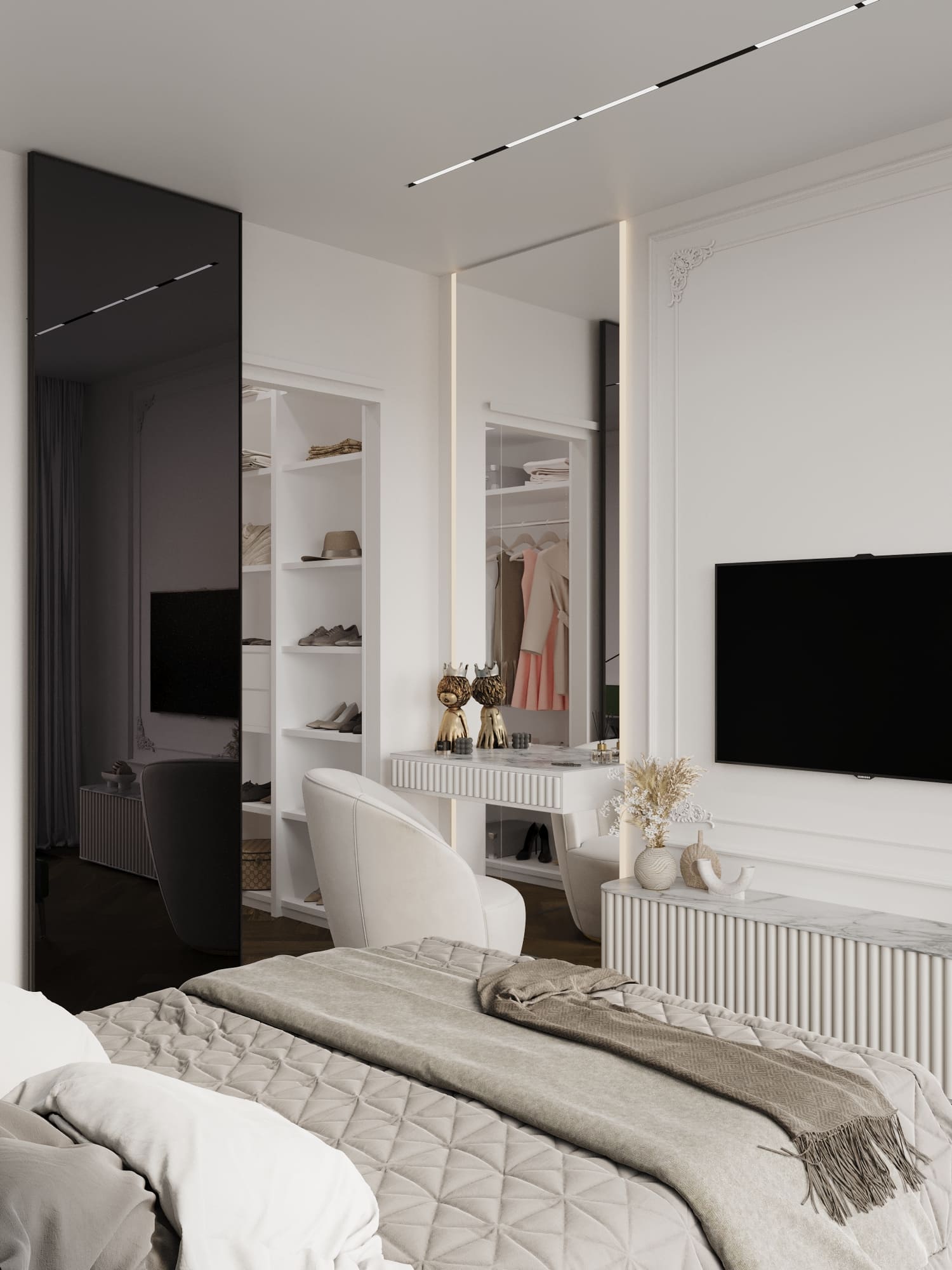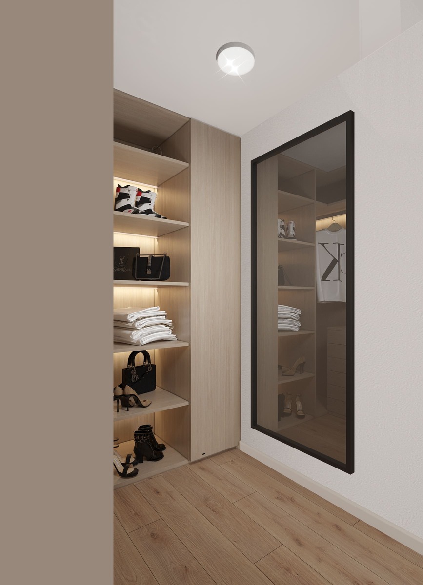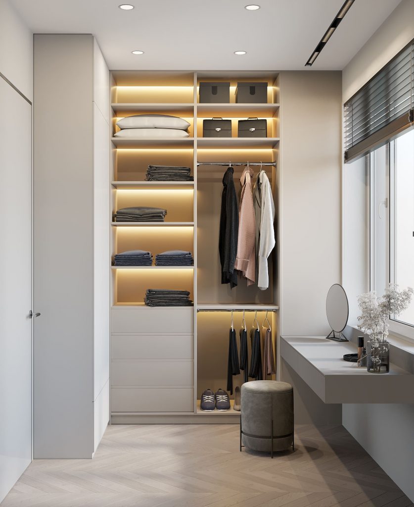 Превратите даже маленькую гардеробную в свой личный хаб: добавьте туда компактный письменный стол или туалетный столик для косметики. Теперь все ваши утренние ритуалы — от выбора образа до макияжа — будут собраны в одном месте.
