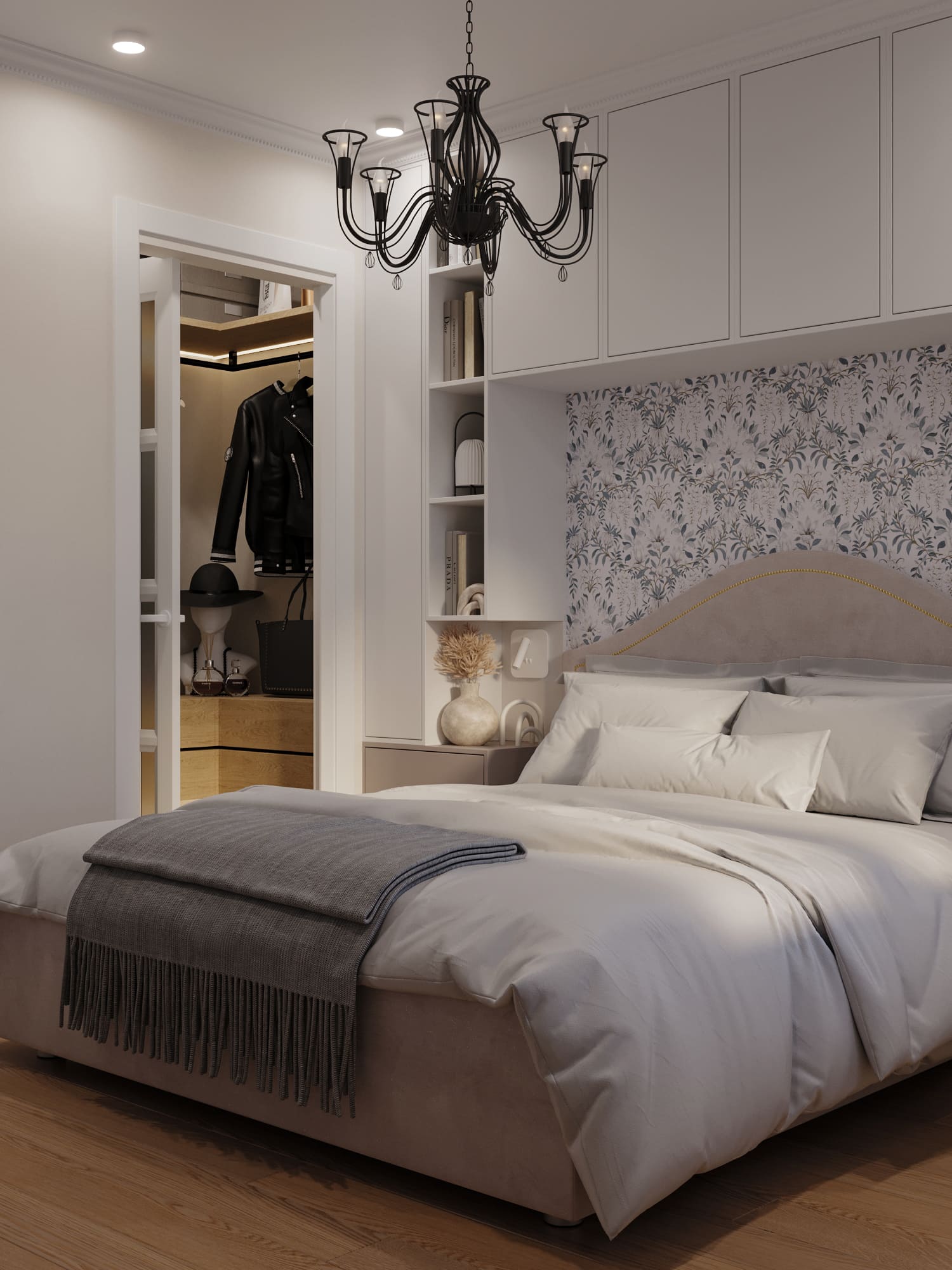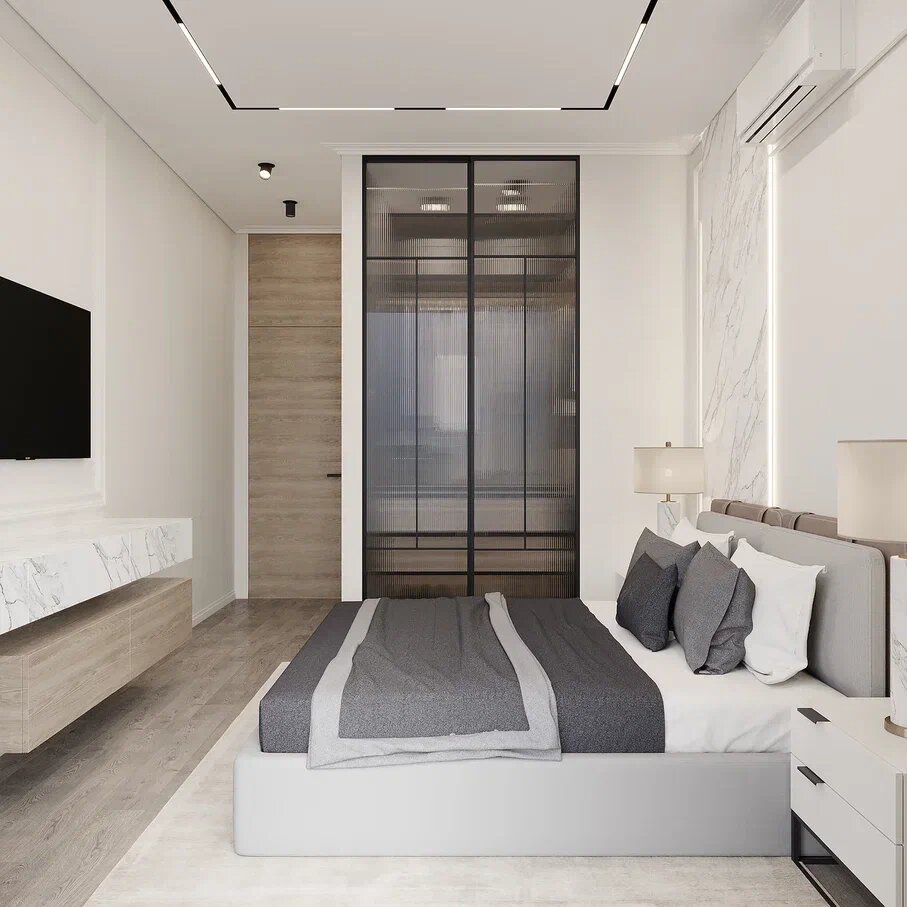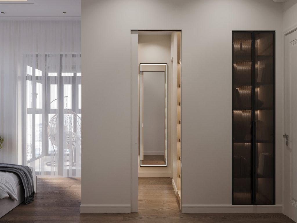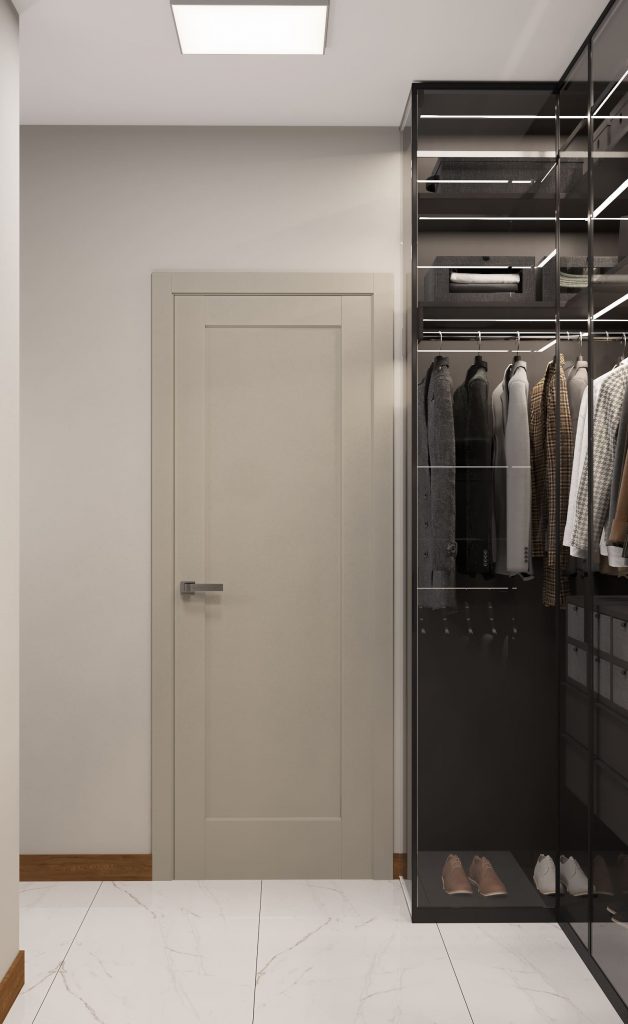 Этот вариант хорошо подходит для просторных квартир или домов. Например, разместив гардеробную между спальней и ванной, вы получите пространство, обеспечивающее удобный и быстрый доступ к одежде, обуви и аксессуарам. Это создаст функциональную и гармоничную зону хранения.