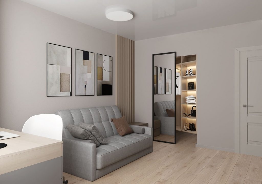Ещё одной беспроигрышной идеей будет специально оборудовать нишу, путем перепланировки или выделения зоны в комнате с добавлением новых перегородок. Главное отталкиваться от основного функционала комнаты — если в ней помещается всё, что нужно, и остаётся немного пространства — то оно вполне может быть выделено под нишу. Если вы планируете ремонт не своими руками, то можно изначально обратиться к дизайнеру с просьбой оборудовать гардеробную в комнате - и дизайнер уже использует планировку самым функциональным способом.