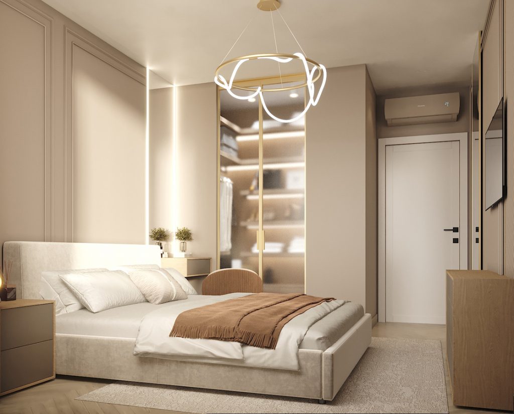 Также популярностью пользуется проход в спальню через гардеробную из прихожей или второй спальни; таким образом можно объединить больше вещей в одной гардеробной и сделать сезонное хранение более удобным.