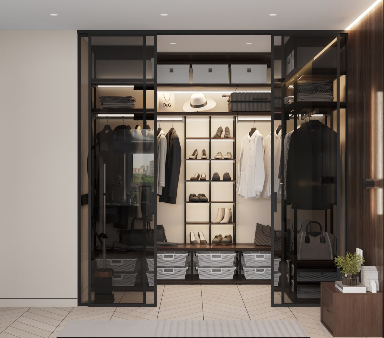 Такая гардеробная делает даже узкое помещение более организованным и функциональным, не загромождая пространство.