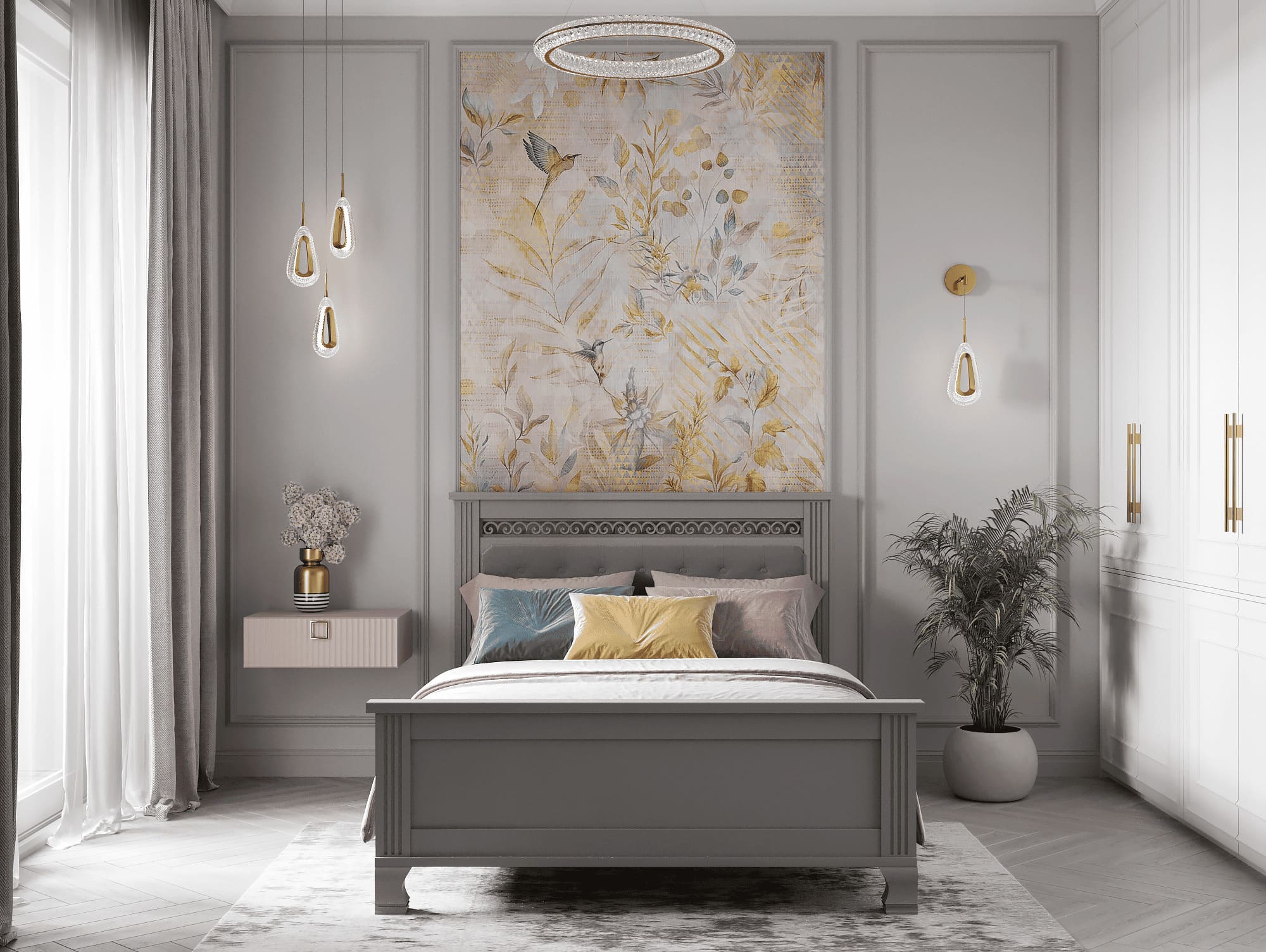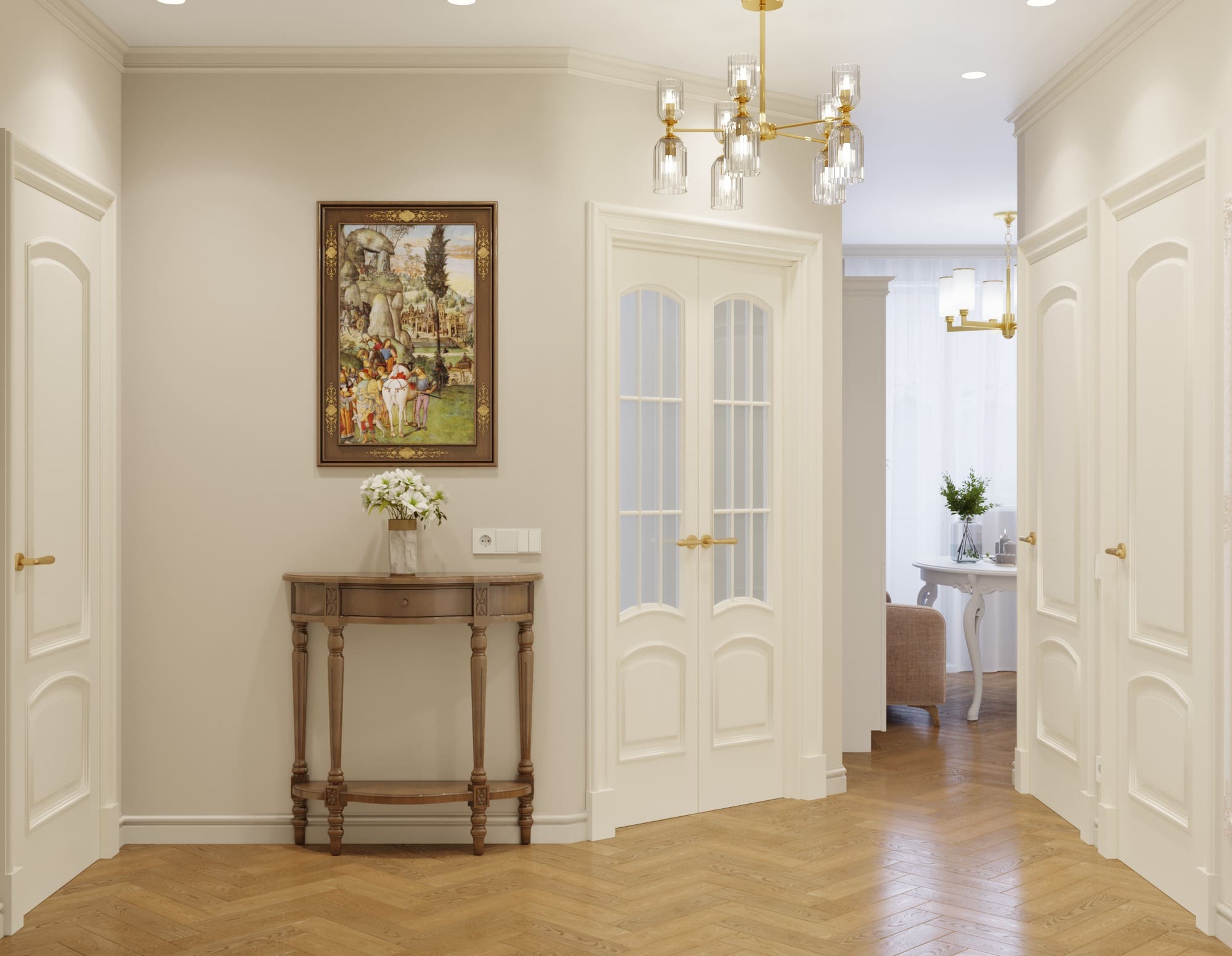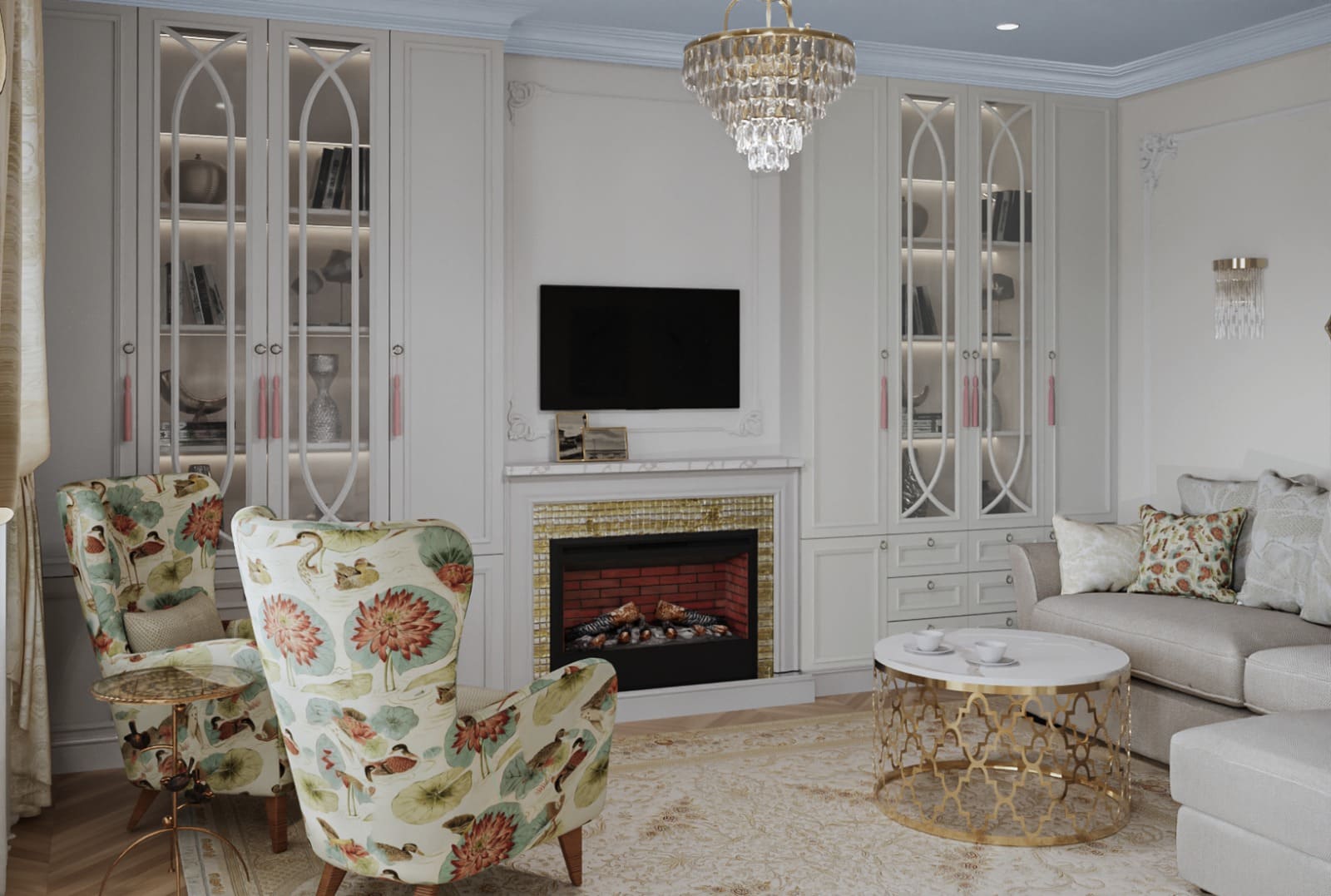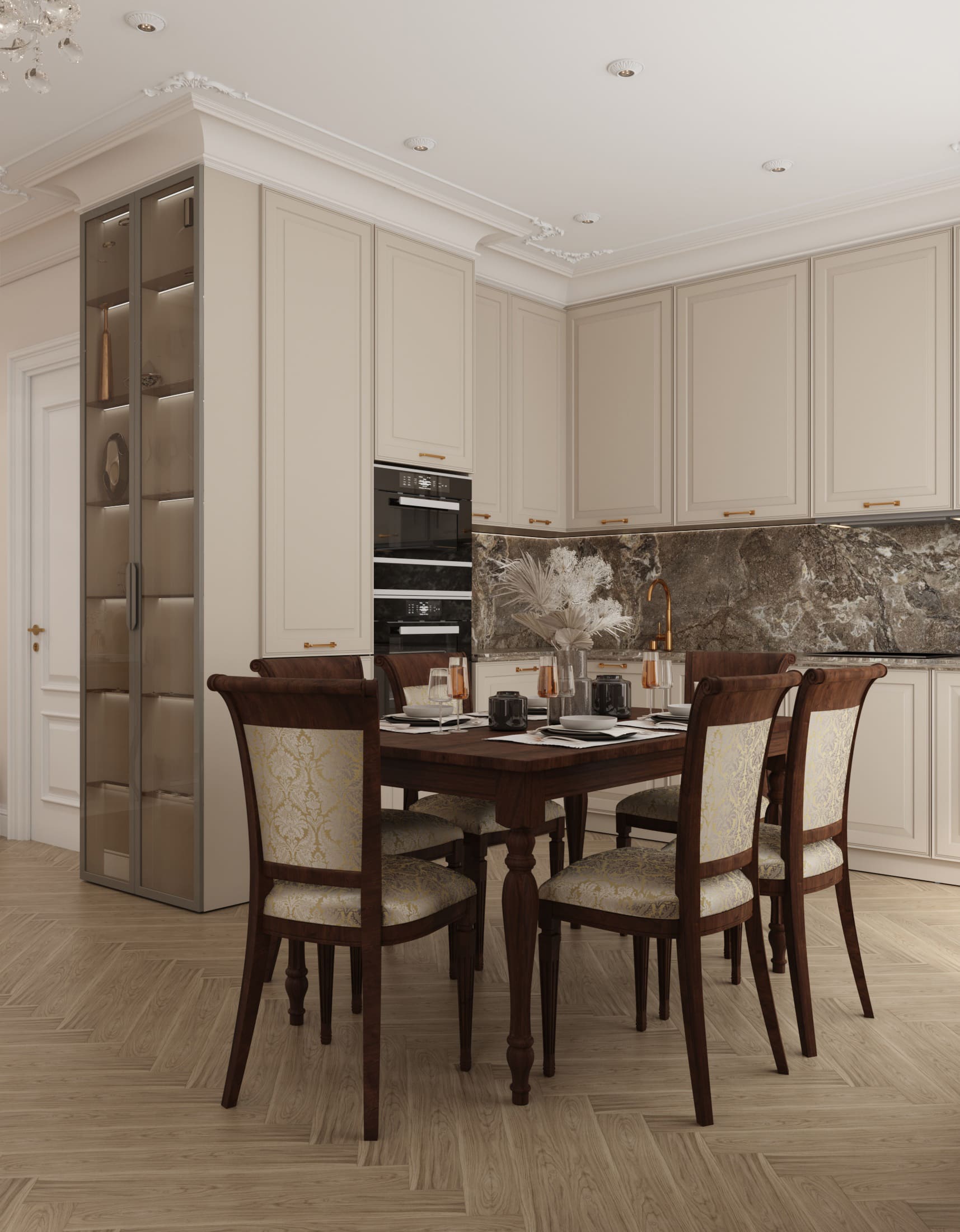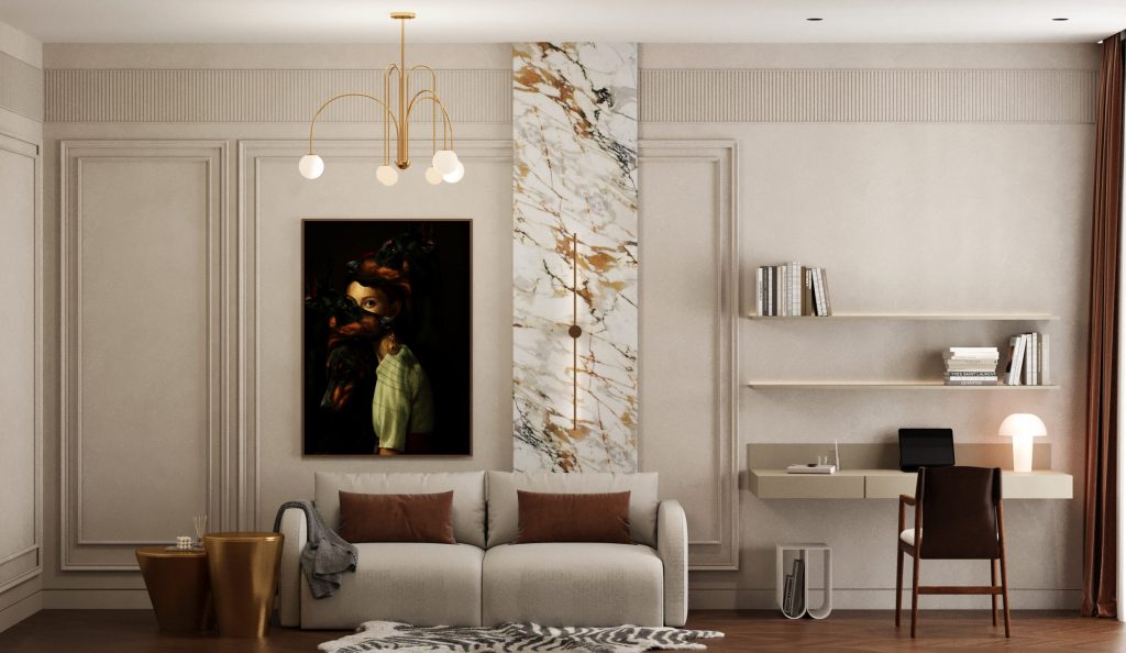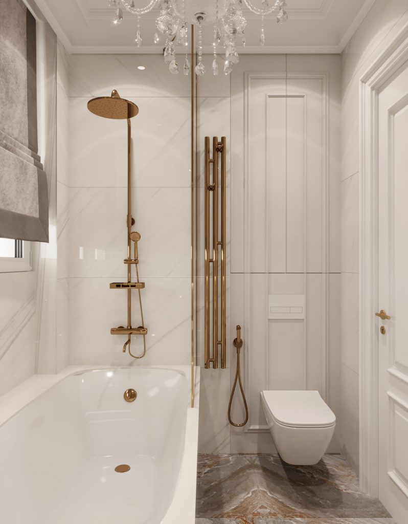 • Золотые и бронзовые детали — используются в фурнитуре, светильниках и декоре, подчёркивая статусность.