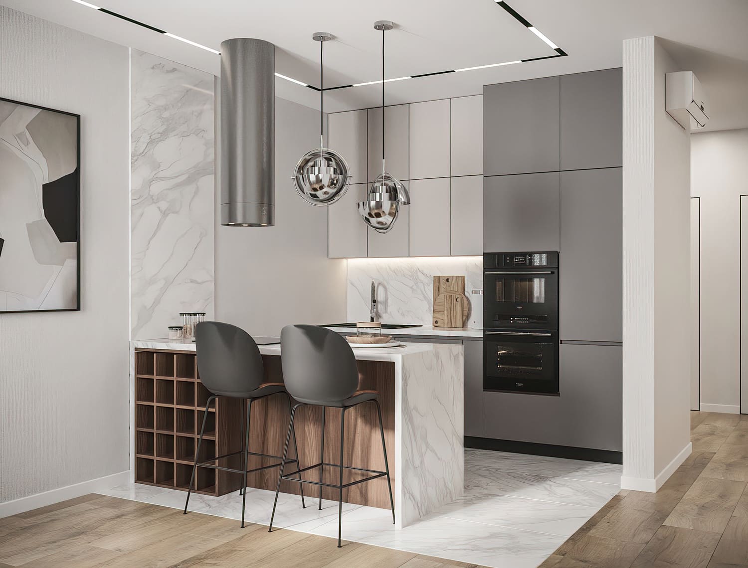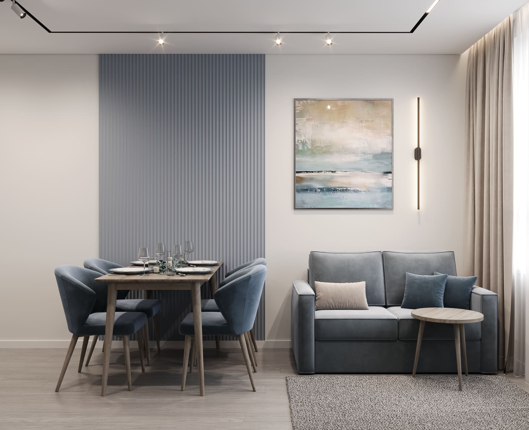 Главное правило — делать переход между материалами максимально четким, без плавных градиентов. Так каждая зона получит визуально очерченные границы, сохраняя при этом единство пространства.