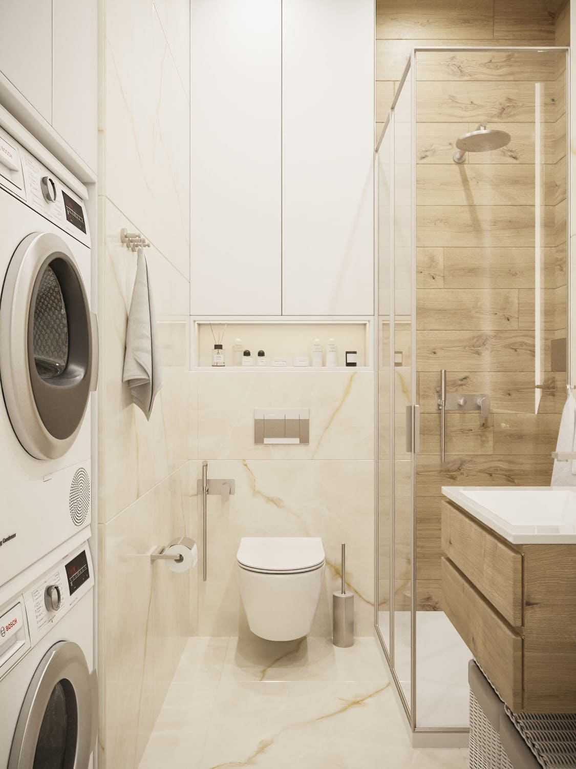 📌 Эти решения помогут сделать даже небольшую совмещенную ванную функциональной и стильной.