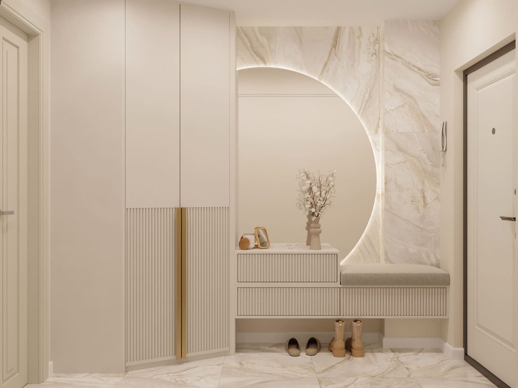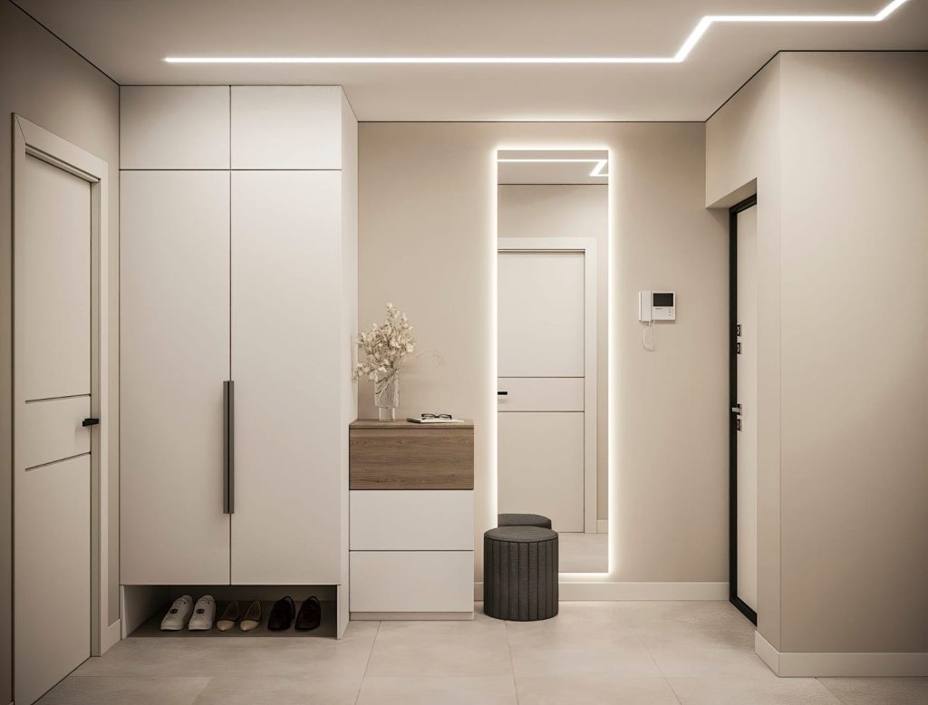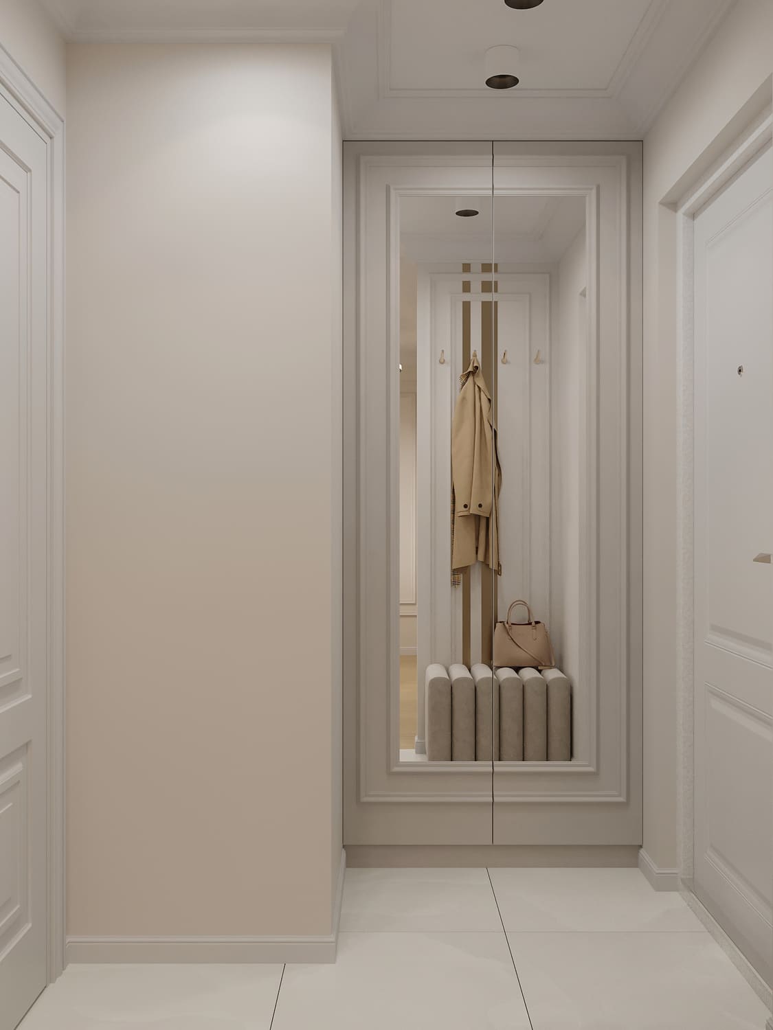 В проектах использованы зеркальные панели для визуального расширения пространства, встроенные шкафы-купе до потолка и компактная банкетка с местом для обуви. Точечная подсветка и светлые оттенки отделки создают ощущение простора, а практичные влагостойкие материалы гарантируют долговечность даже в условиях активной эксплуатации.