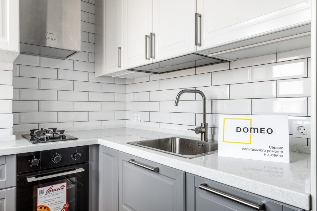 Были полностью обновлены кухонные шкафы и фасады, выполненные в светлом оттенке серого, что визуально расширяет пространство и создает ощущение свежести и чистоты. Стены украшены классической белой кафельной плиткой в стиле subway, которая легко сочетается с новым интерьером и обеспечивает долговечность. Рабочая поверхность выполнена из прочного и эстетичного материала, устойчивого к повреждениям и загрязнениям. Встроенная современная техника, включая компактную газовую плиту и стильную вытяжку, гармонично вписываются в дизайн.