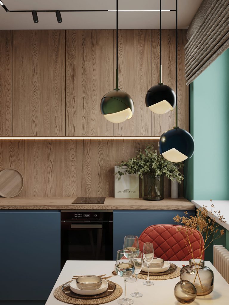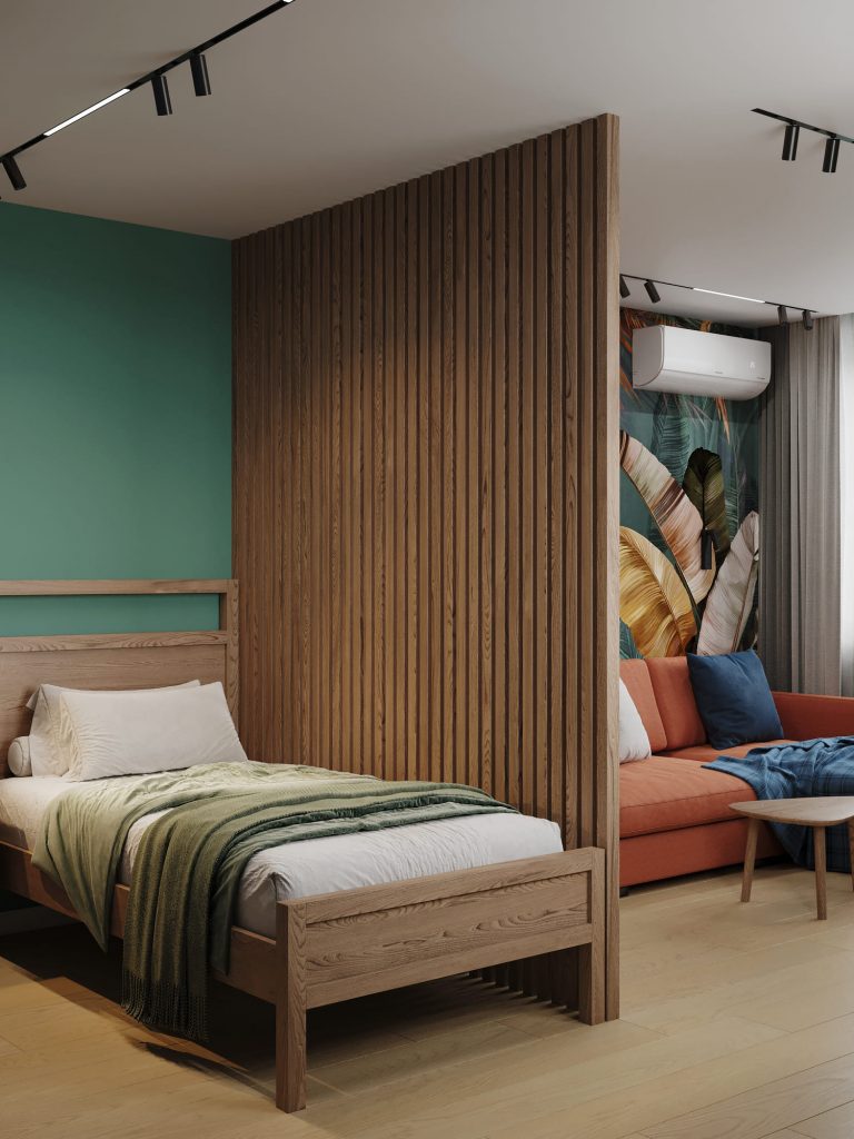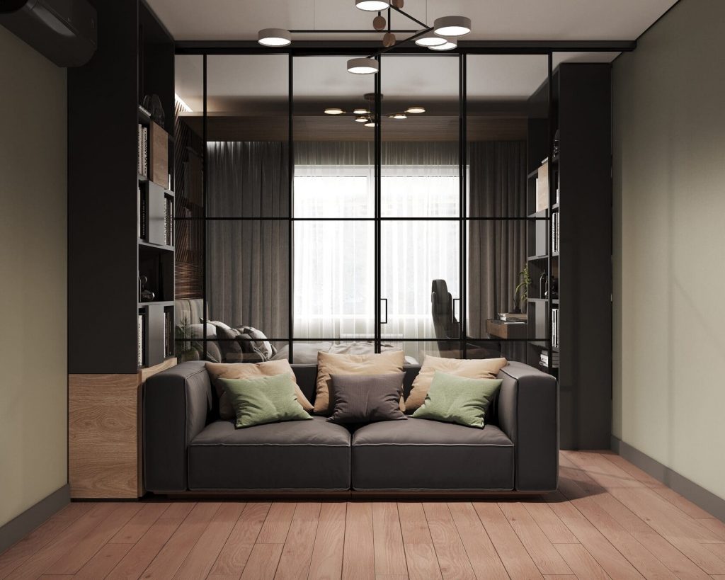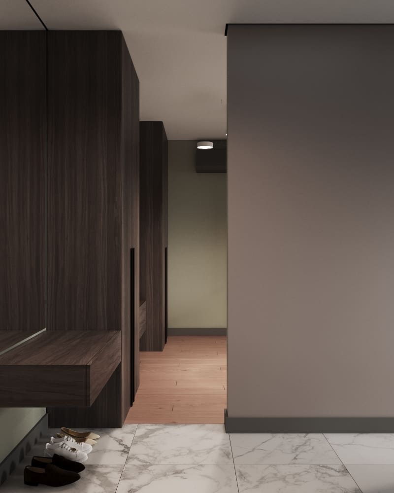 Этот дизайн-проект доказывает, что даже стандартная однушка в хрущевке может стать стильным и благородным пространством. Интерьер для взрослого мужчины решён в сдержанной палитре тёмного дерева, глубокого зелёного и пастельного бежевого, что создаёт атмосферу солидности и уюта.