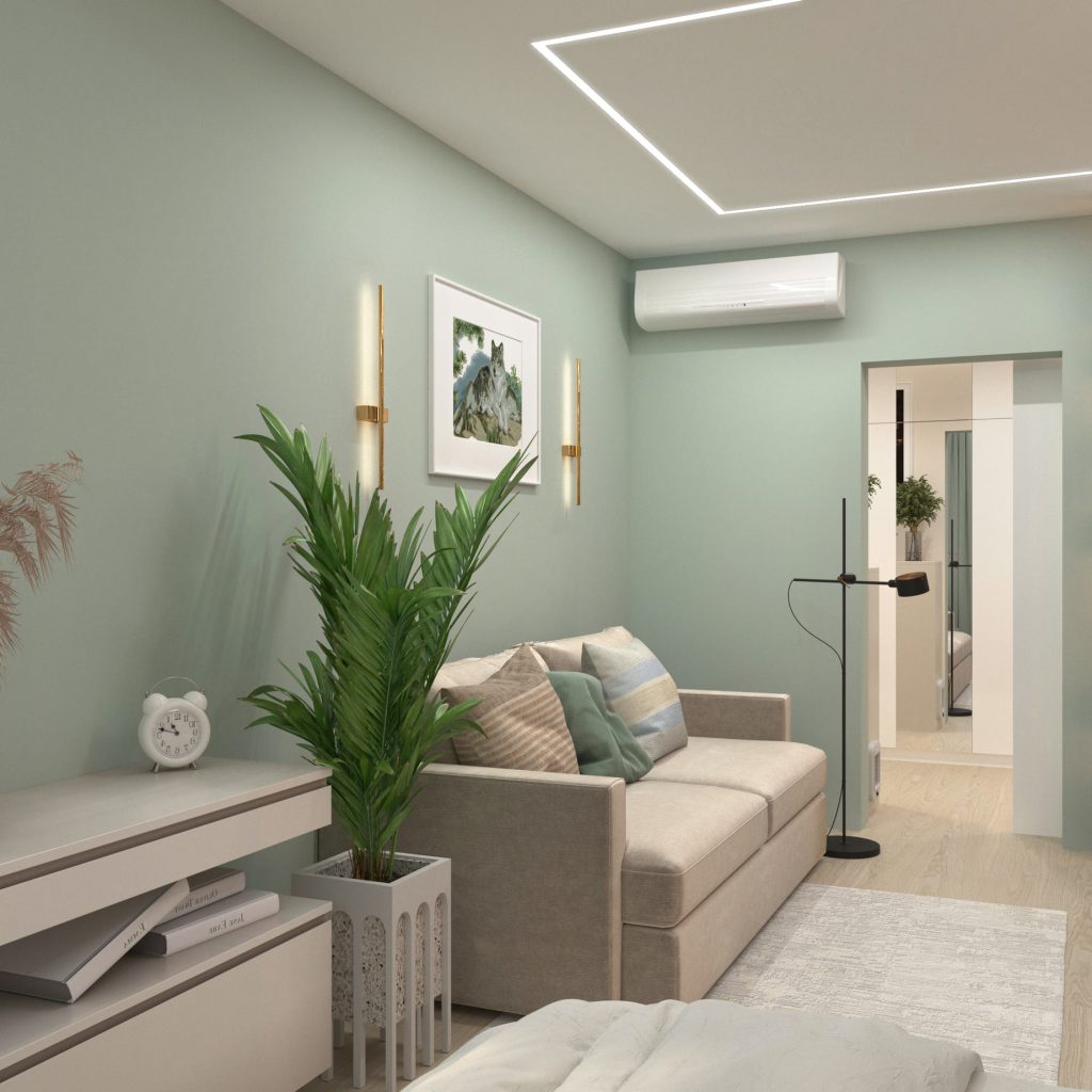 Этот интерьер завораживает своей естественной элегантностью — мягкие бежевые и светло-зеленые тона создают расслабляющую атмосферу, придают глубину пространству и добавляют уют.