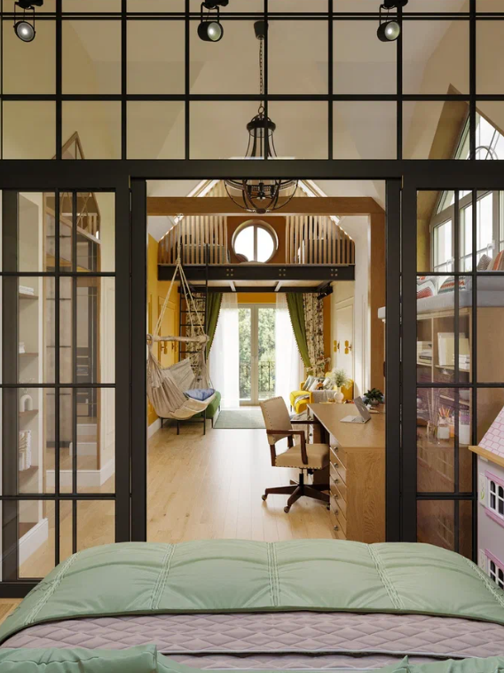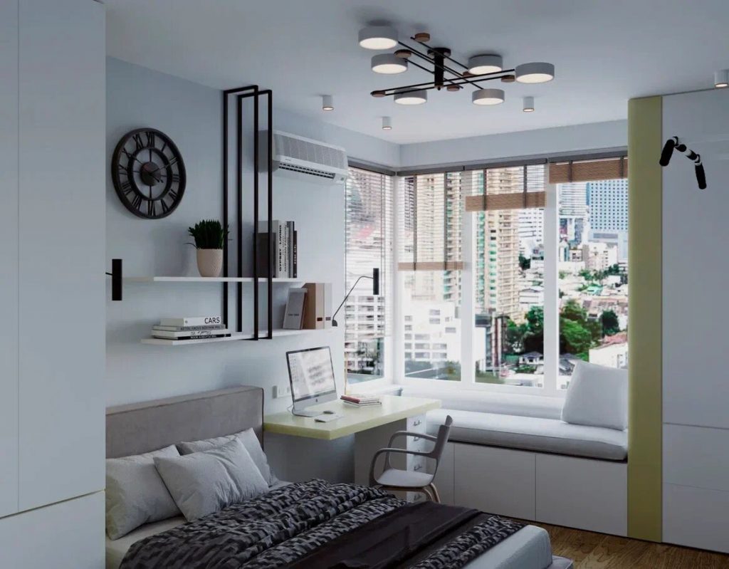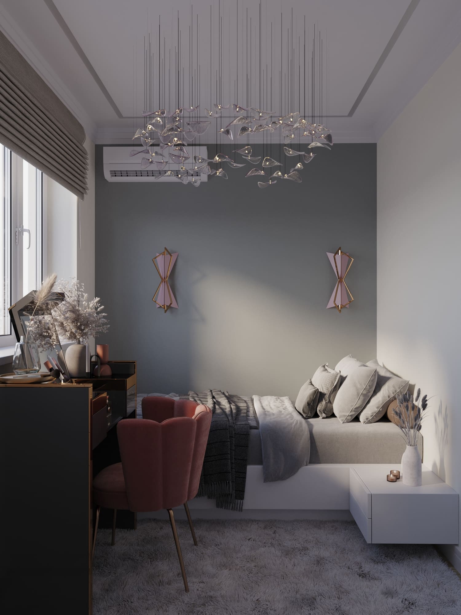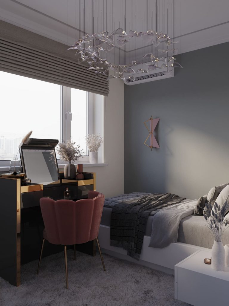 Серый цвет делает комнату спокойной и элегантной, а акценты (люстра, светильники, кресло кораллово-розового цвета) позволяют легко менять настроение интерьера. Пространство получилось одновременно взрослым и уютным — идеально¹ для подростка!