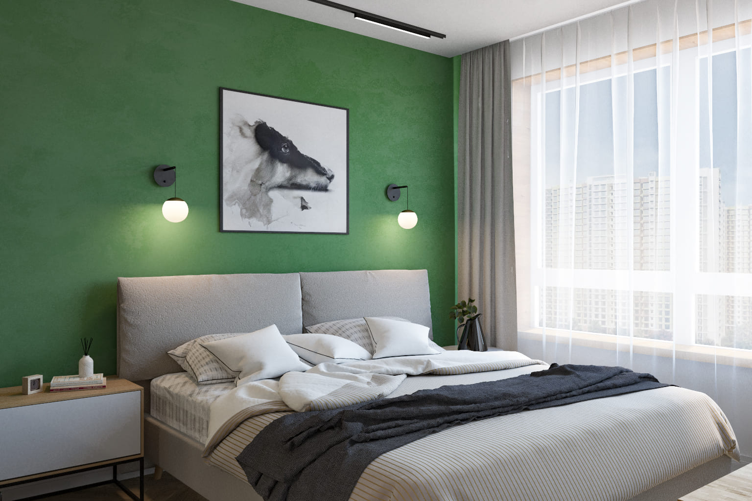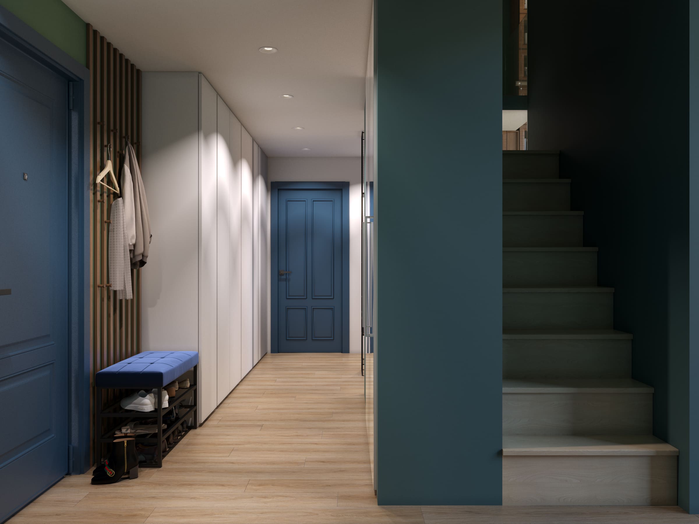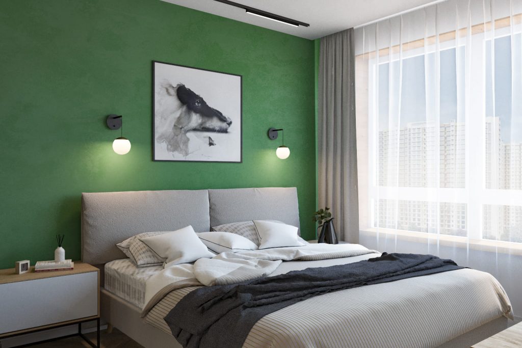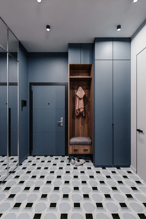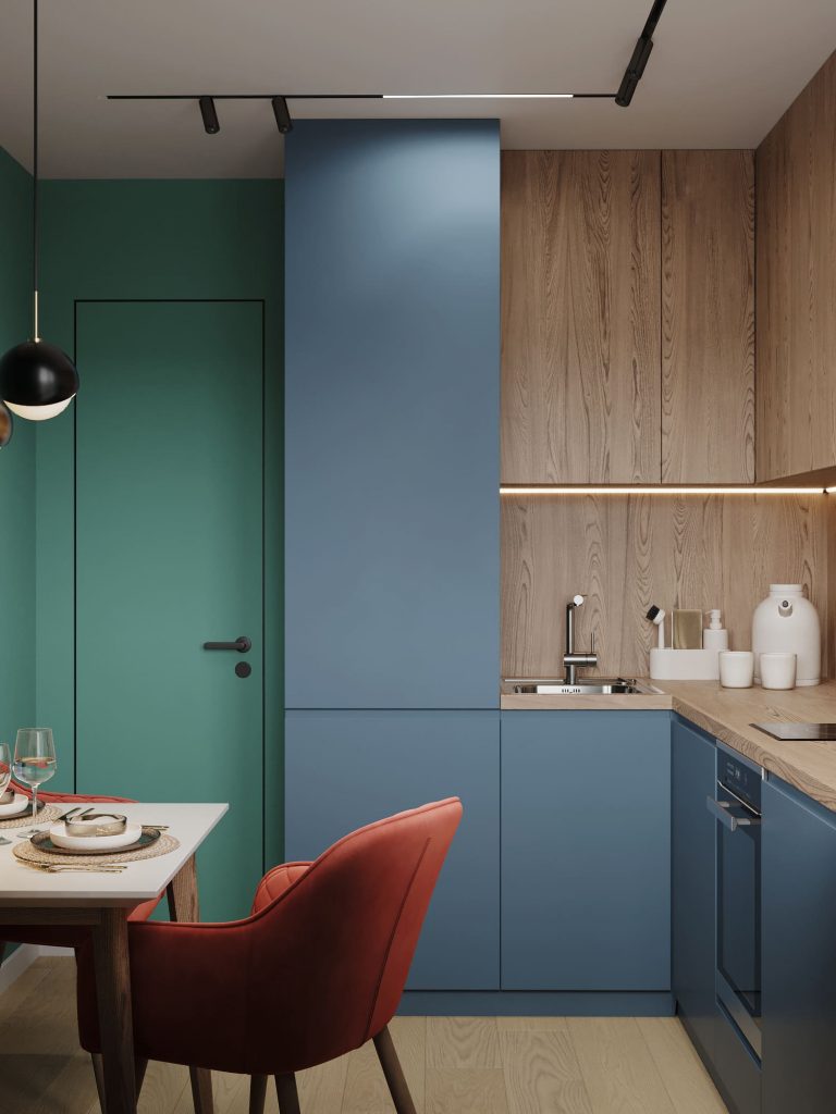 В этой квартире стены в изумрудных и синих тонах создают атмосферу спокойствия и умиротворения. Гармоничное сочетание цветов делает интерьер уютным и стильным, наполняя пространство ощущением гармонии и релаксации.