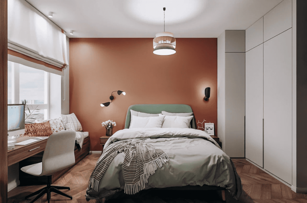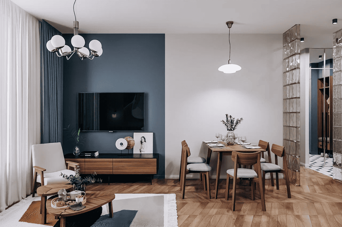 Интерьер этой квартиры построен на эффектном сочетании глубокого синего и энергичного оранжевого. Синий акцент на стене подчеркивает зону отдыха, создавая атмосферу спокойствия, в то время как оранжевые стены в спальне добавляют интерьеру тепла и уюта, создавая яркий и динамичный акцент в помещении.