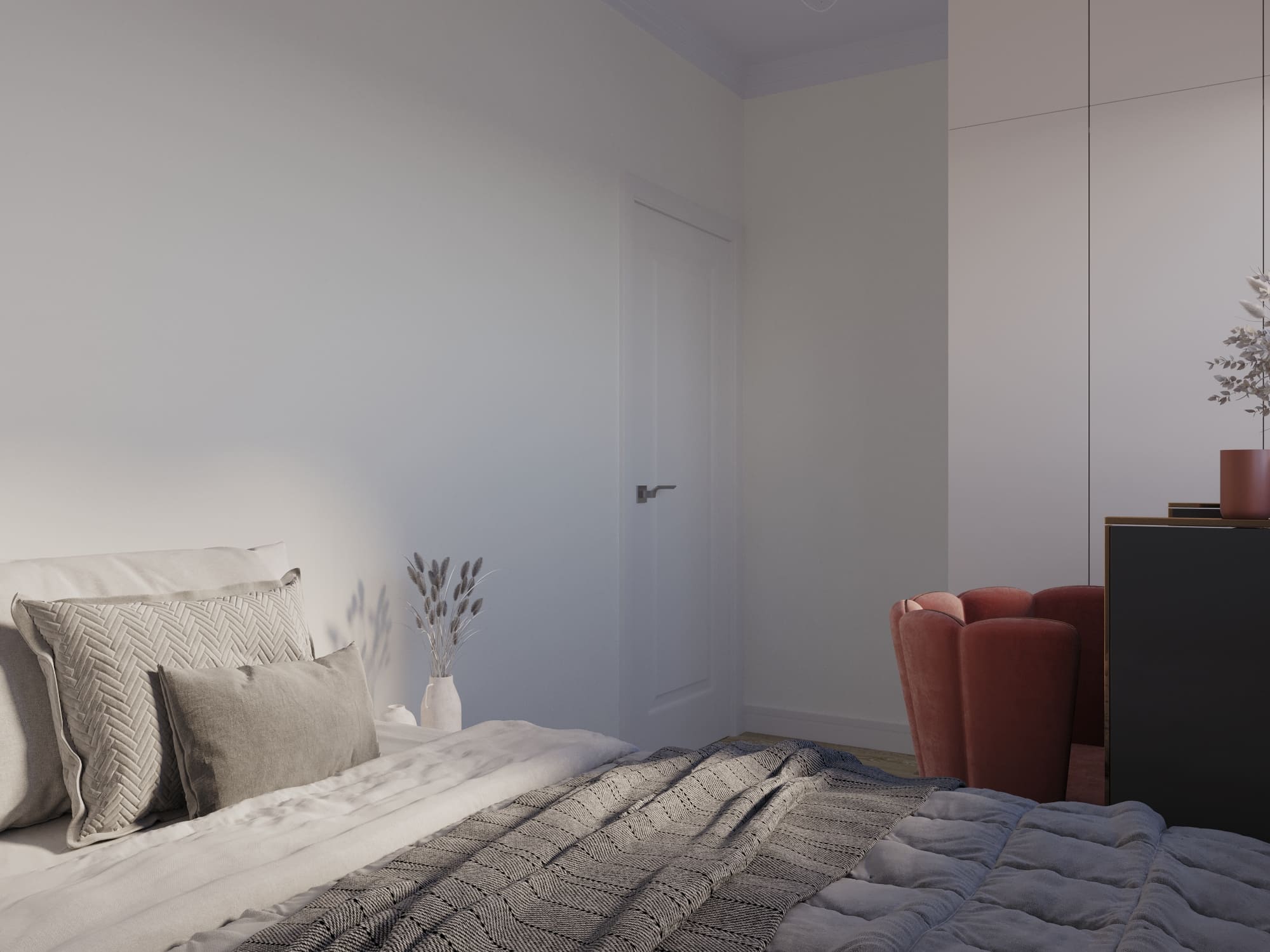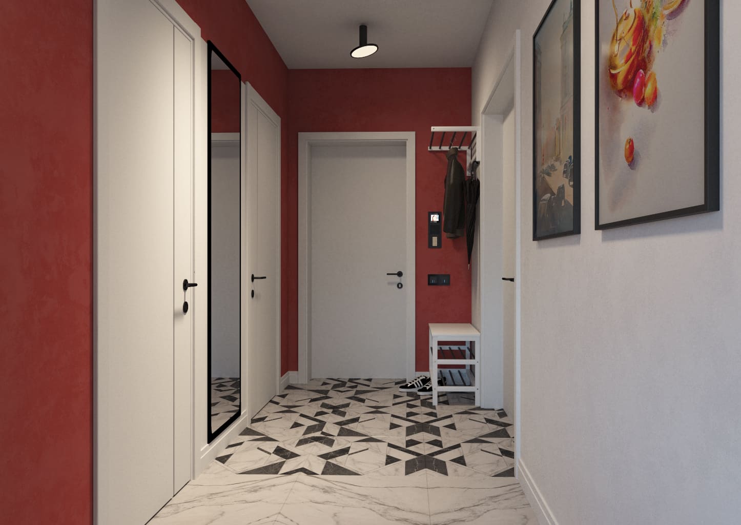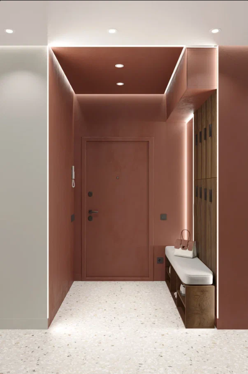 Стены, окрашенные в насыщенные терракотовые оттенки, переходящие и на потолок, и на входную дверь, создают в этой квартире особую атмосферу — уютную, тёплую и в то же время создают обволакивающее ощущение. Терракота, цвет обожжённой глины, придаёт пространству природную глубину и благородство.