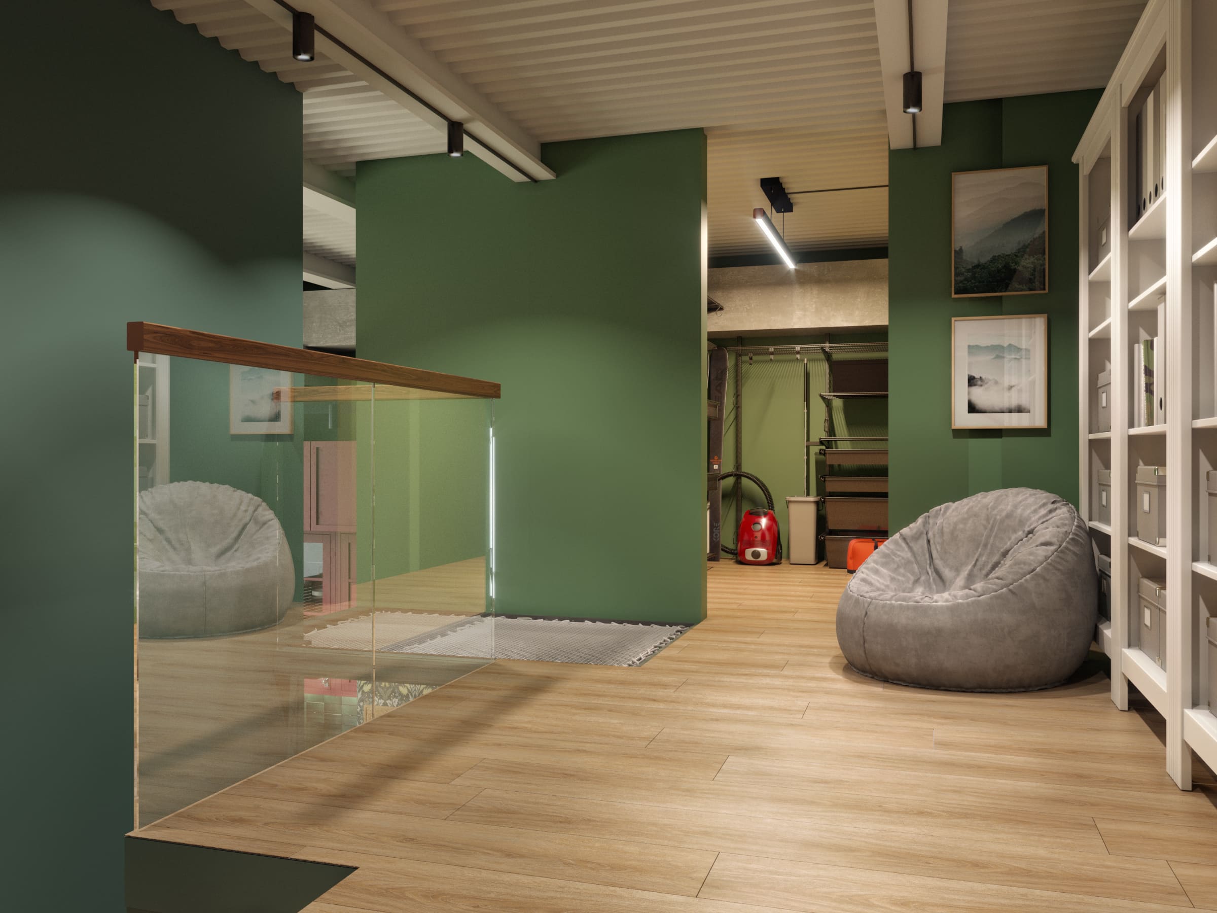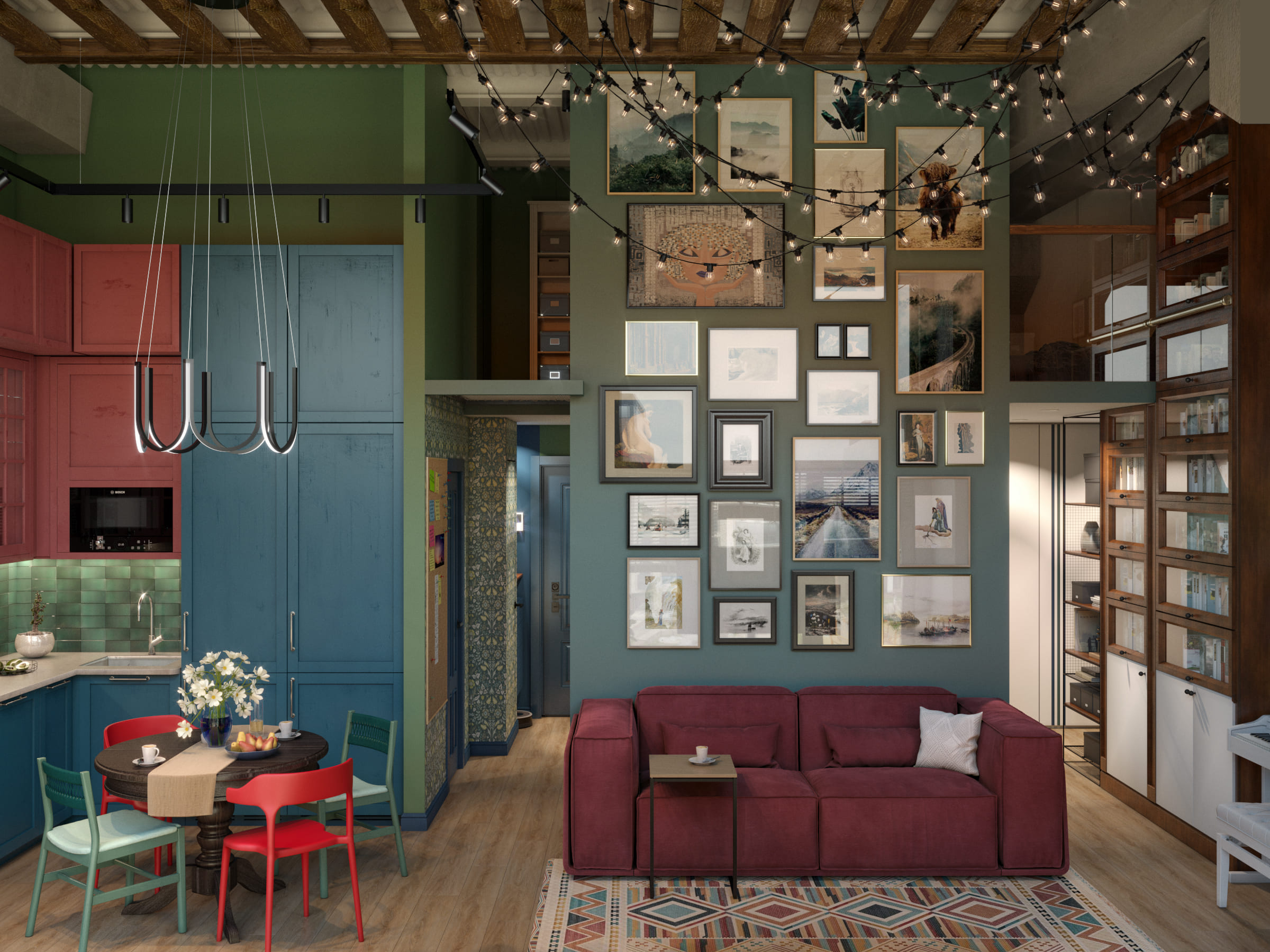 В прихожей — энергичные красные стены, создающие яркое первое впечатление и заряжающие динамикой. Переходя в гостиную-спальню, атмосфера меняется: глубокие зеленые тона дарят ощущение спокойствия и единения с природой.