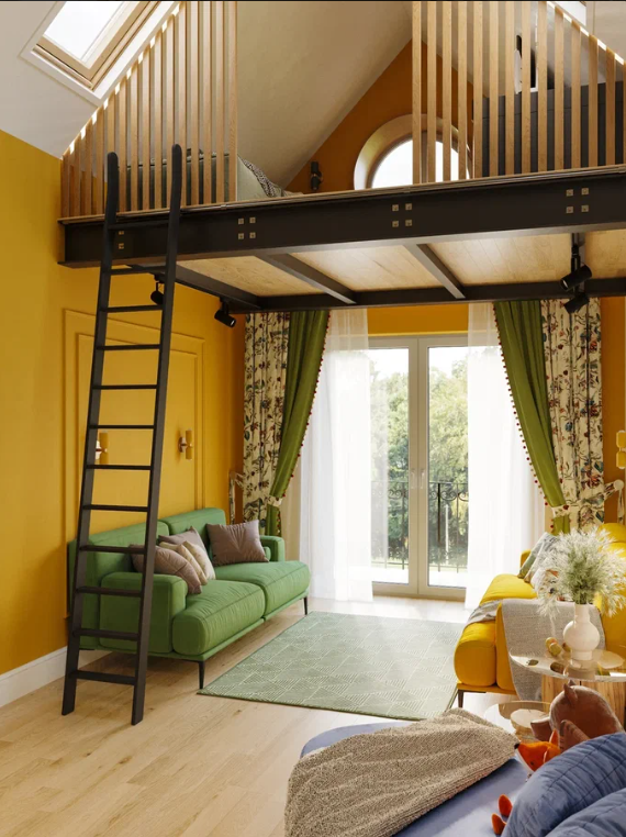 Оживленная квартира с яркими желтыми и горчичными стенами создает теплую, уютную атмосферу. Такие оттенки придают пространству энергию и современность, делая интерьер уютным и эффектным.