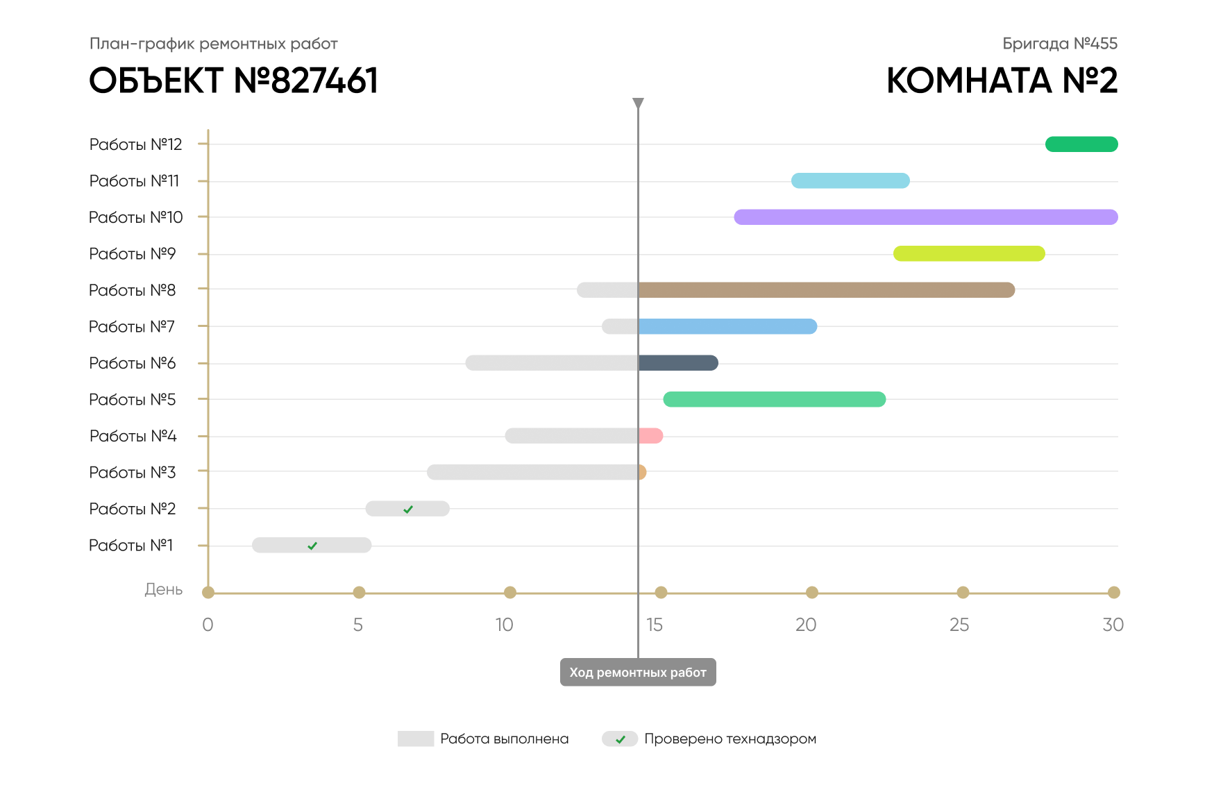 ремонта и ходом работСроки каждого этапа работ указаны в системе, также есть система идентификации прихода мастера на объект и его ухода, выдача и постановка задачи мастеру и другие данные для контроля за работой на объекте