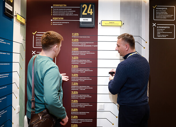 В одном пространстве для вас собраны 156 готовых решений отделки, чтобы вы собрали свой идеальный1 ремонт просто как LEGO за 1 день! Потрогайте каждую текстуру рукой, посмотрите покрытие под разным освещением, и выберите то, что вам нравится и подходит по сроку, стилю, качеству и бюджету. Далее мы повторим в вашей квартире выбранные вами решения четко по графику, строго по технологическим картам и в фиксированном бюджете