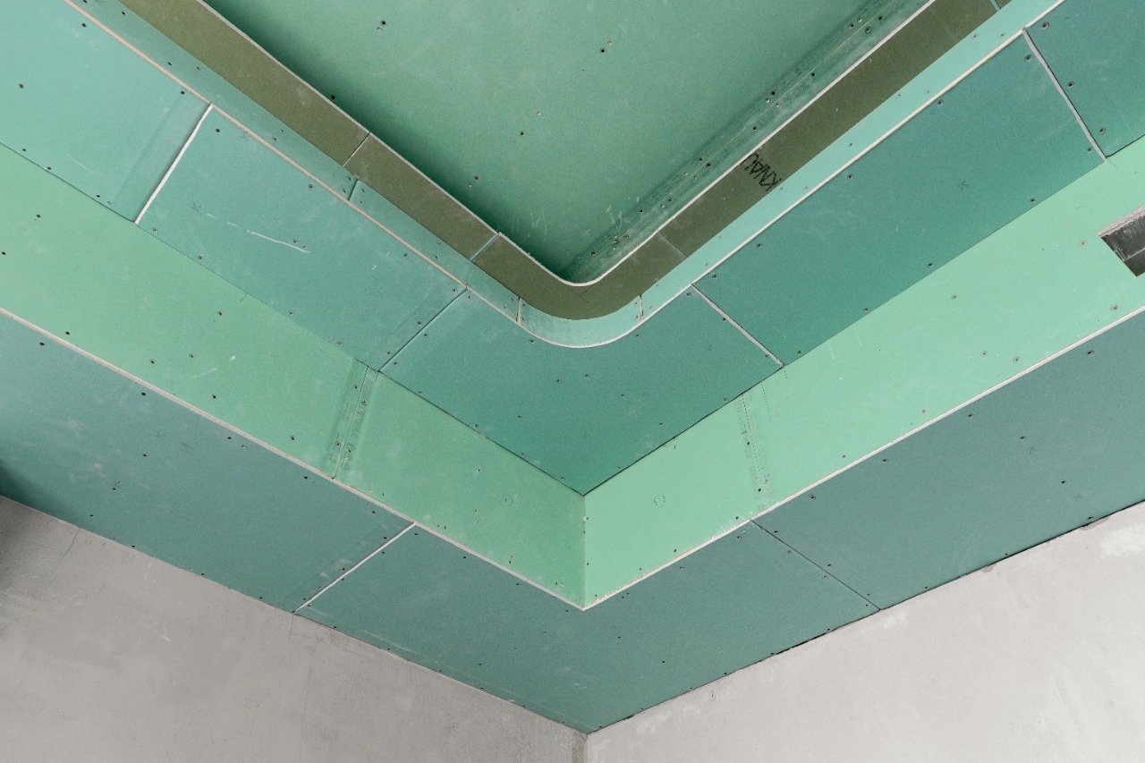 Основа потолка — каркас из классического металлического профиля с ячейкой 40 на 50 — один из самых популярных способов крепления различных строительных материалов — обшивается листами ГКЛв в два слоя. Здесь используются усиления в виде стальных труб для создания дополнительной жесткости под нестандартные конструкции. Вся работа — разметка, изгибы, подгонка — выполняется вручную по индивидуальным чертежам. Иногда сложные конструкции собираются отдельно, после чего крепятся к основному потолку.