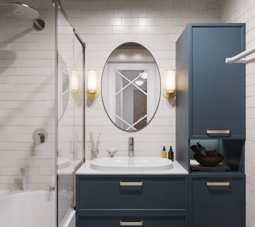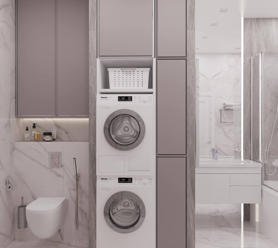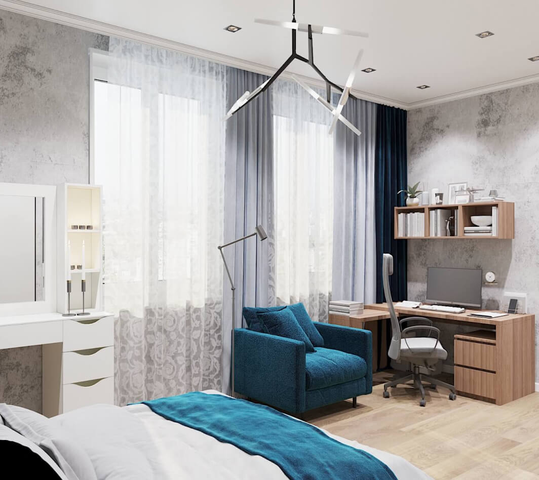 Основу палитры составляют легкие пастельные тона: молочные, пудровые, серые, бежевые, оливковые. Дизайнеры DOMEO умело расставили акценты проекта с помощью ярких деталей – мебели и аксессуаров насыщенного изумрудного, лимонного, фиолетового и синего цвета
