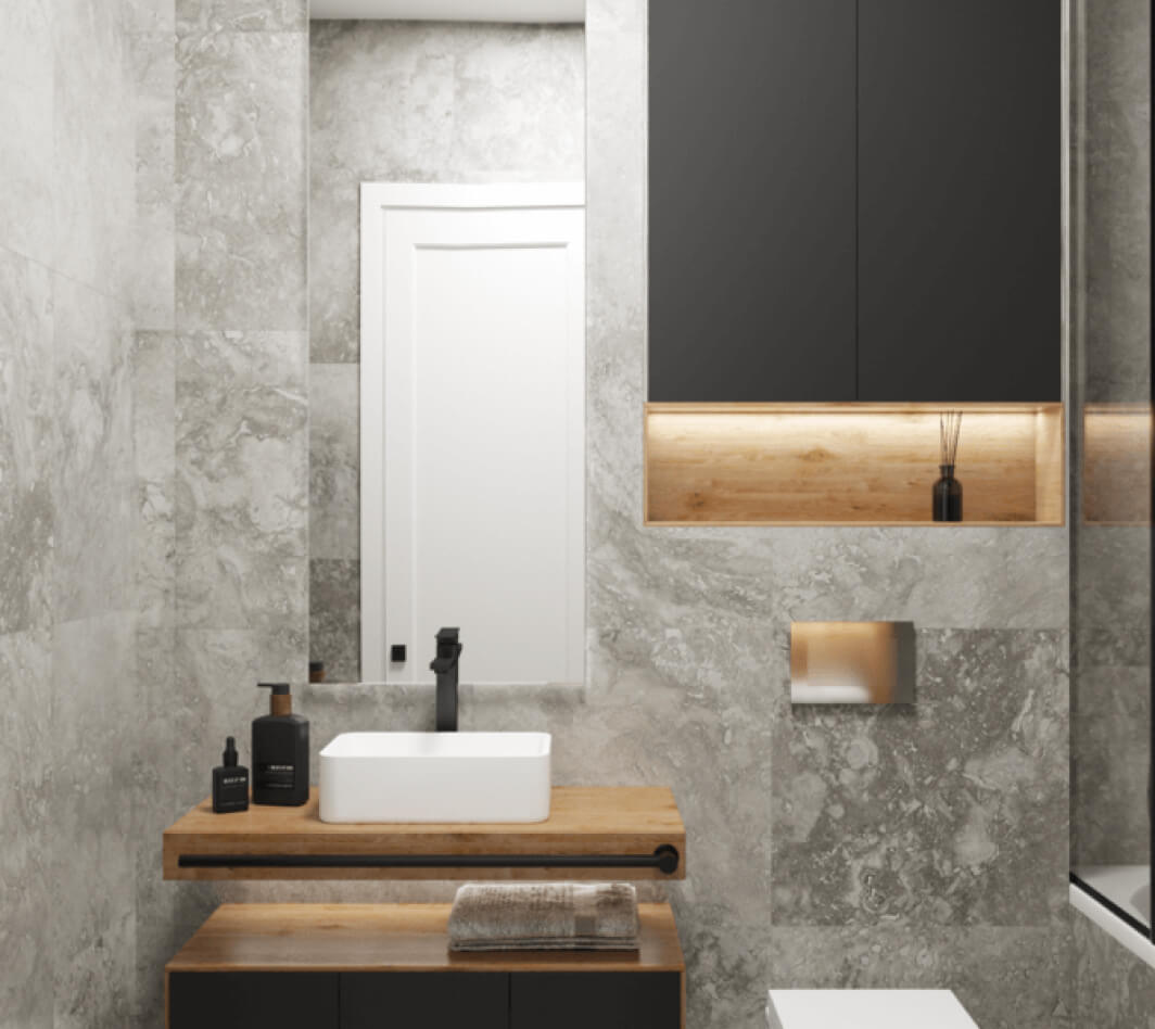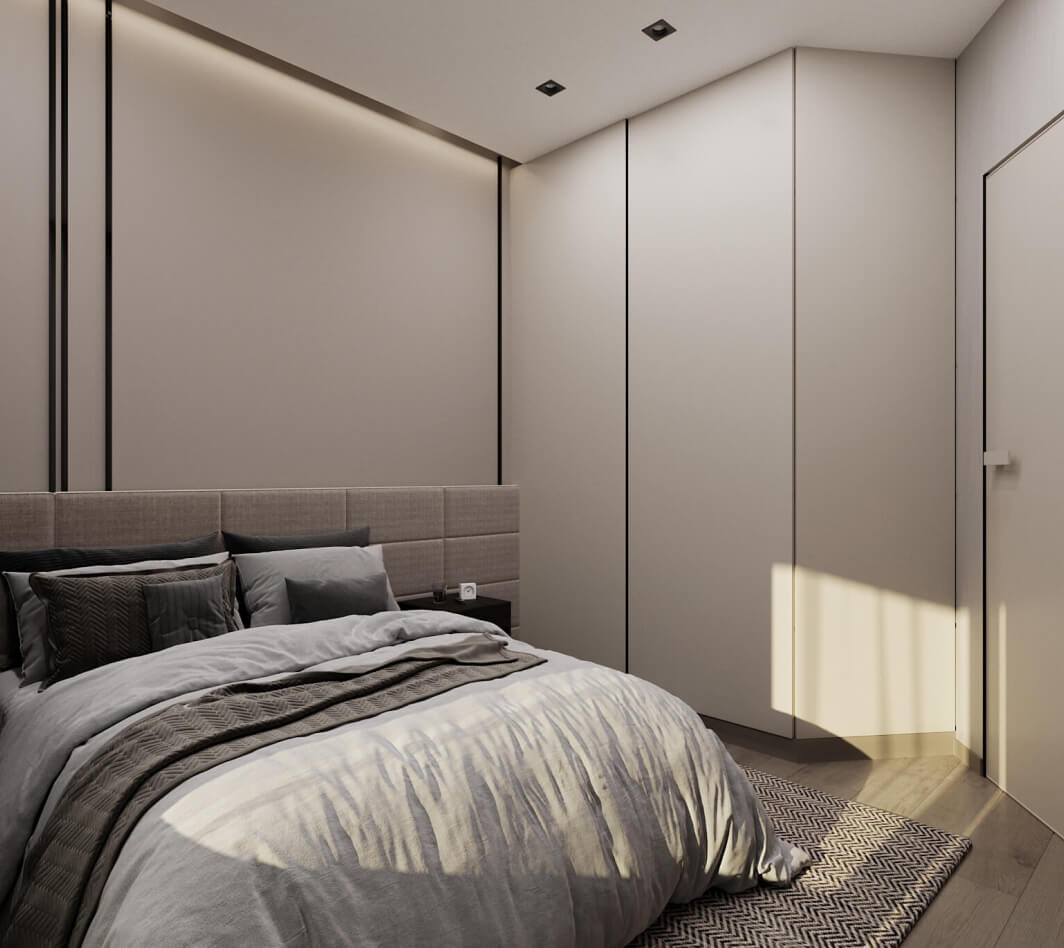 Стиль минимализм один из самых сложных, потому что здесь довольно не просто уравновесить элементы дизайна между собой, не прибегая к каким-то ярким цветам или привлекающим внимание контрастным элементам дизайна. Белая, бежевая, серая гамма – как и просил заказчик. Использование не ярких и активных текстур на полу и стенах — не нагружают пространство, но и не оставляют «плоскими» стены и пол