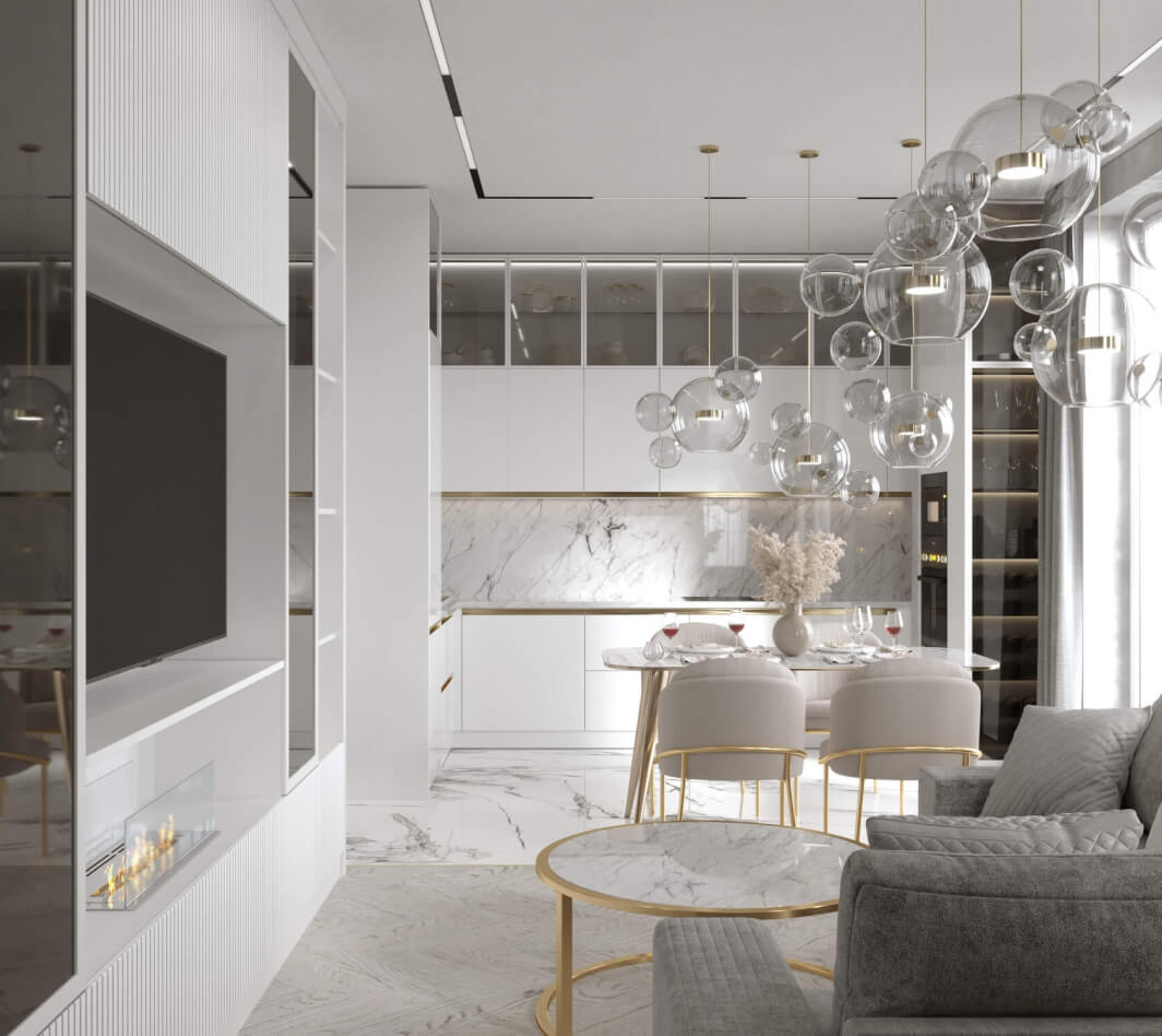 Пространство смело переосмыслено с использованием сдержанных, но ярких контрастных цветов. Слияние стилей, сочетание традиционных классических и современных элементов, контрасты и гармония — вот те приемы, которые позволили замаскировать технические узлы и создать в интерьере уютную и очаровательную атмосферу