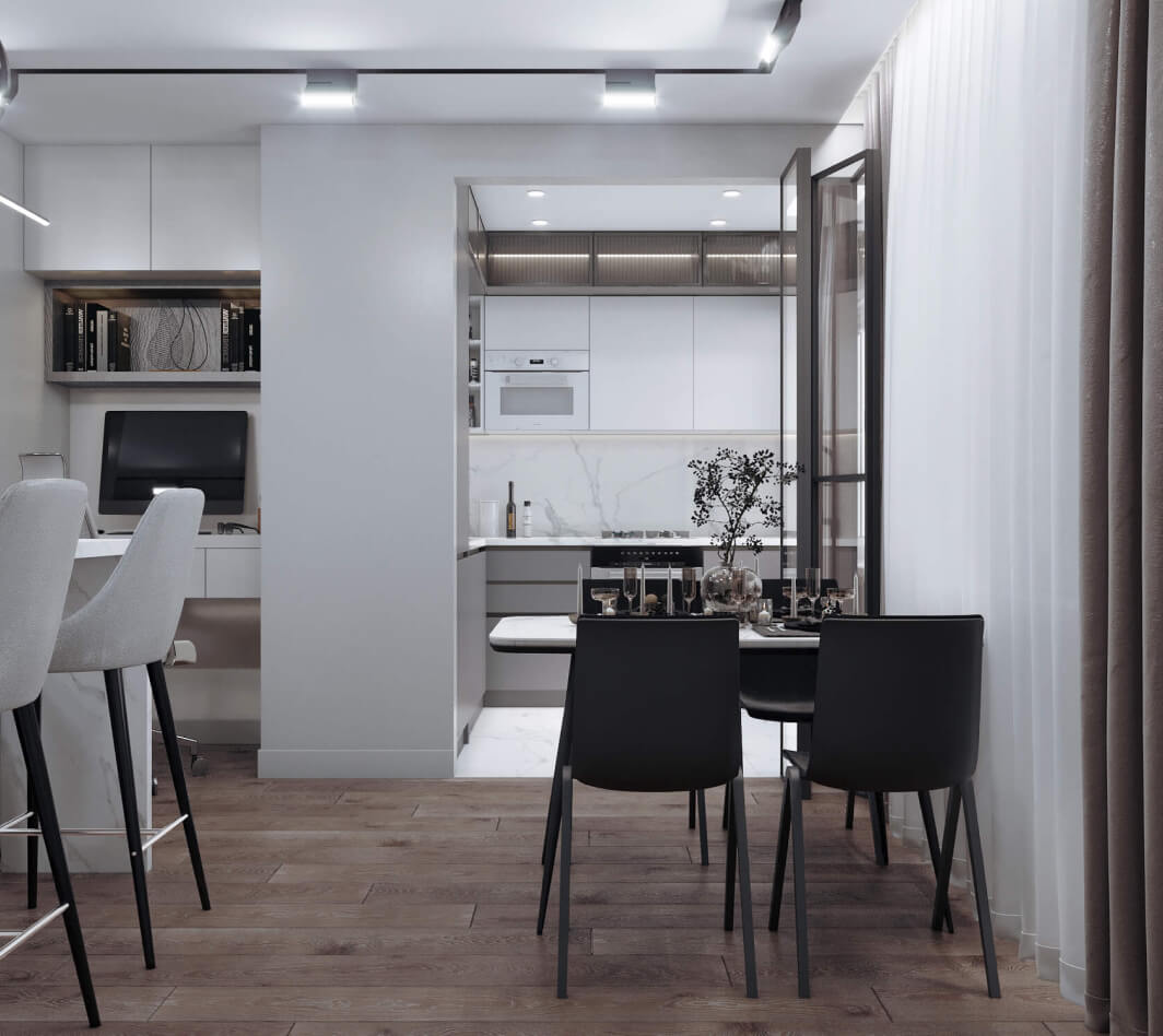 Перед владельцами данной квартиры стояло две важных задачи: во-первых, максимально сэкономить пространство, а во-вторых – не допустить присутствия в помещении вещей, свидетельствующих о том, что их некуда деть. Благодаря огромному опыту нашего дизайнера на этом проекте, мы закрыли эти две задачи на максимум