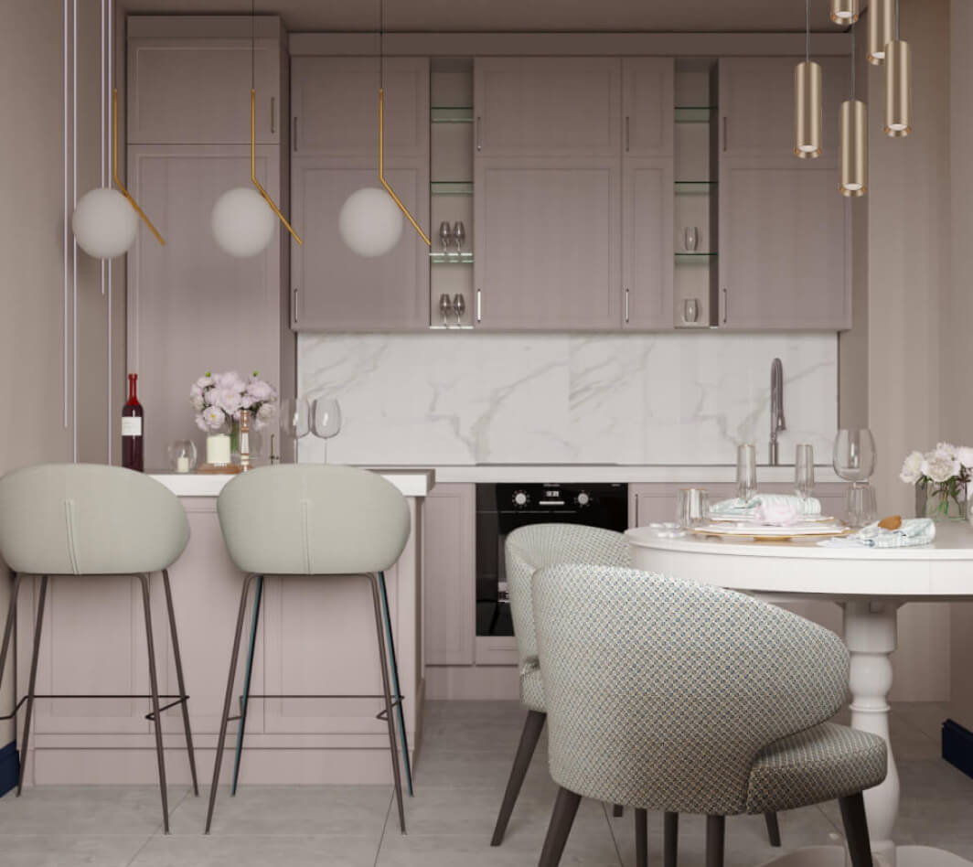 Дизайн квартиры выполнен в современном стиле с элементами минимализма. В отделке преимущественно используются светлые тона – нежно синий и бежевый, акцентом выступают деревянные и мраморные вставки